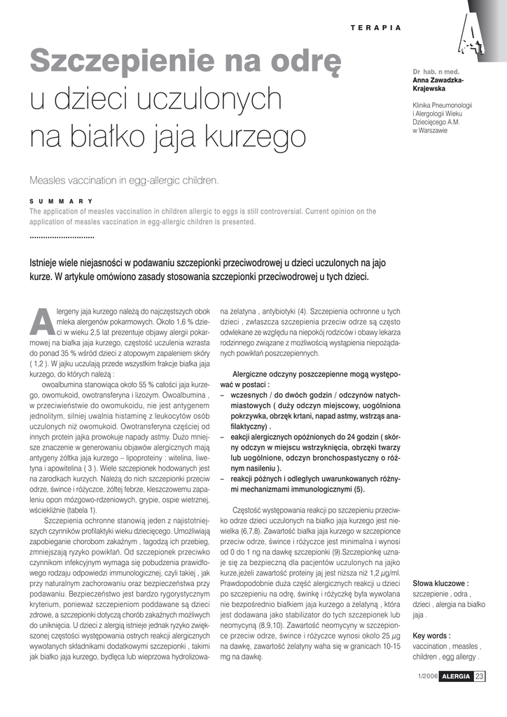 T E R A P I A Szczepienie na odrę u dzieci uczulonych na białko jaja kurzego Dr hab. n med. Anna ZawadzkaKrajewska Klinika Pneumonologii i Alergologii Wieku Dziecięcego A.M. w Warszawie Measles vaccination in egg-allergic children. S U M M A R Y The application of measles vaccination in children allergic to eggs is still controversial. Current opinion on the application of measles vaccination in egg-allergic children is presented. ............................. Istnieje wiele niejasności w podawaniu szczepionki przeciwodrowej u dzieci uczulonych na jajo kurze. W artykule omówiono zasady stosowania szczepionki przeciwodrowej u tych dzieci. A lergeny jaja kurzego należą do najczęstszych obok mleka alergenów pokarmowych. Około 1,6 % dzieci w wieku 2,5 lat prezentuje objawy alergii pokarmowej na białka jaja kurzego, częstość uczulenia wzrasta do ponad 35 % wśród dzieci z atopowym zapaleniem skóry ( 1,2 ). W jajku uczulają przede wszystkim frakcje białka jaja kurzego, do których należą : owoalbumina stanowiąca około 55 % całości jaja kurzego, owomukoid, owotransferyna i lizozym. Owoalbumina , w przeciwieństwie do owomukoidu, nie jest antygenem jednolitym, silniej uwalnia histaminę z leukocytów osób uczulonych niż owomukoid. Owotransferyna częściej od innych protein jajka prowokuje napady astmy. Dużo mniejsze znaczenie w generowaniu objawów alergicznych mają antygeny żółtka jaja kurzego – lipoproteiny : witelina, liwetyna i apowitelina ( 3 ). Wiele szczepionek hodowanych jest na zarodkach kurzych. Należą do nich szczepionki przeciw odrze, śwince i różyczce, żółtej febrze, kleszczowemu zapaleniu opon mózgowo-rdzeniowych, grypie, ospie wietrznej, wściekliźnie (tabela 1). Szczepienia ochronne stanowią jeden z najistotniejszych czynników profilaktyki wieku dziecięcego. Umożliwiają zapobieganie chorobom zakaźnym , łagodzą ich przebieg, zmniejszają ryzyko powikłań. Od szczepionek przeciwko czynnikom infekcyjnym wymaga się pobudzenia prawidłowego rodzaju odpowiedzi immunologicznej, czyli takiej , jak przy naturalnym zachorowaniu oraz bezpieczeństwa przy podawaniu. Bezpieczeństwo jest bardzo rygorystycznym kryterium, ponieważ szczepieniom poddawane są dzieci zdrowe, a szczepionki dotyczą chorób zakaźnych możliwych do uniknięcia. U dzieci z alergią istnieje jednak ryzyko zwiększonej częstości występowania ostrych reakcji alergicznych wywołanych składnikami dodatkowymi szczepionki , takimi jak białko jaja kurzego, bydlęca lub wieprzowa hydrolizowa- na żelatyna , antybiotyki (4). Szczepienia ochronne u tych dzieci , zwłaszcza szczepienia przeciw odrze są często odwlekane ze względu na niepokój rodziców i obawy lekarza rodzinnego związane z możliwością wystąpienia niepożądanych powikłań poszczepiennych. Alergiczne odczyny poszczepienne mogą występować w postaci : – wczesnych / do dwóch godzin / odczynów natychmiastowych ( duży odczyn miejscowy, uogólniona pokrzywka, obrzęk krtani, napad astmy, wstrząs anafilaktyczny) . – eakcji alergicznych opóźnionych do 24 godzin ( skórny odczyn w miejscu wstrzyknięcia, obrzęki twarzy lub uogólnione, odczyn bronchospastyczny o różnym nasileniu ). – reakcji późnych i odległych uwarunkowanych różnymi mechanizmami immunologicznymi (5). Częstość występowania reakcji po szczepieniu przeciwko odrze dzieci uczulonych na białko jaja kurzego jest niewielka (6,7,8). Zawartość białka jaja kurzego w szczepionce przeciw odrze, śwince i różyczce jest minimalna i wynosi od 0 do 1 ng na dawkę szczepionki (9).Szczepionkę uznaje się za bezpieczną dla pacjentów uczulonych na jajko kurze,jeżeli zawartość proteiny jaj jest niższa niż 1,2 µg/ml. Prawdopodobnie duża część alergicznych reakcji u dzieci po szczepieniu na odrę, świnkę i różyczkę była wywołana nie bezpośrednio białkiem jaja kurzego a żelatyną , która jest dodawana jako stabilizator do tych szczepionek lub neomycyną (8,9,10). Zawartość neomycyny w szczepionce przeciw odrze, śwince i różyczce wynosi około 25 µg na dawkę, zawartość żelatyny waha się w granicach 10-15 mg na dawkę. Słowa kluczowe : szczepienie , odra , dzieci , alergia na białko jaja . Key words : vaccination , measles , children , egg allergy . 1/2006 ALERGIA 23 T E R A P I A 1 TABELA 24 ALERGIA 1/2006 Szczepionki z hodowli wirusów na zarodkach kurzych nazwa szczepionki antygen stabilizator antybiotyk jajo kurze ROUVAX Żywy atenuowany wirus odry neomycyna hodowla na zarodkach kurzych TRIMOVAX R.O.R. Żywy atenuowany szczep Schwarz odry. Żywy atenuowany szczep U rabe wirusa świnki. Żywy atenuowany szczep Wistar wirusa różyczki. PRIORIX Żywy atenuowany szczep Schwarz odry. Żywy atenuowany szczep RIT wirusa świnki. Żywy atenuowany szczep Wistar wirusa różyczki. laktoza neomycyna wirus odry i świnki – hodowla na zarodkach kurzych M-M-R II wirus odry , świnki, różyczki hydrolizat żelatyny, sorbitol neomycyna wirus odry i świnki na zarodkach kurzych MUMPSVAX wirus świnki hydrolizat żelatyny , sorbitol neomycyna hodowla na zarodkach kurzych VAXIGRIP rozszczepione wiriony zawierające antygeny wirusów grypy neomycyna hodowla na zarodkach kurzych VAXIGRIP JUNIOR rozszczepione wiriony zawierające antygeny wirusów grypy neomycyna hodowla na zarodkach kurzych BEGRIVAC antygeny wirusów grypy polimyxyna B hodowla na zarodkach kurzych FLUARIX rozszczepione wiriony zawierające antygeny wirusów grypy ENCEPUR K inaktywowany wirus K 23 kleszczowego zapalenia opon mózgowo-rdzeniowych i mózgu sacharoza neomycyna , chlorotetracyklina , gentamycyna hodowla na fibroblastach kurzych ENCEPUR adult inaktywowany wirus K 23 kleszczowego zapalenia opon mózgowo-rdzeniowych i mózgu sacharoza neomycyna , chlorotetracyklina , gentamycyna hodowla na fibroblastach kurzych hodowla na zarodkach kurzych sacharoza, sześciowodny chlorek magnezu hodowla na zarodkach kurzych T E R A P I A Mimo, że