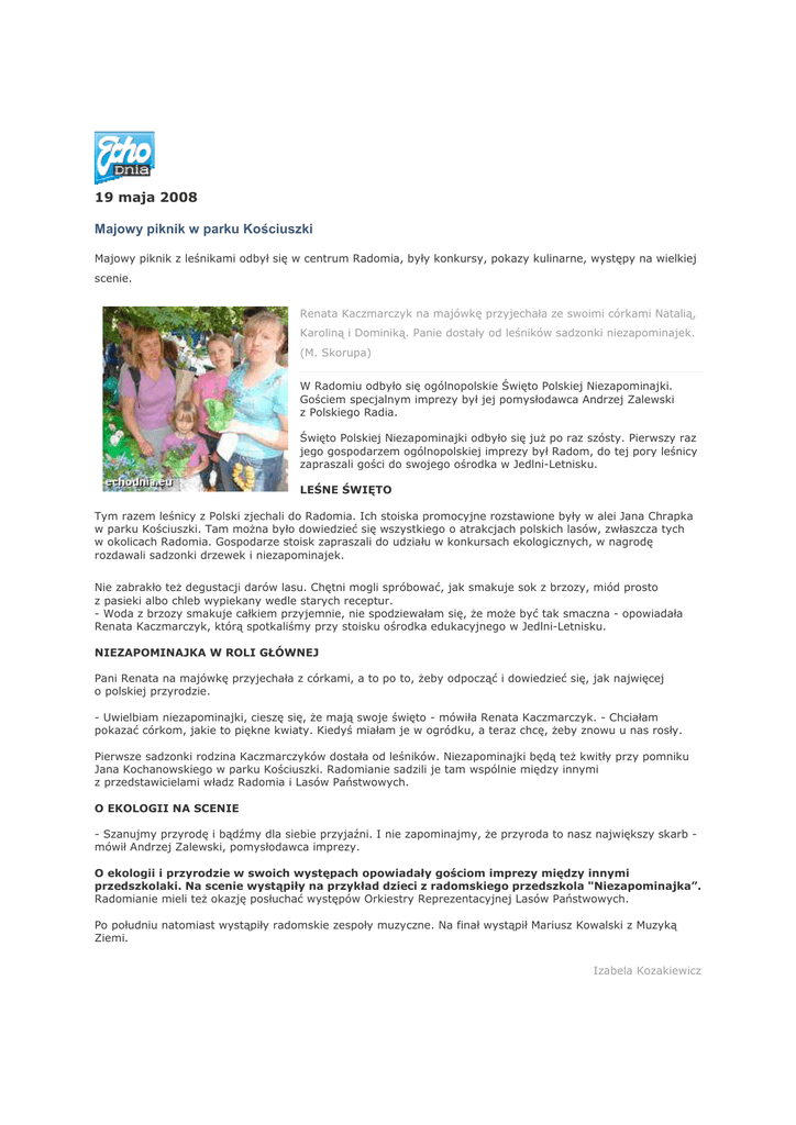 19 maja 2008 Majowy piknik w parku Kościuszki Majowy piknik z leśnikami odbył się w centrum Radomia, były konkursy, pokazy kulinarne, występy na wielkiej scenie. Renata Kaczmarczyk na majówkę przyjechała ze swoimi córkami Natalią, Karoliną i Dominiką. Panie dostały od leśników sadzonki niezapominajek. (M. Skorupa) W Radomiu odbyło się ogólnopolskie Święto Polskiej Niezapominajki. Gościem specjalnym imprezy był jej pomysłodawca Andrzej Zalewski z Polskiego Radia. Święto Polskiej Niezapominajki odbyło się juŜ po raz szósty. Pierwszy raz jego gospodarzem ogólnopolskiej imprezy był Radom, do tej pory leśnicy zapraszali gości do swojego ośrodka w Jedlni-Letnisku. LEŚNE ŚWIĘTO Tym razem leśnicy z Polski zjechali do Radomia. Ich stoiska promocyjne rozstawione były w alei Jana Chrapka w parku Kościuszki. Tam moŜna było dowiedzieć się wszystkiego o atrakcjach polskich lasów, zwłaszcza tych w okolicach Radomia. Gospodarze stoisk zapraszali do udziału w konkursach ekologicznych, w nagrodę rozdawali sadzonki drzewek i niezapominajek. Nie zabrakło teŜ degustacji darów lasu. Chętni mogli spróbować, jak smakuje sok z brzozy, miód prosto z pasieki albo chleb wypiekany wedle starych receptur. - Woda z brzozy smakuje całkiem przyjemnie, nie spodziewałam się, Ŝe moŜe być tak smaczna - opowiadała Renata Kaczmarczyk, którą spotkaliśmy przy stoisku ośrodka edukacyjnego w Jedlni-Letnisku. NIEZAPOMINAJKA W ROLI GŁÓWNEJ Pani Renata na majówkę przyjechała z córkami, a to po to, Ŝeby odpocząć i dowiedzieć się, jak najwięcej o polskiej przyrodzie. - Uwielbiam niezapominajki, cieszę się, Ŝe mają swoje święto - mówiła Renata Kaczmarczyk. - Chciałam pokazać córkom, jakie to piękne kwiaty. Kiedyś miałam je w ogródku, a teraz chcę, Ŝeby znowu u nas rosły. Pierwsze sadzonki rodzina Kaczmarczyków dostała od leśników. Niezapominajki będą teŜ kwitły przy pomniku Jana Kochanowskiego w parku Kościuszki. Radomianie sadzili je tam wspólnie między innymi z przedstawicielami władz Radomia i Lasów Państwowych. O EKOLOGII NA SCENIE - Szanujmy przyrodę i bądźmy dla siebie przyjaźni. I nie zapominajmy, Ŝe przyroda to nasz największy skarb mówił Andrzej Zalewski, pomysłodawca imprezy. O ekologii i przyrodzie w swoich występach opowiadały gościom imprezy między innymi przedszkolaki. Na scenie wystąpiły na przykład dzieci z radomskiego przedszkola "Niezapominajka”. Radomianie mieli teŜ okazję posłuchać występów Orkiestry Reprezentacyjnej Lasów Państwowych. Po południu natomiast wystąpiły radomskie zespoły muzyczne. Na finał wystąpił Mariusz Kowalski z Muzyką Ziemi. Izabela Kozakiewicz
