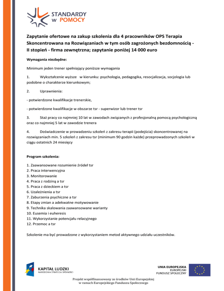 Zapytanie ofertowe na zakup szkolenia dla 4 pracowników OPS Terapia Skoncentrowana na Rozwiązaniach w tym osób zagrożonych bezdomnością II stopień - firma zewnętrzna; zapytanie poniżej 14 000 euro Wymagania niezbędne: Minimum jeden trener spełniający poniższe wymagania 1. Wykształcenie wyższe w kierunku: psychologia, pedagogika, resocjalizacja, socjologia lub podobne o charakterze kierunkowym; 2. Uprawnienia: - potwierdzone kwalifikacje trenerskie, - potwierdzone kwalifikacje w obszarze tsr - superwizor lub trener tsr 3. Staż pracy co najmniej 10 lat w zawodach związanych z profesjonalną pomocą psychologiczną oraz co najmniej 5 lat w zawodzie trenera 4. Doświadczenie w prowadzeniu szkoleń z zakresu terapii (podejścia) skoncentrowanej na rozwiązaniach min. 5 szkoleń z zakresu tsr (minimum 90 godzin każde) przeprowadzonych szkoleń w ciągu ostatnich 24 miesięcy Program szkolenia: 1. Zaawansowane rozumienie źródeł tsr 2. Praca interwencyjna 3. Monitorowanie 4. Praca z rodziną a tsr 5. Praca z dzieckiem a tsr 6. Uzależnienia a tsr 7. Zaburzenia psychiczne a tsr 8. Etapy zmian a adekwatne motywowanie 9. Technika skalowania zaawansowane warianty 10. Eusemia i euheresis 11. Wykorzystanie potencjału relacyjnego 12. Przemoc a tsr Szkolenie ma być prowadzone z wykorzystaniem metod aktywnego udziału uczestników. Projekt współfinansowany ze środków Unii Europejskiej w ramach Europejskiego Funduszu Społecznego Szkolenie będzie odbywało się na terenie Dzielnicy Ursus m.st. Warszawy w Ośrodku Pomocy Społecznej Dz. Ursus przy Pl. Czerwca 1976 Nr 1 lub w Kamiliańskiej Misji Pomocy Społecznej, ul. Traktorzystów 26, Warszawa Termin szkolenia oraz godziny szkolenia do ustalenia z koordynatorem projektu. Zamawiający dopuszcza realizację warsztatów w weekendy, po każdorazowym uzgodnieniu z koordynatorem projektu. Wykonawca przedstawi cenę za przeprowadzenie szkolenia biorąc pod uwagę następujące wytyczne: Cena szkolenia zawiera: a. Kosztem Wykonawcy jest także przygotowanie Serwisu kawowego, czyli: kawa, herbata, woda, sok, ciastka kruche, cukier, mleko do kawy oraz zabezpieczenie naczyń jednorazowych wyposażenie sali stosownie do prowadzonych zajęć: tablica, flipchart + papier, markery narzędzia niezbędne do realizacji warsztatu np. sprzęt audio, komputer etc. Materiały szkoleniowe: książki, artykuły, papier do flipchartu, notatniki, długopisy Obsługi szkolenia Zakres czynności: 1. Poprowadzenie cyklu 15 dniowego (łącznie 150 godz. dydaktycznych) szkoleń dla grup 4 osobowej – w ramach projektu „Ursusowskie partnerstwo drogą do lepszego życia”. 2. Opracowanie programu szkolenia mającego na celu poszerzenie wiedzy i uczestników szkolenia. 3. Przygotowanie materiałów. 5. Przedstawienie merytorycznej wiedzy. 6. Prowadzenie dokumentacji zgodnie z wymogami projektu. 7. Współpraca z koordynatorem projektu. 8. Realizacja: czerwiec- lipiec 2013r. 9. Wystawienie zaświadczeń uczestnikom szkolenia z obowiązującymi w projekcie logo. Projekt współfinansowany ze środków Unii Europejskiej w ramach Europejskiego Funduszu Społecznego Wymagane dokumenty 1) Cv 2) Dokumenty poświadczające wykształcenie, staż pracy oraz inne dodatkowe dokumenty o posiadanych uprawnieniach, doświadczeniu zawodowym, kwalifikacjach i umiejętnościach 3) Oświadczenie o zgodzie na przetwarzanie danych osobowych 4) Program szkolenia 5) Formularz ofertowy wypełniony przez osobę upoważnioną do reprezentowania firmy stanowiący zał. nr 1 do ogłoszenia. Dokumenty w zamkniętej kopercie należy składać do dnia 17.06.2013 do godz. 10,00 w pokoju nr. 14; Ośrodka Pomocy Społecznej– Plac Czerwca 1976r Nr 1, 02-495 Warszawa. Osoba do kontaktów – Edyta Kowalczyk tel. 22 478 41 14; 514 361 555 Projekt współfinansowany ze środków Unii Europejskiej w ramach Europejskiego Funduszu Społecznego
