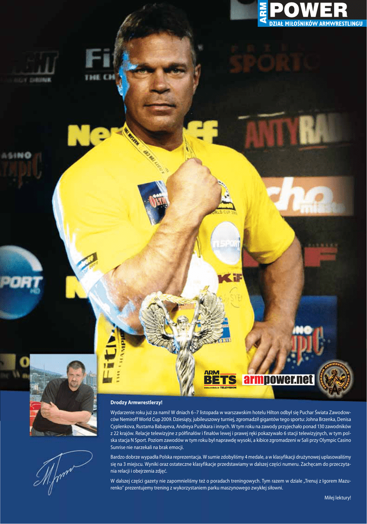 Drodzy Armwrestlerzy! Wydarzenie roku już za nami! W dniach 6 –7 listopada w warszawskim hotelu Hilton odbył się Puchar Świata Zawodowców Nemiroff World Cup 2009. Dziesiąty, jubileuszowy turniej, zgromadził gigantów tego sportu: Johna Brzenka, Denisa Cyplenkova, Rustama Babayeva, Andreya Pushkara i innych. W tym roku na zawody przyjechało ponad 130 zawodników z 22 krajów. Relacje telewizyjne z półfinałów i finałów lewej i prawej ręki pokazywało 6 stacji telewizyjnych, w tym polska stacja N Sport. Poziom zawodów w tym roku był naprawdę wysoki, a kibice zgromadzeni w Sali przy Olympic Casino Sunrise nie narzekali na brak emocji. Bardzo dobrze wypadła Polska reprezentacja. W sumie zdobyliśmy 4 medale, a w klasyfikacji drużynowej uplasowaliśmy się na 3 miejscu. Wyniki oraz ostateczne klasyfikacje przedstawiamy w dalszej części numeru. Zachęcam do przeczytania relacji i obejrzenia zdjęć. W dalszej części gazety nie zapomnieliśmy też o poradach treningowych. Tym razem w dziale „Trenuj z Igorem Mazurenko” prezentujemy trening z wykorzystaniem parku maszynowego zwykłej siłowni. Miłej lektury! John Brzenk USA vs Rustam Babayev Ukraina NEMIROFF WORLD CUP 2009 ZAWODOWCY BYLI W WARSZAWIE C oroczny Puchar Świata Zawodowców w Armwrestlingu organizowany na samym początku w Gdyni, teraz od kilku lat w Warszawie, jest chyba największą imprezą w siłowaniu na ręce dla zawodowych siłaczy. Tutaj bowiem nie ma przypadkowych zawodników. Do startu stają sportowcy z tytułami mistrza swojego kraju. Ponad 130 zawodników z 22 krajów, ponad 500 pojedynków – wszystko to rozegrało się 6–7 listopada w warszawskim hotelu Hilton w ramach turnieju o Puchar Złotego Tura – VII Puchar Świata Zawodowców Nemiroff Word Cup 2009. Większość uczestników to mistrzowie Europy, świata i medaliści innych turniejów rangi międzynarodowej. Wśród nich oczywiście polscy, najlepsi zawodnicy wyselekcjonowani poprzez uzyskane osiągnięcia na arenie krajowej i międzynarodowej. Igor Mazurenko – organizator imprezy: Już od dziesięciu lat organizuję turniej Złotego Tura.. Będąc na wielu imprezach w różnych za- KiF NR 12 / 2009 kątkach świata spotykałem się z różnymi trudnościami organizacyjnymi. Tym razem mogę śmiało powiedzieć, że tegoroczny turniej Złoty Tur Cup był w miarę spokojny. Do tego, tak jak to powinno być w każdej dyscyplinie sportu miał największą ilość fanów. Chce podziękować wszystkim pracownikom i współpracownikom Mazurenko Armwrestling Promotion, jak również sponsorom, gospodarzowi zawodów – Olympic Casino Sunrise oraz mediom (a szczególnie partnerowi telewizyjnemu N Sport), które na tę właśnie dyscyplinę sportu zwracają coraz większą uwagę. Dzięki nim impreza była dobrze nagłośniona, a chętnych do oglądania na żywo po raz pierwszy było więcej niż zaproszeń. Wiernych kibiców serdecznie zapraszam na inne nasze wydarzenia, na których z całą pewnością nie zabraknie emocji i adrenaliny, tak jak to było na tegorocznym Złotym Turze. Mężczyźni startowali w 7 kategoriach wagowych: 63 kg, 70 kg, 78 kg, 86 kg, 95 kg, +95 kg i kategorii Open. Walki kobiet odbyły się tylko w jednej kategorii – do 65 kg. W piątek odbywały się walki na lewą rękę, w sobotę – na prawą, wszystkie walki w systemie do dwóch przegranych. Polskę reprezentowało 22 zawodników. Pula nagród w tegorocznej edycji wyniosła 22 tys. USD. Cztery medale dla Polski W rywalizacji ręki lewej srebrny medal w kategorii 63 kg wywalczył Mateusz Wyrwa z Niska, natomiast w kategorii 95 kg Dariusz Muszczak z Myszkowa. Pierwszego dnia Mateusz oparł się sile rosyjskiego mistrza świata – Murata Barłokowa, natomiast Darek w walce finałowej nie miał szans z arcymistrzem Johnem Brzenkiem z USA. Obaj nasi zawodnicy dobrze wystartowali również w rywalizacji ręki prawej. Co prawda nie znaleźli się w strefie medalowej, ale dosłownie otarli się o podium (Mateusz uplasował się na miejscu 4., Dariusz natomiast na miejscu 5.). ARMPOWER: NEMIROFF WORLD CUP 2009 83 Z lewej Piotr Bartosiewicz Choszczno Z prawej Mateusz Wyrwa Nisko Z prawej brązowy medalista +95 kg Grzegorz Nowak z Gdyni John Brzenk USA vs Dariusz Muszczak Polska Igor Mazurenko: Mateuszowi, aby być na pierwszym miejscu, zabrakło tylko i wyłącznie doświadczenia i obycia przy międzynarodowym stole. Pokonać rosyjskiego mistrza świata – Murata Barłokowa jest bardzo trudno. Niejednokrotnie nie udawało się to bardziej doświadczonym zawodnikom niż Mateusz. A jemu jednak to się udało. Szkoda tylko, że nie było mnie przy nim, gdy był drugi rozstrzygający pojedynek finałowy. Gdybym podpowiedział Mateuszowi, jak ma walczyć, z całą pewnością mogłoby być złoto w kategorii 63 kg.Mając ogromną przewagę nad Rosjaninem techniką na górę Mateusz zastosował niespodziewanie hak w drugim finale.. Taka metoda walki niestety doprowadziła zawodnika z Niska do przegranej. A szkoda. Jeżeli chodzi o start Dariusza Muszczaka na rękę lewą, to trzeba przyznać, że Darek poszedł w ślady zeszłorocznego zwycięzcy – Lucjana Fudały. Zarówno on, jak i Lucjan udowodnili, że ta właśnie kategoria może należeć do polskich zawodników. Chociaż Darek zajął drugie miejsce, to należą mu się wielkie brawa oraz podziękowania. W finale nie miał szans z Johnem Brzenkiem. Już w eliminacjach bowiem widać było, że John od zeszłego roku znacznie poprawił swoją lewą rękę. Wielki sukces Grześka i Piotra Nie gorzej poszło naszym reprezentantom na rękę prawą. Drugiego dnia zawodów zdobyliśmy kolejne dwa medale. Piotr Bartosiewicz z Choszczna w kategorii do 86 kg uplasował się na miejscu drugim. Niestety nie był w stanie wygrać finałowego pojedynku z kolejnym arcymistrzem, kilkukrotnym mistrzem świata i Europy – Rustamem Babajewem. Kolejny medal dla kraju zdobył najsilniejszy Polak ręki prawej roku 2008 (tytu