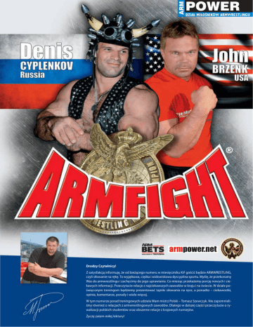 Drodzy Czytelnicy! Z satysfakcją informuję, że od bieżącego numeru w miesięczniku KiF gościć będzie ARMWRESTLING, czyli siłowanie na rękę. To wyjątkowa, ciężka i widowiskowa dyscyplina sportu. Myślę, że przekonamy Was do armwrestlingu i zachęcimy do jego uprawiania. Co miesiąc przekażemy porcję nowych i ciekawych informacji. Przeczytacie relacje z najciekawszych zawodów w kraju i na świecie. W dziale poświęconym treningom będziemy prezentować tajniki siłowania na ręce, a ponadto – ciekawostki, opinie, komentarze, porady i wiele więcej. W tym numerze porad treningowych udziela Wam mistrz Polski – Tomasz Szewczyk. Nie zapomnieliśmy również o relacjach z armwrestlingowych zawodów. Dlatego w dalszej części przeczytacie o rywalizacji polskich studentów oraz obszerne relacje z krajowych turniejów. Życzę zatem miłej lektury! I AKADEMICKI PUCHAR W ARMWRESTLINGU P o raz pierwszy w Polsce byliśmy świadkami ogólnopolskiej akademickiej rywalizacji w siłowaniu na ręce. 8 maja 2009 r. na terenie Akademii Wychowania Fizycznego i Sportu w Gdańsku przyjechała sama czołówka polskich armwrestlingowych studentów, by walczyć w „I Akademickim Pucharze Polski w Armwrestlingu”. Nie zabrakło zarówno gospodarzy, czyli zawodników z północnej części Polski, jak i sportowców z innych części kraju. A wszystko to za sprawą organizatorów, czyli Federacji Armwrestling Polska oraz Rady Samorządu Studenckiego AWFiS Gdańsk. Zawodnicy rywalizowali na lewą i na prawą rękę w trzech głównych kategoriach kobiet (do 55 kg, do 65 kg, +65 kg) oraz w pięciu kategoriach mężczyzn (do 60 kg, do 70 kg, do 80 kg, do 90 kg, +90 kg). Cała impreza zakończyła się prestiżową kategorią open dla studentów zrzeszonych w Akademickim Związku Sportowym. Jak na pierwsze tego typu zawody, liczba sportowców była znaczna. Do boju o tytuł najlepszego studenta roku 2009 stanęło ponad Dawid Groch vs Tomasz Podgórski Z lewej: Piotr Szczerba, Koniecpol Z prawej: Małgorzata Mielczarek, Jaworzno KiF NR 6 / 2009 Z lewej: Tomasz Piotrowicz, Gdynia 30 armwrestlerów. Nie zabrakło znanych nazwisk z areny polskiego siłowania na ręce, takich jak Tomasz Szewczyk, Dariusz Muszczak, Piotr Szczerba, Dariusz i Dawid Grochowie czy Maciej Gralak. Oczywiście, pojawiło się kilkoro nowych, ale już – jak pokazała rywalizacja – bardzo utalentowanych sportowców. O samych walkach można by było pisać wiele, na uwagę bowiem zasługują wszyscy zawodnicy. Pojedynki były naprawdę na miarę światowej rywalizacji, wspaniałe i długie. Żaden z uczestników nie oddawał łatwo ręki. Nie sposób opisać wszystkich walk, ale z całą pewnością na wielkie brawa zasługują medaliści poszczególnych kategorii wagowych. Pierwsze miejsca na podium zajęli mistrzowie Polski, czyli zawodnicy znani z areny polskiego i światowego siłowania na ręce. Wśród kobiet złote krążki lewej i prawej ręki wywalczyły sobie: w kat. do 55 kg Małgorzata Mielczarek (WSB Dąbrowa Górnicza) oraz w kat. +65 kg Aleksandra Lewandowska (Akademia Morska Gdynia), prócz tego zajęły one dwa pierwsze miejsca w klasyfikacji open AZS (Aleksandra pierwsze, Małgosia – drugie lewej i prawej ręki). Wśród panów: Maciej Gralak (WSPiZ) – I m. w kat. 60 kg lewej i prawej ręki, Mariusz Podgórski (WSEiZ) – I m. w kat. do 70 kg, Tomasz Szewczyk (WSI Łódź) – I m. w kat. do 80 kg, Sebastian Winiarski (AWF Biała Podlaska) – I m. w kat. do 90 kg na lewą oraz II m. na prawą, czy też Piotr Szczerba (Koniecpol) – I m. w kat. do 90 kg na prawą oraz II m. na lewą. Jednak największy suksces odniósł Dariusz Muszczak z Uniwersytetu Śląskiego, który nie dość, że zwyciężył swoją kategorię wagową w rywalizacji ręki lewej i prawej (+95 kg), to jeszcze zdobył dwa złote medale w klasyfikacji open AZS. Nasze gratulacje! Paweł Podlewski Wiele dyscyplin sportu znalazło swoje miejsce w rodzinie akademickiej. Do tej pory taka dyscyplina sportu jak siłowanie na ręce nie miała szans przebicia. Niestety, mimo jej popularności, w Polsce do niedawna nie było żadnej wyraźnej struktury, która byłaby w stanie podołać temu zadaniu od strony merytorycznej i organizacyjnej. Problem leżał w tym, że brak było obowiązujących powszechnie zasad i przepisów. Dzięki Federacji Armwrestling Polska rywalizacja studentów zaczęła się odbywać na zasadach ogólnoświatowych. Dzięki współpracy z Radą Samorządu Studentów AWFiS w Gdańsku mieliśmy możliwość zorganizować pierwsze profesjonalne zawody pod nazwą I Akademicki Puchar Polski w Armwrestlingu – powiedział po pucharze prezes FAP Igor Mazurenko. I dodał: – Ku wielkiemu zdziwieniu, oprócz samych startujących zawodników Akademicki Puchar Polski zgromadził wielu widzów. Zainteresowanie armwrestlingiem było spore. My z pewnością możemy powiedzieć, że w kolejnych latach ta dyscyplina sportu będzie rozwijać się bardzo dynamicznie. Podczas pierwszego pucharu w Gdańsku widzieliśmy studentów z całego kraju. Przyjechali zawodnicy z całej Polski. Wszyscy uczestnicy siłowali się według przepisów WAF na specjalnych, certyfikowanych stołach armwrestlingowych, a poziom sportowy był naprawdę wysoki. ARMPOWER: Z KRAJU 93 MISTRZOSTWA STARGARDU SZCZECIŃSKIEGO S targard Szczeciński po raz drugi gościł armwrestlerów. 1 maja br. pod patronatem Prezydenta Stargardu Szczecińskiego, Sławomira Pajora, i przy współorganizacji choszczeńskich przedstawicieli FAP zostały rozegrane II Mistrzostwa Stargardu Szczecińskiego w Siłowaniu na Ręce o Puchar Prezydenta Miasta. Do startu w 14 kategoriach stanęło 105 armwrestlerów. Nie zabrakło wśród nich klubowych przedstawicieli FAP. W akcji mogliśmy zobaczyć sportowców z Arm Fanatic Sport Grudziądz, Złotego Niedźwiedzia Bydgoszcz, Złotego Tura Gdynia czy też Złotego Orła Choszczno. Przy armwrestlingowym stole próbowało swoich sił r
