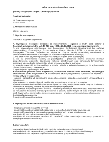 Nabór na wolne stanowisko pracy : główny księgowy w Związku Gmin Wyspy Wolin 1. Adres jednostki: Ul. Świerczewskiego 4a 72-510 Wolin 2. Określenie stanowiska główny księgowy 3. Wymiar czasu pracy 1/2 etatu ( 20 godzin tygodniowo ) 4. Wymagania niezbędne związane ze stanowiskiem ( zgodnie z art.54 ust.2 ustawy o finansach publicznych Dz. Ust. Nr 157 poz. 1240 z 27.08.2009 r. z późniejszymi zmianami): 1. ma obywatelstwo członkowskie Unii Europejskiej Konfederacji Szwajcarskiej lub państwa członkowskiego Europejskiego Porozumienia o Wolnym Handlu ( EFTA ) – strony umowy o Europejskim Obszarze Gospodarczym, chyba że odrębne ustawy uzależniają zatrudnienie w jednostce sektora finansów publicznych od posiadania obywatelstwa polskiego; 2. ma zdolność do czynności prawnych oraz korzysta w pełni praw publicznych; 3. nie był prawomocnie skazany za przestępstwa : przeciwko mieniu, przeciwko obrotowi gospodarczemu, przeciwko działalności instytucji państwowych oraz samorządu terytorialnego, przeciwko wiarygodności dokumentów lub za przestępstwo karne skarbowe; 4. posiada znajomość języka polskiego w mowie i piśmie w zakresie koniecznym do wykonywania obowiązków głównego księgowego; 5. spełnia jeden z poniższych warunków: • ekonomiczne jednolite studia magisterskie, ekonomiczne wyższe studia zawodowe, uzupełniające ekonomiczne studia magisterskie lub ekonomiczne studia podyplomowe i posiada co najmniej 3letnią praktykę w księgowości, • średnią , policealną lub pomaturalną szkołę ekonomiczną i posiada co najmniej 6- letnią praktykę w księgowości, • jest wpisana do rejestru biegłych rewidentów na podstawie odrębnych przepisów, • posiada świadectwo kwalifikacyjne uprawniające do usługowego prowadzenia ksiąg rachunkowych lub certyfikat księgowy, wydane na podstawie odrębnych przepisów 6. znajomość przepisów prawa w zakresie : finansów publicznych, rachunkowości, odpowiedzialności za naruszenie dyscypliny finansów publicznych, o podatku dochodowym od osób prawnych oraz od osób fizycznych, o samorządzie gminnym, prawa pracy i umiejętność ich właściwego stosowania; 7. nieposzlakowana opinia; 8. znajomość obsługi komputera. 5. Wymagania dodatkowe związane ze stanowiskiem : - biegła znajomość obsługi MS OFFICE - znajomość zasad prowadzenia księgowości w jednostkach samorządu terytorialnego, - znajomość przepisów z zakresu ubezpieczeń społecznych i prawa podatkowego, - umiejętność sporządzania sprawozdań budżetowych, - umiejętność pracy w zespole, sumienność i rzetelność, dobra organizacja czasu pracy, gotowość do stałego podnoszenia kwalifikacji. 6. Zakres zadań: - prowadzenie rachunkowości jednostki zgodnie z obowiązującymi przepisami - odpowiedzialność za prawidłową gospodarkę środkami budżetowymi i pozabudżetowymi, - odpowiedzialność za przestrzeganie zasad oszczędnej gospodarki budżetowej, - odpowiedzialność za całokształt prac związanych z działalnością finansowo - księgową jednostki, - odpowiedzialność w zakresie kompletności i rzetelności dokumentów dotyczących operacji finansowych, - dokonywanie kontroli zgodności finansowych z planem finansowym, - sporządzanie sprawozdań finansowych jednostki. 7. Wymagane dokumenty : - życiorys ( CV ) wraz ze zgodą na przetwarzanie danych osobowych do celów rekrutacyjnych, - list motywacyjny, - dokumenty potwierdzające kwalifikacje wymagane do zajmowania stanowiska głównego księgowego, - dokumenty potwierdzające odpowiedni staż pracy, - oświadczenie o niekaralności, - inne dokumenty potwierdzające posiadane kwalifikacje i umiejętności. 8. Termin składania ofert: Wymagane dokumenty należy złożyć w ciągu 14 dni od daty opublikowania ogłoszenia tj. od dnia 23.03.2016 r. w siedzibie Związku Gmin Wyspy Wolin – osobiście lub przesłać pocztą (liczy się data wpływu do siedziby ZGWW). Dokumenty należy złożyć w zamkniętej kopercie z dopiskiem „ Nabór na stanowisko głównego księgowego ”. Przewidziany termin analizy złożonych ofert pod względem formalnym to 08.04.2016r. Lista kandydatów spełniających wymagania formalne oraz informacje o wyniku naboru będą umieszczone na stronie BIP. Kandydaci spełniający wymagania formalne zostaną telefonicznie poinformowani o terminie rozmowy kwalifikacyjnej. 9. Informacja o wskaźniku zatrudnienia osób niepełnosprawnych. Wskaźnik zatrudniania osób niepełnosprawnych w Związku Gmin Wyspy Wolin, w rozumienie przepisów o rehabilitacji zawodowej i społecznej oraz zatrudnianiu osób niepełnosprawnych w lutym 2016r. nie przekroczył 6%. Regulamin przeprowadzenia naboru kandydatów na wolne stanowisko urzędnicze – główny księgowy w Związku Gmin Wyspy Wolin Regulamin określa czynności od przygotowania naboru na wolne stanowisko do zatrudnienia wybranego kandydata. § 1. Podjęcie decyzji o rozpoczęciu procedury rekrutacyjnej na wolne stanowisko urzędnicze Decyzję o rozpoczęciu procedury rekrutacyjnej podejmuje Przewodniczący Zarządu ZGWW. Pracownik odpowiedzialny za sprawy związane z kadrami w ZGWW przygotowuje: a) dokładne określenie celów i zadań wykonywanych na danym stanowisku oraz wynikających z tego tytułu obowiązków. b) określenie szczegółowych wymagań w zakresie kwalifikacji, umiejętności i predyspozycji. c) określenie uprawnień służbowych do wykonania zadań, d)określenie odpowiedzialności Na podstawie opisu stanowiska opracowany został tekst ogłoszenia o naborze. Ogłoszenie o naborze umieszcza się w BIP oraz tablicy informacyjnej placówki. Kandydaci składają wymagane dokumenty za pośrednictwem poczty lub osobiście, w miejscu i w terminie wskazanym w treści ogłoszenia. Dokumenty kandydata uważa się za dostarczone jeżeli wpłynęły do placówki w terminie wskazanym w treści ogłoszenia. § 2. Powołanie i praca Komisji Rekrutacyjnej Komisję Rekrutacyjną powołuje