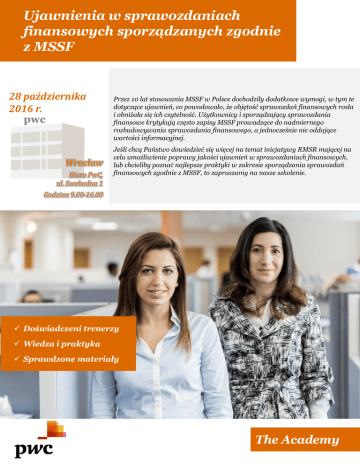 Ujawnienia w sprawozdaniach finansowych sporządzanych zgodnie z MSSF 28 października 2016 r. pwc Wrocław Biuro PwC, ul. Swobodna 1 Przez 10 lat stosowania MSSF w Polsce dochodziły dodatkowe wymogi, w tym te dotyczące ujawnień, co powodowało, że objętość sprawozdań finansowych rosła i obniżała się ich czytelność. Użytkownicy i sporządzający sprawozdania finansowe krytykują często zapisy MSSF prowadzące do nadmiernego rozbudowywania sprawozdania finansowego, a jednocześnie nie oddające wartości informacyjnej. Jeśli chcą Państwo dowiedzieć się więcej na temat inicjatywy RMSR mającej na celu umożliwienie poprawy jakości ujawnień w sprawozdaniach finansowych, lub chcieliby poznać najlepsze praktyki w zakresie sporządzania sprawozdań finansowych zgodnie z MSSF, to zapraszamy na nasze szkolenie. Godzina 9.00-16.00 Doświadczeni trenerzy Wiedza i praktyka Sprawdzone materiały The Academy Ujawnienia w sprawozdaniach finansowych sporządzanych zgodnie z MSSF Program Szkolenia 1. Podstawowe składniki sprawozdania finansowego: a) bilans czy sprawozdanie z sytuacji finansowej – główne elementy i możliwości prezentacji b) rachunek zysków i strat – możliwe układy, podstawowe zasady prezentacji c) pozostałe dochody całkowite – co i jak prezentujemy? d) rachunek przepływów pieniężnych – klasyfikacja przepływów, wymogi prezentacyjne e) zestawienie zmian w kapitale i jego specyfika f) trzeci bilans, czyli wpływ zmian zasad rachunkowości i korekt błędów na sprawozdania podstawowe 2. Informacja objaśniająca: a) podstawowe wymagania wynikające z MSR 1 b) wpływ zmian w MSR 1 na sprawozdania finansowe (inicjatywa dotycząca ujawnień) c) zmiany do MSR 7 w zakresie inicjatywy dotyczącej ujawnień i ich wpływ na informację objaśniającą d) kluczowe szacunki i osądy kierownictwa e) najczęściej pomijane noty i ujawnienia 3. MSSF 7 – Ujawnienia w zakresie instrumentów finansowych: a) zakres standardu – co jest instrumentem finansowym? b) wpływ instrumentów finansowych na sprawozdanie z sytuacji finansowej i rachunek zysków i strat c) 4. Formularz zgłoszeniowy dostępny na stronie internetowej: www.pwcacademy.pl Termin nadsyłania zgłoszeń upływa 3 dni przed planowaną datą szkolenia. Szczegółowe informacje administracyjne zostaną wysłane nie później niż 3 dni przed datą szkolenia. Płatność na podstawie faktury VAT wystawionej w dniu szkolenia. Cena: 695 PLN +23% VAT za osobę Cena obejmuje materiały, przerwy kawowe oraz lunch. podstawowe ryzyka i wymagane ujawnienia – aspekty praktyczne MSSF 13 – Ujawnienia w zakresie wartości godziwej: a) wartość godziwa w sprawozdaniach wg MSSF – nie tylko instrumenty finansowe b) hierarchia wartości godziwej c) powtarzalne a jednorazowe wyceny do wartości godziwej d) ujawnienia w zakresie technik wyceny i parametrów – aspekty praktyczne 4. Warunki uczestnictwa Podsumowanie - jak stworzyć najlepsze sprawozdania finansowe: a) przykłady na rynku polskim b) wymogi regulatorów w zakresie prezentacji sprawozdań finansowych PROWADZĄCY: Krzysztof Gmur, Krzysztof obecnie prowadzi własną działalność jako biegły rewident, w przeszłości Dyrektor PwC. Krzysztof posiada długoletnie doświadczenie w badaniu sprawozdań finansowych oraz doradztwie księgowym dla polskich (w tym notowanych na Giełdzie Papierów Wartościowych) oraz międzynarodowych firm. Krzysztof zajmuje się analizą problemów technicznych z zakresu polskiej rachunkowości, jak i MSSF biorąc udział w pracach związanych z konwersją sprawozdań finansowych na MSSF. Jako wykładowca brał udział w licznych szkoleniach i seminariach w zakresie rachunkowości organizowanych przez PwC i na zaproszenie innych instytucji. www.pwcacademy.pl -10% • przy zapisie 2 lub więcej osób • przy zapisie na 2 lub więcej szkoleń Kontakt: Katarzyna Mańczyk Akademia PwC Koordynator ds. szkoleń Tel. +48 (22) 746 7064 Fax +48 (22) 742 7064 [email protected]