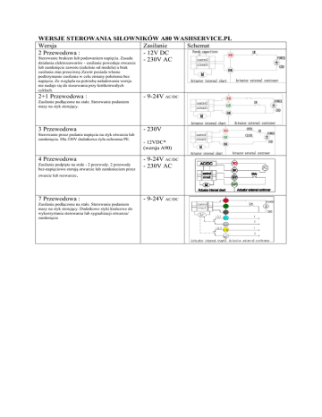 WERSJE STEROWANIA SIŁOWNIKÓW A80 WASHSERVICE.PL Wersja Zasilanie Schemat 2 Przewodowa : - 12V DC Sterowanie brakiem lub podawaniem napięcia. Zasada - 230V AC działania elektrozaworów - zasilanie powoduje otwarcie lub zamknięcie zaworu (zależnie od modelu) a brak zasilania stan przeciwny.Zawór posiada własne podtrzymanie zasilania w celu zmiany położenia bez napięcia. Ze względu na potrzebę naładowania wersja nie nadaje się do stosowania przy krótkotrwałych cyklach. 2+1 Przewodowa : - 9-24V AC/DC Zasilanie podłączone na stałe. Sterowanie podaniem masy na styk sterujący. 3 Przewodowa Sterowanie przez podanie napięcia na styk otwarcia lub zamknięcia. Dla 230V dodatkowa żyła ochronna PE. 4 Przewodowa Zasilanie podpięte na stałe - 2 przewody. 2 przewody bez-napięciowo sterują otwarcie lub zamknieciem przez - 230V - 12VDC* (wersja A90) - 9-24V AC/DC - 230V AC zwarcie lub rozwarcie. 7 Przewodowa : Zasilanie podłączone na stałe. Sterowanie podaniem masy na styk sterujący. Dodatkowe styki krańcowe do wykorzystania sterowania lub sygnalizacji otwarcia/ zamknięcia - 9-24V AC/DC