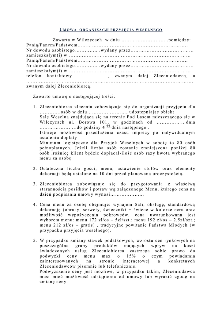 UMOWA ORGANIZACJI PR ZYJĘCIA WESELNEGO Zawart a w Wilcz ycach w dniu ………… ……………..pomiędz y: Panią/Panem/Państ wem………………………………………………… ……….. Nr dowodu osobist ego ………….. .w ydany przez………………………………… zamieszkał ym (i) w ………………………………………………………………… Panią/Panem/Państ wem………………………………………………………….. Nr dowodu osobist ego ………….. .w ydany przez………………………………… zamieszkał ym (i) w ………………………………………………………………… telefon kontaktowy…………… ……., zwan ym dalej Zl eceniodawcą, a ...……………………………………………………………………………………… , zwan ym dalej Zleceniobiorcą . Zawarto umowę o następującej treści: 1. Zl eceniobiorca zlecenia zobowiązuj e si ę do o rganizacji prz yj ęci a dl a ………….osób w dni u ……………………, udostępni ając obiekt Salę Weselną znajd ującą się na tereni e Pod Lasem miesz czącego się w Wilcz ycach ul. Borowa 101 , w godzinach od ………………dnia …………………..do godzin y 4 0 0 dnia następnego . Is tniej e możliwość przedłużeni a czasu imprez y po ind ywidualn ym ustaleni u dopł at y Minimum logist ycz ne dla Prz yję ć Weseln ych w sobotę t o 80 osób pełnopł atn ych. Jeżeli liczba osó b zost anie zmni ejszona poniżej 8 0 osób ,różni cę kli ent będzie dopł acał -il ość osób raz y kwota w ybranego menu za osobę. 2. Ostateczna liczba gości , m enu, ustawieni e stołów oraz elem ent y dekoracji będą ustal one na 10 dni przed planowaną urocz ystością. 3. Zl eceniobiorca zobowiązuje si ę do prz ygot owania z właści wą starannością posiłk ów i potraw wg załączonego Menu, którego cena na dzień podpisani a um ow y w ynosi………………... 4. Cena menu za osobę obejmuj e: w ynajem Sali, obsługę, st andardową dekorację (obrus y, serwet y, świeczniki + świece w kolorze ecru oraz możliwość w ypoż yczenia pokrowców, cena uwarunko wana jest w yborem menu: menu 172 zł/os – 5zł/szt.; menu 192 zł/os – 2,5zł/szt.; menu 212 zł/os – gratis) , trad yc yj ne powitani e Państwa Mł od ych ( w prz ypadku prz yj ęci a weselnego). 5. W prz ypadku zmiany stawek podatkow ych, wzrostu cen r ynkow ych na poszczególne grupy produktów mając ych wpł yw na koszt świadczon ych usług Zl eceniobiorca zastrzega sobie prawo do podw yżki cen y menu max o 15% o cz ym powiadamia zainteresowan ych na stroni e internetowej a konkretn ych Zl eceniodawców pisemnie lub tel efonicz nie. Podw yższenie cen y jest możliwe, w przypadku t akim, Zleceniodawca musi mieć możliwość odstąpi enia od umow y lub w yrazi ć zgodę na zmianę cen y. 6. W yrob y cukiernicz e (ci asta, t ort y,) oraz owoce ; 6.1. - któr ych ni e obejmuje m enu, zost aną dostarczone naj później w dniu planowane go prz yj ęci a przez Zl eceniodawcę wraz z opakowani ami j ednorazow ymi , ze swej stron y Zl eceniobiorca zapewni warunki ni ezbędne do przechow ywania tego t ypu w yrobów i serwować je będzie w t rakci e prz yj ęc i a. 6.2. któr ych nie obejmuje menu, a które na zleceni e zleceniodawc y dostarcza zleceniobi orca imprez y, zleceniodawca wni esie za nie opł atę zgodni e z wcze śniej sz ymi ust aleni ami. 7. Alkohol e zostaną dostarczone najpóźniej w dniu pl anowanego prz yj ęci a przez Zl eceniodawcę . Zl eceniobiorca zapewni warunki niezbędne do i ch przechow ywania oraz możliwość swobodnego dys ponowani a nim i w czasie prz yjęci a przez Zleceniodawcę. W yłączn ym d yspo nentem alkoholu j est Zleceniodawca . 8. Produkt y ż ywności owe pozostał e po zakończeni u imprez y z ostaną przekaz ane Zl eceni odawc y do godz. 12 .00 dnia nast ępnego lub w innym terminie po ustaleniu międz y st ronami. 9. Zl eceniobiorca zobowiązuje si ę d o zapewnienia sprawnej obsługi, bezpieczeństwa gości i zapewnieni a cz ystości w pomieszczeniach sanitarn ych przez cał y czas t rwania im prez y. 10. Zl eceniodawca zobowiązuje si ę do pokr yci a kosztów szkód powstał ych z win y uczestników imprez y. Ok reśleni e ewentualn ych zniszczeń związanych z wyposażeni em i konstrukcj a bud ynku dokonana zostanie na podst awie oględzi n uszkodzonych przedmiotów i urządzeń, a koszt usunięci a zniszczeń Zl eceniodawca zobowi ązuje się pokr yć w w ysokości określonej w fakt urach dokum entując yc h naprawę uszkodzeń, na co w ykonawca w yst awi fakturę . 10.1. W dniu planowanej imprez y P ara M łoda lub osoba przez nich upoważniona dokonuje oględzin w ynaj m owanej Sali /jak równi eż pokoi / w celu określenia st anu podnajm owan ych pomieszczeń. 11. Zl eceniodawca organizuje oprawę m uz yczną we własnym zakresi e. Z t yt ułu w ykorz ys t ania praw autorskich zleceniobiorca dokonuj e opł at y r yc załtowej na moc y udzielonej li cencji Zaiks num er 93/10/0251 R O/M15/S R IDO 4153 11.1.Zl eceniodawca odpowi ada za nośni ki dźwięku i obrazu z których na wł asne ż yczeni e, odtwarzać będzi e ut wor y podcz as imprez y. 11.2. Zl eceniobi orca członkom zespołu muz ycz nego zatr udnionego przez Zl eceniodawcę umożliwi podłączenie niezbędn ych inst rumentów i urządzeń nagł aśni ając ych. 12.Dla dzieci uczestnicząc ych w prz yj ęciu weseln ym stosuj e się stawki specj alne: 12.1. Dzieci w wi eku do 6 l at korz yst ają z Menu ni eodpł atni e 12.2. Za dzieci w wieku od 6 do 12 lat korz yst ającego z Menu Zl eceniodawca zapł aci 50% uz godnionej stawki. 13.Za obsługę wesel a (zespół muz yczn y, fotograf, kamerz yst a) zaproszoną przez Zl eceniodawcę i korz yst ającą z Menu zapłaci on 50% stawki. 14. Apart ame nt dl a Państwa Młod ych – gratis (prz y organiz ac ji prz yjęcia wes elnego pow yżej 8 0 osób). Apartam ent jest 