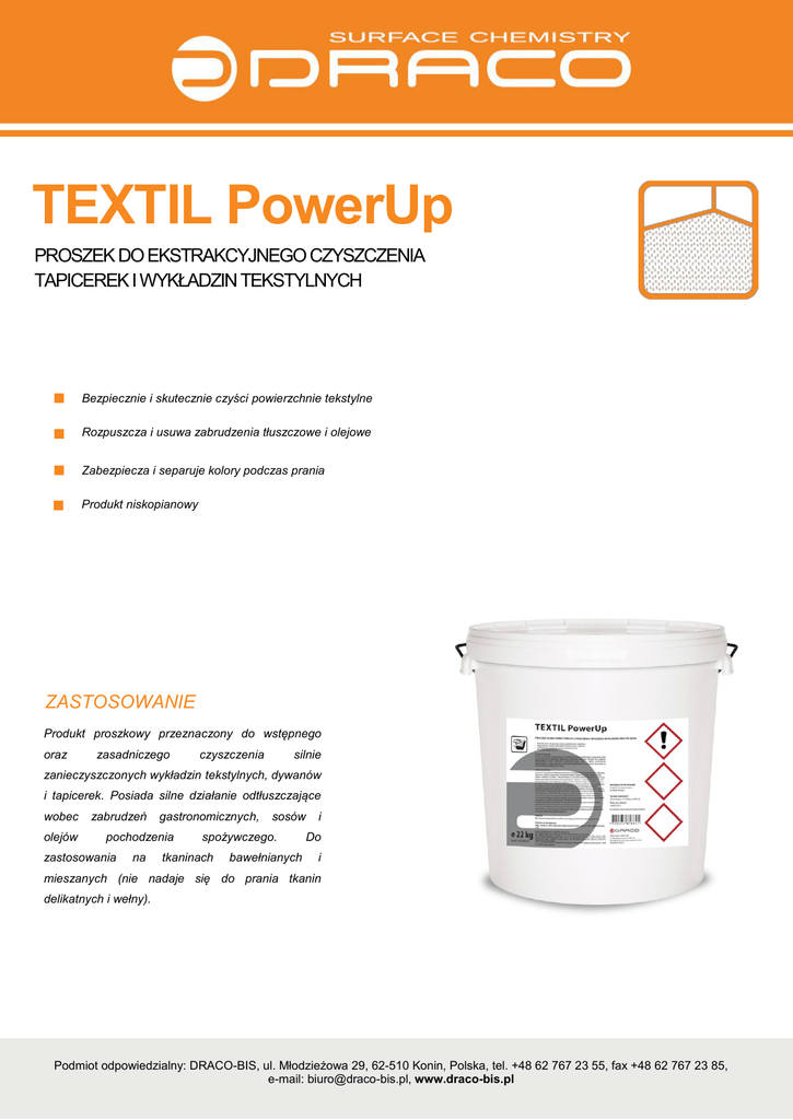 TEXTIL PowerUp PROSZEK DO EKSTRAKCYJNEGO CZYSZCZENIA TAPICEREK I WYKŁADZIN TEKSTYLNYCH Bezpiecznie i skutecznie czyści powierzchnie tekstylne Rozpuszcza i usuwa zabrudzenia tłuszczowe i olejowe Zabezpiecza i separuje kolory podczas prania Produkt niskopianowy ZASTOSOWANIE Produkt proszkowy przeznaczony do wstępnego oraz zasadniczego czyszczenia silnie zanieczyszczonych wykładzin tekstylnych, dywanów i tapicerek. Posiada silne działanie odtłuszczające wobec olejów zabrudzeń gastronomicznych, pochodzenia zastosowania na sosów spożywczego. tkaninach bawełnianych i Do i mieszanych (nie nadaje się do prania tkanin delikatnych i wełny). Podmiot odpowiedzialny: DRACO-BIS, ul. Młodzieżowa 29, 62-510 Konin, Polska, tel. +48 62 767 23 55, fax +48 62 767 23 85, e-mail: [email protected], www.draco-bis.pl SPOSÓB UŻYCIA Czyszczenie rozpocząć od dokładnego odkurzenia i wytrzepania czyszczonej powierzchni wykładziny, dywanu lub tapicerki. Dawkowanie: Przed zastosowaniem dokładnie rozpuścić produkt w ciepłej wodzie w stężeniu 15-20 gram / 1 litr wody bieżącej. Czyszczenie wykładzin tekstylnych i dywanów za pomocą szorowarki tarczowej: Nanosić poprzez oprysk w stężeniu: 1 l roztworu roboczego / 15-20m² czyszczonego dywanu lub wykładziny (wydajność zależy od grubości i gęstości runa). Po naniesieniu pozostawić na kilka minut, następnie czyścić przy użyciu szczotki tarczowej lub maszyną ekstrakcyjną. Powstałą pianę zebrać ściągaczką, dywan lub wykładzinę spłukać wodą bieżącą i dokładnie odwirować, pozostawić do wysuszenia. Czynność płukania wodą bieżącą i odwirowywania zaleca się przeprowadzić dwukrotnie. W drugiej fazie płukania zaleca się zastosowanie produktu do zmiękczania i neutralizacji tkanin DR PLANT SoftUp. Czyszczenie wykładzin tekstylnych i tapicerek za pomocą odkurzacza piorącego: Nanosić poprzez oprysk, odczekać około 1 minuty, odessać rozpuszczony brud dyszą ekstrakcyjną odkurzacza piorącego. Czyszczenie przeprowadzać metodą 1 kroku ( oprysk i odkurzanie w 1 przejściu roboczym) lub w 2 przejściach roboczych. Czyszczoną powierzchnie pozostawić do wysuszenia. Nie dopuścić do przemoczenia materiału. Zabezpieczenie powierzchni przed rozwojem mikroorganizmów: Po wysuszeniu wykładziny tekstylnej, dywanu lub tapicerki zaleca się zastosowanie produktu NANOSILVER Care w celu zabezpieczenia włosia/materiału przed rozwojem grzybów i bakterii, które oznaczają pojawienie się „przykrego zapachu”. ŚRODKI OSTROŻNOŚCI Skład: fosforany ≥30%, niejonowe środki powierzchniowo czynne 5- 15%, polikarboksylany <5% R22: Działa szkodliwe po połknięciu. R36/38: Działa drażniąco na oczy i skórę. R41: Ryzyko poważnego uszkodzenia oczu. S2: Chronić przed dziećmi. S22: Nie wdychać pyłu. S24/25: Unikać zanieczyszczenia skóry i oczu. S26: Zanieczyszczone oczy natychmiast przemyć dużą ilością wody i zasięgnąć porady lekarza. S37/39: Nosić odpowiednie rękawice ochronne i okulary lub ochronę twarzy. S45: W przypadku awarii lub jeżeli źle się poczujesz, niezwłocznie zasięgnij porady lekarza - jeżeli to możliwe, pokaż etykietę. WŁAŚCIWOŚCI FIZYKO-CHEMICZNE Gęstość nasypowa, g/dm³ 0.88 ± 0.05 pH produktu (w stężeniu 1%) 8 ± 0.5 Zdolność pianotwórcza Umiarkowana Temperatura zamarzania < 0˚C Magazynowanie 5˚C do 35˚C Kolor produktu Biały proszek INFORMACJE DODATKOWE Produkt do zastosowania profesjonalnego. OPAKOWANIE Wiadro: 5 kg kod: 9300005 Wiadro: 18 kg kod: 9300020 Podmiot odpowiedzialny: DRACO-BIS, ul. Młodzieżowa 29, 62-510 Konin, Polska, tel. +48 62 767 23 55, fax +48 62 767 23 85, e-mail: [email protected], www.draco-bis.pl