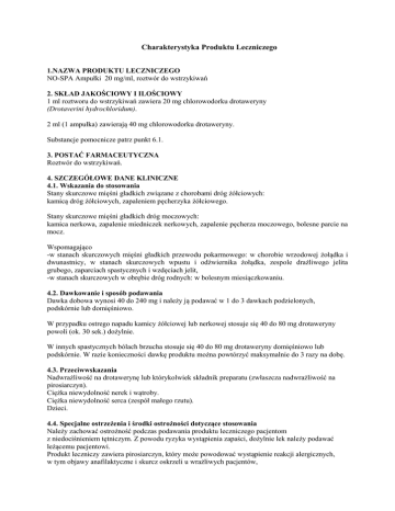 Charakterystyka Produktu Leczniczego 1.NAZWA PRODUKTU LECZNICZEGO NO-SPA Ampułki 20 mg/ml, roztwór do wstrzykiwań 2. SKŁAD JAKOŚCIOWY I ILOŚCIOWY 1 ml roztworu do wstrzykiwań zawiera 20 mg chlorowodorku drotaweryny (Drotaverini hydrochloridum). 2 ml (1 ampułka) zawierają 40 mg chlorowodorku drotaweryny. Substancje pomocnicze patrz punkt 6.1. 3. POSTAĆ FARMACEUTYCZNA Roztwór do wstrzykiwań. 4. SZCZEGÓŁOWE DANE KLINICZNE 4.1. Wskazania do stosowania Stany skurczowe mięśni gładkich związane z chorobami dróg żółciowych: kamicą dróg żółciowych, zapaleniem pęcherzyka żółciowego. Stany skurczowe mięśni gładkich dróg moczowych: kamica nerkowa, zapalenie miedniczek nerkowych, zapalenie pęcherza moczowego, bolesne parcie na mocz. Wspomagająco -w stanach skurczowych mięśni gładkich przewodu pokarmowego: w chorobie wrzodowej żołądka i dwunastnicy, w stanach skurczowych wpustu i odźwiernika żołądka, zespole drażliwego jelita grubego, zaparciach spastycznych i wzdęciach jelit, -w stanach skurczowych w obrębie dróg rodnych: w bolesnym miesiączkowaniu. 4.2. Dawkowanie i sposób podawania Dawka dobowa wynosi 40 do 240 mg i należy ją podawać w 1 do 3 dawkach podzielonych, podskórnie lub domięśniowo. W przypadku ostrego napadu kamicy żółciowej lub nerkowej stosuje się 40 do 80 mg drotaweryny powoli (ok. 30 sek.) dożylnie. W innych spastycznych bólach brzucha stosuje się 40 do 80 mg drotaweryny domięśniowo lub podskórnie. W razie konieczności dawkę produktu można powtórzyć maksymalnie do 3 razy na dobę. 4.3. Przeciwwskazania Nadwrażliwość na drotawerynę lub którykolwiek składnik preparatu (zwłaszcza nadwrażliwość na pirosiarczyn). Ciężka niewydolność nerek i wątroby. Ciężka niewydolność serca (zespół małego rzutu). Dzieci. 4.4. Specjalne ostrzeżenia i środki ostrożności dotyczące stosowania Należy zachować ostrożność podczas podawania produktu leczniczego pacjentom z niedociśnieniem tętniczym. Z powodu ryzyka wystąpienia zapaści, dożylnie lek należy podawać leżącemu pacjentowi. Produkt leczniczy zawiera pirosiarczyn, który może powodować wystąpienie reakcji alergicznych, w tym objawy anafilaktyczne i skurcz oskrzeli u wrażliwych pacjentów, zwłaszcza tych z astmą i alergią w wywiadzie. W przypadku nadwrażliwości na pirosiarczyn sodu należy unikać podawania produktu leczniczego parenteralnie (patrz pkt 4.3). Należy zachować ostrożność podczas podawania drotaweryny w postaci roztworu do wstrzykiwań kobietom w ciąży (patrz pkt. 4.6). Nie należy stosować drotaweryny w okresie porodu (patrz punkt 4.6) 4.5. Interakcje z innymi lekami i inne rodzaje interakcji Inhibitory fosfodiesterazy, takie jak papaweryna i jej pochodne zmniejszają przeciwparkinsonowe działanie lewodopy. W przypadku jednoczesnego stosowania drotaweryny i lewodopy może dojść u pacjenta do nasilenia drżeń i sztywności. 4.6. Ciąża i laktacja Ciąża Ze względu na brak wystarczających badań, preparat można stosować u pacjentek w okresie ciąży jedynie w przypadkach gdy korzyść jego zastosowania przewyższa czynniki ryzyka. Substancja czynna przechodzi przez łożysko. W badaniu klinicznym stwierdzono zwiększone ryzyko krwotoku poporodowego u pacjentek otrzymujących drotawerynę w trakcie porodu. Dlatego nie należy stosować drotaweryny w okresie porodu. Karmienie piersią Nie wiadomo czy drotaweryna przenika do mleka kobiecego. Stosownie drotaweryny w okresie karmienia piersią nie jest zalecane. 4.7. Wpływ leku na zdolność prowadzenia pojazdów mechanicznych i obsługiwania urządzeń mechanicznych w ruchu Należy poinformować pacjentów, że po podaniu parenteralnym leku, zwłaszcza dożylnym, powinni unikać wykonywania potencjalnie niebezpiecznych czynności, takich jak prowadzenie pojazdów lub obsługa maszyn. 4.8. Działania niepożądane Podczas badań klinicznych następujące działania niepożądane zgłaszane przez badaczy jako co najmniej możliwie związane z drotaweryną są przedstawione według częstości występowania (często >1% <10%; niezbyt często >0,1% <1%; rzadko >0,01% <0,1%) i klasyfikacji układ-narząd. Zaburzenia żołądka i jelit: Rzadko: nudności i zaparcia. Zaburzenia układu nerwowego: Rzadko: bóle głowy, zawroty głowy, bezsenność. Zaburzenia serca i naczyń: Rzadko: kołatanie serca, niedociśnienie tętnicze Zaburzenie układu immunologicznego: Rzadko: reakcje alergiczne, zwłaszcza u pacjentów nadwrażliwych na pirosiarczyn. 4.9. Przedawkowanie Brak doniesień na temat przedawkowania produktu leczniczego. W badaniach klinicznych, przy znacznym, zamierzonym przedawkowaniu drotaweryny odnotowano pojedyncze przypadki zaburzenia rytmu serca i przewodnictwa włączając całkowity blok odnogi pęczka Hisa i zatrzymanie krążenia, które może być śmiertelne. W razie wystąpienia przedawkowania należy dokładnie obserwować pacjenta i wdrożyć leczenie objawowe. 2 5. WŁAŚCIWOŚCI FARMAKOLOGICZNE 5.1. Właściwości farmakodynamiczne Grupa farmakoterapeutyczna: papaweryna i jej pochodne kod ATC: A 03 AD 02 Silne działanie spazmolityczne drotaweryny jest wynikiem jej znacznego hamującego działania na enzym fosfodiesterazę. Enzym fosfodiesteraza jest odpowiedzialny za hydrolizę cAMP do AMP. Zatem zahamowanie fosfodiesterazy powoduje zwiększenie stężenia cAMP, co prowadzi do następującej kaskady zjawisk. Duże stężenie cAMP aktywuje zależną od cAMP kinazę fosforylującą lekkie łańcuchy miozyny (MLCK). Fosforylacja MLCK powoduje zmniejszenie jej powinowactwa do kompleksu Ca-kalmodulina i w ten sposób nieczynna postać MLCK utrzymuje mięsień w stanie rozkurczu. cAMP wpływa również na stężenie jonu Ca++ w cytozolu przez stymulowanie transportu jonów Ca++ do przestrzeni zewnątrzkomórkowej i reticulum sarkoplazmatycznego. To stężenie jonu Ca++ zmniejszające działanie drotaweryny poprzez cAMP tłumaczy antagonistyczne dz