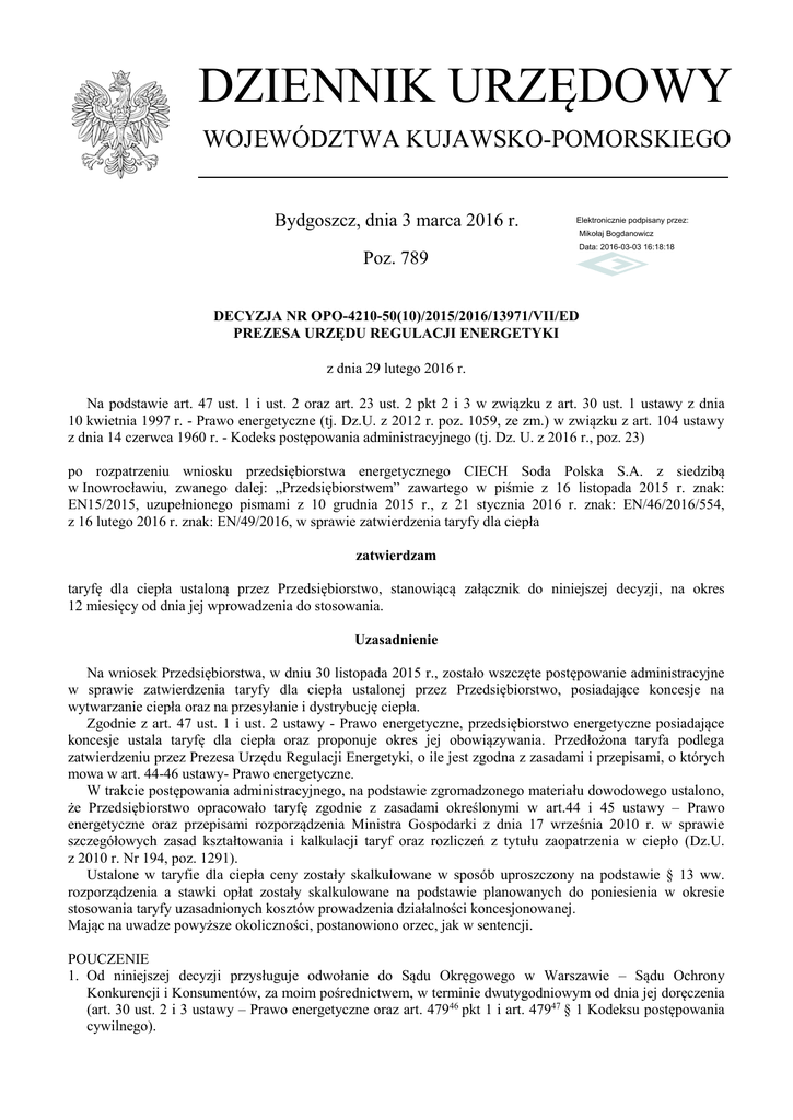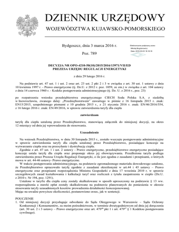 DZIENNIK URZĘDOWY WOJEWÓDZTWA KUJAWSKO-POMORSKIEGO Bydgoszcz, dnia 3 marca 2016 r. Elektronicznie podpisany przez: Mikołaj Bogdanowicz Poz. 789 Data: 2016-03-03 16:18:18 DECYZJA NR OPO-4210-50(10)/2015/2016/13971/VII/ED PREZESA URZĘDU REGULACJI ENERGETYKI z dnia 29 lutego 2016 r. Na podstawie art. 47 ust. 1 i ust. 2 oraz art. 23 ust. 2 pkt 2 i 3 w związku z art. 30 ust. 1 ustawy z dnia 10 kwietnia 1997 r. - Prawo energetyczne (tj. Dz.U. z 2012 r. poz. 1059, ze zm.) w związku z art. 104 ustawy z dnia 14 czerwca 1960 r. - Kodeks postępowania administracyjnego (tj. Dz. U. z 2016 r., poz. 23) po rozpatrzeniu wniosku przedsiębiorstwa energetycznego CIECH Soda Polska S.A. z siedzibą w Inowrocławiu, zwanego dalej: „Przedsiębiorstwem” zawartego w piśmie z 16 listopada 2015 r. znak: EN15/2015, uzupełnionego pismami z 10 grudnia 2015 r., z 21 stycznia 2016 r. znak: EN/46/2016/554, z 16 lutego 2016 r. znak: EN/49/2016, w sprawie zatwierdzenia taryfy dla ciepła zatwierdzam taryfę dla ciepła ustaloną przez Przedsiębiorstwo, stanowiącą załącznik do niniejszej decyzji, na okres 12 miesięcy od dnia jej wprowadzenia do stosowania. Uzasadnienie Na wniosek Przedsiębiorstwa, w dniu 30 listopada 2015 r., zostało wszczęte postępowanie administracyjne w sprawie zatwierdzenia taryfy dla ciepła ustalonej przez Przedsiębiorstwo, posiadające koncesje na wytwarzanie ciepła oraz na przesyłanie i dystrybucję ciepła. Zgodnie z art. 47 ust. 1 i ust. 2 ustawy - Prawo energetyczne, przedsiębiorstwo energetyczne posiadające koncesje ustala taryfę dla ciepła oraz proponuje okres jej obowiązywania. Przedłożona taryfa podlega zatwierdzeniu przez Prezesa Urzędu Regulacji Energetyki, o ile jest zgodna z zasadami i przepisami, o których mowa w art. 44-46 ustawy- Prawo energetyczne. W trakcie postępowania administracyjnego, na podstawie zgromadzonego materiału dowodowego ustalono, że Przedsiębiorstwo opracowało taryfę zgodnie z zasadami określonymi w art.44 i 45 ustawy – Prawo energetyczne oraz przepisami rozporządzenia Ministra Gospodarki z dnia 17 września 2010 r. w sprawie szczegółowych zasad kształtowania i kalkulacji taryf oraz rozliczeń z tytułu zaopatrzenia w ciepło (Dz.U. z 2010 r. Nr 194, poz. 1291). Ustalone w taryfie dla ciepła ceny zostały skalkulowane w sposób uproszczony na podstawie § 13 ww. rozporządzenia a stawki opłat zostały skalkulowane na podstawie planowanych do poniesienia w okresie stosowania taryfy uzasadnionych kosztów prowadzenia działalności koncesjonowanej. Mając na uwadze powyższe okoliczności, postanowiono orzec, jak w sentencji. POUCZENIE 1. Od niniejszej decyzji przysługuje odwołanie do Sądu Okręgowego w Warszawie – Sądu Ochrony Konkurencji i Konsumentów, za moim pośrednictwem, w terminie dwutygodniowym od dnia jej doręczenia (art. 30 ust. 2 i 3 ustawy – Prawo energetyczne oraz art. 47946 pkt 1 i art. 47947 § 1 Kodeksu postępowania cywilnego). Dziennik Urzędowy Województwa Kujawsko-Pomorskiego –2– Poz. 789 2. Odwołanie od decyzji powinno czynić zadość wymaganiom przepisanym dla pisma procesowego oraz zawierać oznaczenie zaskarżonej decyzji i wartości przedmiotu sporu, przytoczenie zarzutów, zwięzłe ich uzasadnienie, wskazanie dowodów, a także zawierać wniosek o uchylenie albo zmianę decyzji – w całości lub w części (art. 47949 Kodeksu postępowania cywilnego). Odwołanie należy przesłać na adres Zachodniego Oddziału Terenowego Urzędu Regulacji Energetyki, 61-774 Poznań, ul. Wielka 20. 3. Stosownie do art. 47 ust. 3 w związku z art. 31 ust. 4 ustawy – Prawo energetyczne, niniejsza decyzja zostanie skierowana do ogłoszenia w Dzienniku Urzędowym Województwa Kujawsko-Pomorskiego 4. Stosownie do art. 47 ust. 4 ustawy – Prawo energetyczne, Przedsiębiorstwo wprowadza taryfę do stosowania nie wcześniej niż po upływie 14 dni i nie później niż do 45 dnia od dnia jej opublikowania. z up. Prezesa Urzędu Regulacji Energetyki Dyrektor Zachodniego Oddziału Terenowego Urzędu Regulacji Energetyki z siedzibą w Poznaniu Irena Gruszka Uiszczono opłatę skarbową w wysokości 10 zł dnia 24 listopada 2015 r. na rachunek 95 1030 1508 0000 0005 5002 4055 Ewa Demuth, główny specjalista Otrzymują: 1. CIECH Soda Polska S.A., 88-101 Inowrocław, ul. Fabryczna 4, 2. Wojewoda Kujawsko - Pomorski. Dziennik Urzędowy Województwa Kujawsko-Pomorskiego –3– Poz. 789 załącznik do decyzji nr OPO-4210-50(10)/2015/2016/13971/VII/ED Prezesa Urzędu Regulacji Energetyki z dnia 29 lutego 2016 r. Dziennik Urzędowy Województwa Kujawsko-Pomorskiego –4– Poz. 789 Dziennik Urzędowy Województwa Kujawsko-Pomorskiego –5– Poz. 789 Dziennik Urzędowy Województwa Kujawsko-Pomorskiego –6– Poz. 789 Dziennik Urzędowy Województwa Kujawsko-Pomorskiego –7– Poz. 789