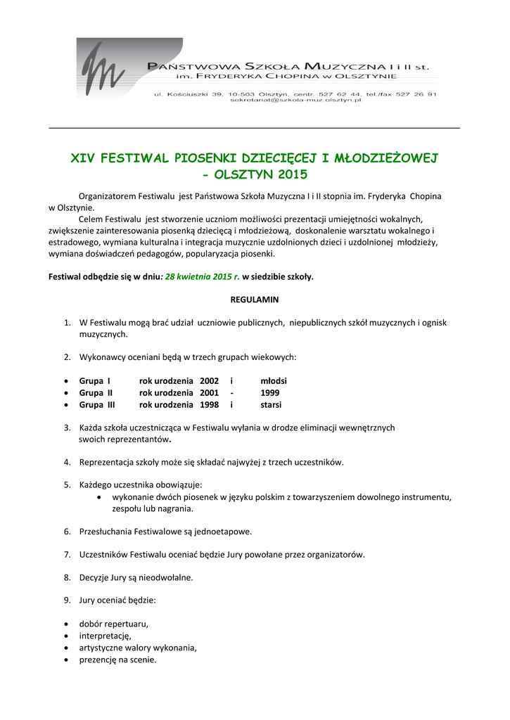 ________________________________________________________________________ XIV FESTIWAL PIOSENKI DZIECIĘCEJ I MŁODZIEŻOWEJ - OLSZTYN 2015 Organizatorem Festiwalu jest Państwowa Szkoła Muzyczna I i II stopnia im. Fryderyka Chopina w Olsztynie. Celem Festiwalu jest stworzenie uczniom możliwości prezentacji umiejętności wokalnych, zwiększenie zainteresowania piosenką dziecięcą i młodzieżową, doskonalenie warsztatu wokalnego i estradowego, wymiana kulturalna i integracja muzycznie uzdolnionych dzieci i uzdolnionej młodzieży, wymiana doświadczeń pedagogów, popularyzacja piosenki. Festiwal odbędzie się w dniu: 28 kwietnia 2015 r. w siedzibie szkoły. REGULAMIN 1. W Festiwalu mogą brać udział uczniowie publicznych, niepublicznych szkół muzycznych i ognisk muzycznych. 2. Wykonawcy oceniani będą w trzech grupach wiekowych: Grupa I Grupa II Grupa III rok urodzenia 2002 rok urodzenia 2001 rok urodzenia 1998 i i młodsi 1999 starsi 3. Każda szkoła uczestnicząca w Festiwalu wyłania w drodze eliminacji wewnętrznych swoich reprezentantów. 4. Reprezentacja szkoły może się składać najwyżej z trzech uczestników. 5. Każdego uczestnika obowiązuje: wykonanie dwóch piosenek w języku polskim z towarzyszeniem dowolnego instrumentu, zespołu lub nagrania. 6. Przesłuchania Festiwalowe są jednoetapowe. 7. Uczestników Festiwalu oceniać będzie Jury powołane przez organizatorów. 8. Decyzje Jury są nieodwołalne. 9. Jury oceniać będzie: dobór repertuaru, interpretację, artystyczne walory wykonania, prezencję na scenie. 10. Wszyscy uczestnicy otrzymają dyplomy uczestnictwa. 11. Laureaci otrzymają dyplomy Laureata i drobne nagrody. 12. Uczestnicy będą występować w kolejności ustalonej przez organizatora. 13. Koszty związane z podróżą i pobytem uczestnicy pokrywają we własnym zakresie. 14. Przesłuchania Festiwalowe otwarte są dla publiczności. 15. Organizator zastrzega sobie prawo zwiększenia ilości reprezentantów. 16. Warunkiem udziału w Konkursie jest zgłoszenie uczestnictwa w terminie do 21 kwietni 2015 r. 17. Wpisowe od każdego uczestnika Festiwalu wynosi 60 zł. Wpłaty należy dokonać na konto: RADA RODZICÓW Państwowej Szkoły Muzycznej I i I I st . w O lsztynie, ul. Ko ściu szk i 3 9 : PKO Bank Polski S. A. Oddział w Olsztynie 73 1440 1228 0000 0000 0189 0198 z dopiskiem Festiwal Piosenki Dziecięcej i Młodzieżowej Potwierdzenie wpłaty prosimy dołączyć do zgłoszenia. Istnieje możliwość wpłaty wpisowego w sekretariacie w dniu Festiwalu. 18. W przypadku rezygnacji z udziału w Festiwalu wpisowe nie podlega zwrotowi. 19. Zgłoszenie uczestnika prosimy przesyłać na załączonym druku e-mailem, faxem lub pocztą na niżej podany adres: PSM I i II stopnia ul. Kościuszki 39, 10-503 Olsztyn Sekretariat PSM I i II St. w Olsztynie tel./ fax 89/ 527 26 91, centrala 89/ 527 62 44 e-mail: [email protected] Kierownik organizacyjny festiwalu: Grażyna Kaznowska – Grygoruk, tel. 502 894 192 Z MUZYCZNYM POZDROWIENIEM PSM OLSZTYN
