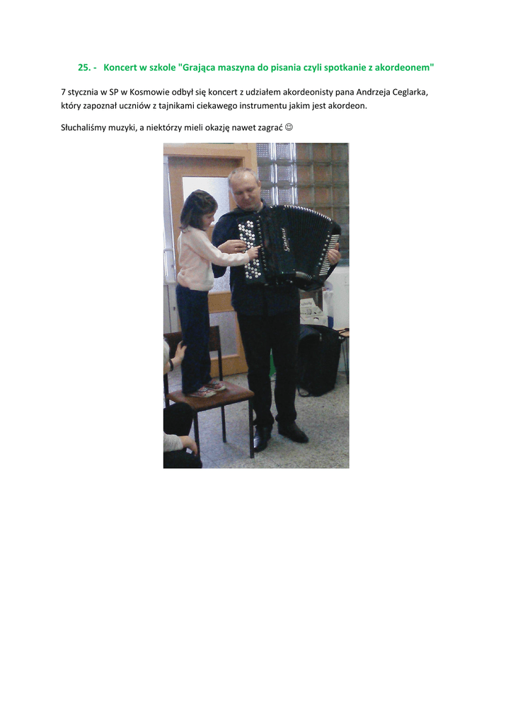 25. - Koncert w szkole "Grająca maszyna do pisania czyli spotkanie z akordeonem" 7 stycznia w SP w Kosmowie odbył się koncert z udziałem akordeonisty pana Andrzeja Ceglarka, który zapoznał uczniów z tajnikami ciekawego instrumentu jakim jest akordeon. Słuchaliśmy muzyki, a niektórzy mieli okazję nawet zagrać