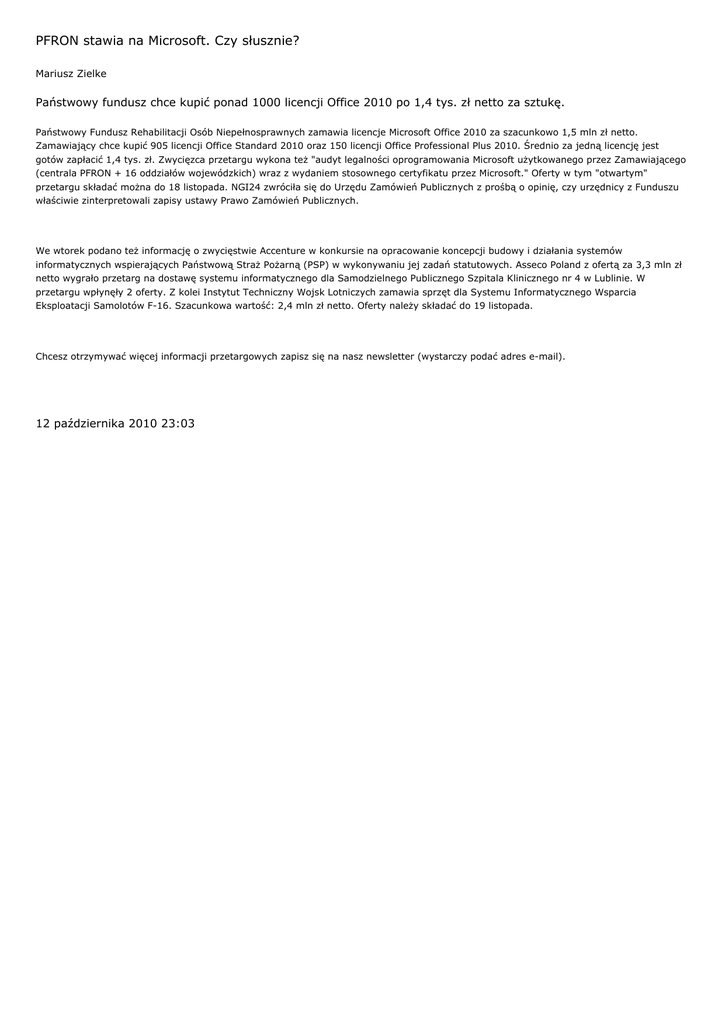 PFRON stawia na Microsoft. Czy słusznie? Mariusz Zielke Państwowy fundusz chce kupić ponad 1000 licencji Office 2010 po 1,4 tys. zł netto za sztukę. Państwowy Fundusz Rehabilitacji Osób Niepełnosprawnych zamawia licencje Microsoft Office 2010 za szacunkowo 1,5 mln zł netto. Zamawiający chce kupić 905 licencji Office Standard 2010 oraz 150 licencji Office Professional Plus 2010. Średnio za jedną licencję jest gotów zapłacić 1,4 tys. zł. Zwycięzca przetargu wykona też "audyt legalności oprogramowania Microsoft użytkowanego przez Zamawiającego (centrala PFRON + 16 oddziałów wojewódzkich) wraz z wydaniem stosownego certyfikatu przez Microsoft." Oferty w tym "otwartym" przetargu składać można do 18 listopada. NGI24 zwróciła się do Urzędu Zamówień Publicznych z prośbą o opinię, czy urzędnicy z Funduszu właściwie zinterpretowali zapisy ustawy Prawo Zamówień Publicznych. We wtorek podano też informację o zwycięstwie Accenture w konkursie na opracowanie koncepcji budowy i działania systemów informatycznych wspierających Państwową Straż Pożarną (PSP) w wykonywaniu jej zadań statutowych. Asseco Poland z ofertą za 3,3 mln zł netto wygrało przetarg na dostawę systemu informatycznego dla Samodzielnego Publicznego Szpitala Klinicznego nr 4 w Lublinie. W przetargu wpłynęły 2 oferty. Z kolei Instytut Techniczny Wojsk Lotniczych zamawia sprzęt dla Systemu Informatycznego Wsparcia Eksploatacji Samolotów F-16. Szacunkowa wartość: 2,4 mln zł netto. Oferty należy składać do 19 listopada. Chcesz otrzymywać więcej informacji przetargowych zapisz się na nasz newsletter (wystarczy podać adres e-mail). 12 października 2010 23:03