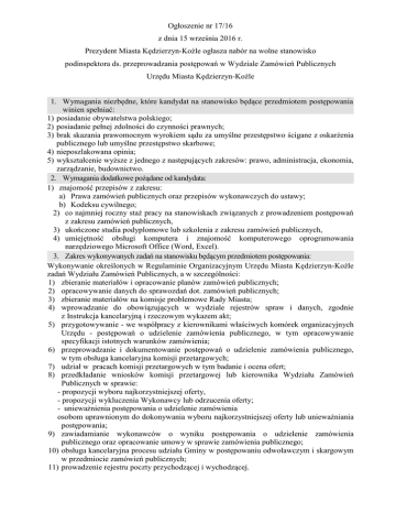 Ogłoszenie nr 17/16 z dnia 15 września 2016 r. Prezydent Miasta Kędzierzyn-Koźle ogłasza nabór na wolne stanowisko podinspektora ds. przeprowadzania postępowań w Wydziale Zamówień Publicznych Urzędu Miasta Kędzierzyn-Koźle 1. Wymagania niezbędne, które kandydat na stanowisko będące przedmiotem postępowania winien spełniać: 1) posiadanie obywatelstwa polskiego; 2) posiadanie pełnej zdolności do czynności prawnych; 3) brak skazania prawomocnym wyrokiem sądu za umyślne przestępstwo ścigane z oskarżenia publicznego lub umyślne przestępstwo skarbowe; 4) nieposzlakowana opinia; 5) wykształcenie wyższe z jednego z następujących zakresów: prawo, administracja, ekonomia, zarządzanie, budownictwo. 2. Wymagania dodatkowe pożądane od kandydata: 1) znajomość przepisów z zakresu: a) Prawa zamówień publicznych oraz przepisów wykonawczych do ustawy; b) Kodeksu cywilnego; 2) co najmniej roczny staż pracy na stanowiskach związanych z prowadzeniem postępowań z zakresu zamówień publicznych, 3) ukończone studia podyplomowe lub szkolenia z zakresu zamówień publicznych, 4) umiejętność obsługi komputera i znajomość komputerowego oprogramowania narzędziowego Microsoft Office (Word, Excel). 3. Zakres wykonywanych zadań na stanowisku będącym przedmiotem postępowania: Wykonywanie określonych w Regulaminie Organizacyjnym Urzędu Miasta Kędzierzyn-Koźle zadań Wydziału Zamówień Publicznych, a w szczególności: 1) zbieranie materiałów i opracowanie planów zamówień publicznych; 2) opracowywanie danych do sprawozdań dot. zamówień publicznych; 3) zbieranie materiałów na komisje problemowe Rady Miasta; 4) wprowadzanie do obowiązujących w wydziale rejestrów spraw i danych, zgodnie z Instrukcja kancelaryjną i rzeczowym wykazem akt; 5) przygotowywanie - we współpracy z kierownikami właściwych komórek organizacyjnych Urzędu - postępowań o udzielenie zamówienia publicznego, w tym opracowywanie specyfikacji istotnych warunków zamówienia; 6) przeprowadzanie i dokumentowanie postępowań o udzielenie zamówienia publicznego, w tym obsługa kancelaryjna komisji przetargowych; 7) udział w pracach komisji przetargowych w tym badanie i ocena ofert; 8) przedkładanie wniosków komisji przetargowej lub kierownika Wydziału Zamówień Publicznych w sprawie: - propozycji wyboru najkorzystniejszej oferty, - propozycji wykluczenia Wykonawcy lub odrzucenia oferty; - unieważnienia postępowania o udzielenie zamówienia osobom uprawnionym do dokonywania wyboru najkorzystniejszej oferty lub unieważniania postępowania; 9) zawiadamianie wykonawców o wyniku postępowania o udzielenie zamówienia publicznego oraz opracowanie umowy w sprawie zamówienia publicznego; 10) obsługa kancelaryjna procesu udziału Gminy w postępowaniu odwoławczym i skargowym w przedmiocie zamówień publicznych; 11) prowadzenie rejestru poczty przychodzącej i wychodzącej. 4. Informacja o warunkach pracy na stanowisku będącym przedmiotem postępowania: 1) miejsce pracy: Urząd Miasta Kędzierzyn-Koźle; 2) obowiązująca norma czasu pracy wynosi 8 godziny na dobę i 40 godzin na tydzień w 3 miesięcznym okresie rozliczeniowym; 3) zastrzega się wolę zatrudnienia wybranego kandydata na okres próbny nie przekraczający 3 miesięcy w celu praktycznego sprawdzenia umiejętności i doświadczenia zawodowego pracownika; 4) jeżeli wybrany kandydat podejmie po raz pierwszy pracę na stanowisku urzędniczym, zostanie skierowany do służby przygotowawczej kończącej się egzaminem; na umotywowany wniosek osoby kierującej komórką organizacyjną, Prezydent Miasta może zwolnić wybranego kandydata z obowiązku odbywania służby przygotowawczej, z zastrzeżeniem konieczności poddania takiego kandydata egzaminowi. 5. Dokumenty wymagane w ofertach pracy składanych przez kandydatów: 1) życiorys zawodowy zawierający wykaz wszystkich dotychczasowych miejsc pracy kandydata z wyszczególnieniem stażu pracy w tych miejscach oraz przebieg nauki z wyszczególnieniem wszystkich ukończonych szkół i uczelni; 2) list motywacyjny; 3) kopia lub odpis dokumentów potwierdzających: a) wykształcenie (dyplom ukończenia szkoły), b) staż pracy (np. świadectw pracy), c) posiadane kwalifikacje i umiejętności (uprawnień, dyplomów, zaświadczeń itp.), d) niepełnosprawność, w przypadku kandydatów, którzy zamierzają skorzystać z uprawnienia do pierwszeństwa do zatrudnienia na stanowiskach urzędniczych, z wyłączeniem kierowniczych stanowisk urzędniczych; 4) oświadczenie o niekaralności za umyślne przestępstwa ścigane z oskarżenia publicznego lub umyślne przestępstwa skarbowe (wybrany kandydat zobowiązany będzie do przedłożenia zaświadczenia o niekaralności wydanego przez Krajowy Rejestr Karny); 5) oświadczenie o posiadaniu przez kandydata pełni praw publicznych. pobierz druk oświadczeń » Załączone: list motywacyjny i życiorys powinny być opatrzone następującą klauzulą: „Wyrażam zgodę na: 1) przetwarzanie moich danych osobowych zawartych w ofercie pracy, 2) przeprowadzenie wywiadu środowiskowego w dotychczasowych miejscach mojej pracy i nauki w celu potwierdzenia spełniania warunku posiadania przeze mnie nieposzlakowanej opinii, dla potrzeb procesu naboru na stanowisko podinspektora ds. przeprowadzania postępowań w Wydziale Zamówień Publicznych Urzędu Miasta Kędzierzyn-Koźle prowadzonego zgodnie z przepisami ustawy z dnia 21 listopada 2008 r. o pracownikach samorządowych (Dz.U. z 2016 r. poz. 902); 6) komisja powołana do zaopiniowania kandydatów na stanowisko podinspektora ds. przeprowadzania postępowań w Wydziale Zamówień Publicznych Urzędu Miasta Kędzierzyn-Koźle uprawniona będzie do ewentualnego żądania dostarczenia brakujących lub uzupełnienia dokumentów złożonych w ofercie pracy w trakcie trwania procesu naboru. Administratorem podanych danych osobowych jest Gmina Kędzierzyn-Koźle, z siedzibą ul. Grzego