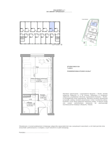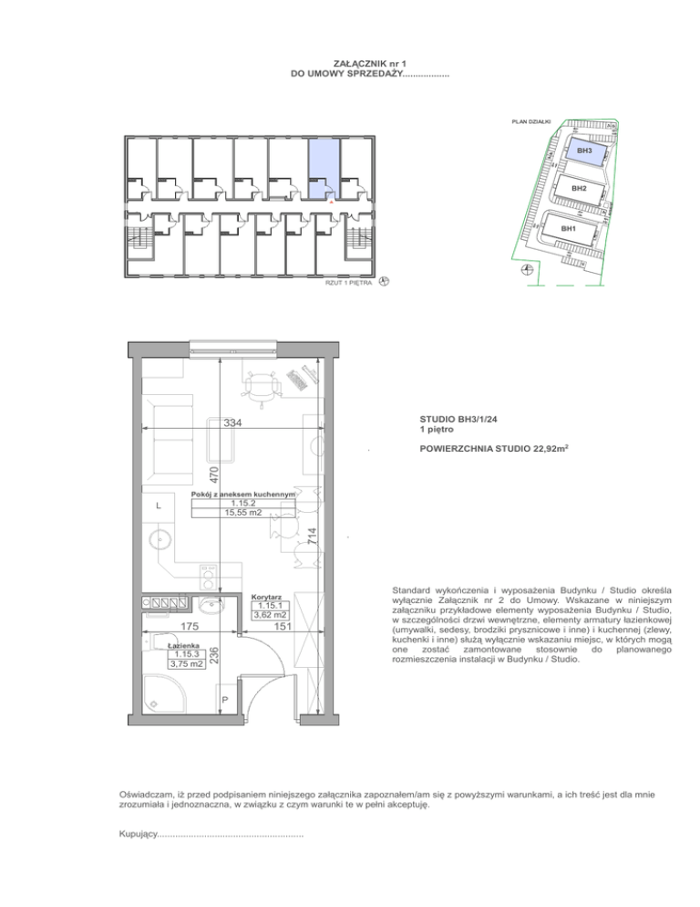 ZAŁĄCZNIK nr 1 DO UMOWY SPRZEDAśY.................. PLAN DZIAŁKI BH3 BH2 BH1 N N RZUT 1 PIĘTRA STUDIO BH3/1/24 1 piętro 334 470 POWIERZCHNIA STUDIO 22,92m2 Pokój z aneksem kuchennym 1.15.2 15,55 m2 714 L Korytarz 1.15.1 3,62 m2 Łazienka 1.15.3 3,75 m2 151 236 175 Standard wykończenia i wyposaŜenia Budynku / Studio określa wyłącznie Załącznik nr 2 do Umowy. Wskazane w niniejszym załączniku przykładowe elementy wyposaŜenia Budynku / Studio, w szczególności drzwi wewnętrzne, elementy armatury łazienkowej (umywalki, sedesy, brodziki prysznicowe i inne) i kuchennej (zlewy, kuchenki i inne) słuŜą wyłącznie wskazaniu miejsc, w których mogą one zostać zamontowane stosownie do planowanego rozmieszczenia instalacji w Budynku / Studio. P Oświadczam, iŜ przed podpisaniem niniejszego załącznika zapoznałem/am się z powyŜszymi warunkami, a ich treść jest dla mnie zrozumiała i jednoznaczna, w związku z czym warunki te w pełni akceptuję. Kupujący........................................................