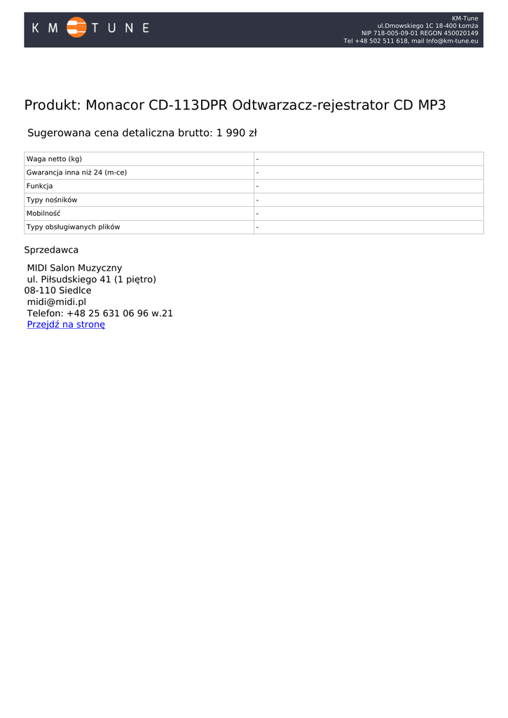 KM-Tune ul.Dmowskiego 1C 18-400 Łomża NIP 718-005-09-01 REGON 450020149 Tel +48 502 511 618, mail [email protected] Produkt: Monacor CD-113DPR Odtwarzacz-rejestrator CD MP3 Sugerowana cena detaliczna brutto: 1 990 zł Waga netto (kg) - Gwarancja inna niż 24 (m-ce) - Funkcja - Typy nośników - Mobilność - Typy obsługiwanych plików - o Sprzedawca MIDI Salon Muzyczny ul. Piłsudskiego 41 (1 piętro) 08-110 Siedlce [email protected] Telefon: +48 25 631 06 96 w.21 Przejdź na stronę Powered by TCPDF (www.tcpdf.org)