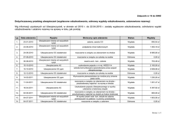 Załącznik nr 10 do SIWZ Dotychczasowy przebieg ubezpieczeń (wypłacone odszkodowania, odmowy wypłaty odszkodowania, ustanowione rezerwy) Wg informacji uzyskanych od Ubezpieczycieli, w okresie od 2010 r. do 22.04.2015 r. zostały wypłacone odszkodowania, odmówiono wypłat odszkodowania i ustalono rezerwy na sprawy w toku, jak poniżej Data zdarzenia Ryzyko Skrócony opis zdarzenia Status 1. 23-01-2010 Ubezpieczeni mienia od wszystkich ryzyk zalanie, awaria CO Wypłata 650,54 zł 2. 23-06-2010 Ubezpieczeni mienia od wszystkich ryzyk podpalenie drzwi balkonowych Wypłata 1 400,19 zł 3. 24-06-2010 Ubezpieczenie OC działalności roszczenie w związku ze zdarzeniem na drodze Wypłata 8 985,90 zł 4. 07-08-2010 Ubezpieczenie OC działalności roszczenie w związku ze szkodą na osobie Odmowa 0,00 zł 5. 30-08-2010 Ubezpieczeni mienia od wszystkich ryzyk awaria wod.- kan., zalanie Wypłata 703,49 zł 6. 15-10-2010 Ubezpieczenie AC Wypłata 2 100,00 zł 7. 15-10-2010 Ubezpieczenie OC ppm uszkodzenie pojazdu o nr rej. WEE2114 szkoda komunikacyjna spowodowana przez pojazd ubezpieczonego Wypłata 2 659,08 zł 8. 12-12-2010 Ubezpieczenie OC działalności roszczenie w związku ze szkodą na osobie Odmowa 0,00 zł 9. 14-03-2011 Ubezpieczenie OC ppm Wymuszenie pierwszeństwa na rondzie przy zmianie pasa ruchu Wypłata 1 230,25 zł 10. 11-04-2011 Ubezpieczenie OC działalności roszczenie w związku ze zdarzeniem na drodze poszkodowany najechał na wyrwę w drodze Wypłata 1 201,47 zł 11. 16-04-2011 Ubezpieczenie AC Uszkodzenie pojazdu Ubezpieczonego w wyniku uderzenia w betonowy słupek Wypłata 5 397,92 zł 12. 04-05-2011 Ubezpieczenie OC działalności Wypłata 800,00 zł 13. 04-07-2011 Wypłata 1 903,56 zł 14. 04-07-2011 Odmowa 0,00 zł Lp. Ubezpieczeni mienia od wszystkich ryzyk Ubezpieczenie OC działalności roszczenie w związku ze zdarzeniem na drodze poszkodowany najechał na ubytek po kratce ściekowej W wyniku awarii wod- kan. doszło do zalania pomieszczeń na paterze i w piwnicy przedszkola. roszczenie w związku z zalaniem Wypłaty Strona 1 z 5 15. 13-07-2011 Ubezpieczeni mienia od wszystkich ryzyk 16. 19-08-2011 Ubezpieczenie OC działalności 17. 11-09-2011 Ubezpieczenie OC działalności 18. 21-09-2011 Ubezpieczenie OC działalności 19. 21-09-2011 Ubezpieczenie OC działalności 20. 28-09-2011 Ubezpieczenie OC działalności 21. 04-11-2011 Ubezpieczenie OC działalności 22. 15-02-2012 Ubezpieczenie OC działalności 23. 14-04-2012 Ubezpieczenie OC działalności 24. 08-05-2012 Ubezpieczenie OC ppm 25. 10-05-2012 Ubezpieczenie OC działalności 26. 14-06-2012 27. 24-06-2012 28. 09-07-2012 29. 09-07-2012 Ubezpieczeni mienia od wszystkich ryzyk Ubezpieczeni mienia od wszystkich ryzyk Ubezpieczeni mienia od wszystkich ryzyk Ubezpieczeni mienia od wszystkich ryzyk W wyniku awarii wod- kan zalanie dwóch pięter budynku. W wyniku upadku drzewa, doszło do uszkodzenia pojazdu, pojemnika na śmieci, garażu oraz elewacji budynku. W skutek uderzenia głową w niezabezpieczoną wiatę poszkodowany doznał obrażeń ciała roszczenie w związku ze szkodą na mieniu najechanie na wyrwę w jezdni rowerem na skutek ugryzienia przez bezpańskiego psa poszkodowany doznał obrażeń ciała (ugryzienie w udo prawej nogi, brzuch, przedramienia rąk i dłoni lewej ręki poszkodowana w wyniku upadku (wyrwa w jezdni) doznała obrażeń ciała roszczenie w związku ze zdarzeniem na parkingu ubezpieczonego - poszkodowany najechał na wystający pniak drzewa poszkodowany został ugryziony przez bezpańskiego psa - rozerwana nogawka spodni, ugryzienie ręki roszczenie w związku ze szkodą na osobie upadek na rowerze Uszkodzony pojazd VW Passat. Kolizja z winy MOSIR Rypin (VW Transporter, nr rej. CRY 60GG) na skutek ugryzienia przez bezpańskiego psa poszkodowany doznał obrażeń ciała (ugryzienie w udo prawej nogi, brzuch, przedramienia rąk i dłoni lewej ręki W wyniku huraganowych wiatrów, deszczu nawalnego doszło do uszkodzenia namiotu W wyniku wyładowań atmosferycznych uszkodzony został system sygnalizacji zabezpieczającej. Wypłata 4 942,76 zł Wypłata 1 121,55 zł Wypłata 9 000,00 zł Odmowa 0,00 zł Wypłata 4 800,00 zł Odmowa 0,00 zł Wypłata 4 136,71 zł Wypłata 770,00 zł Odmowa - art. 415 KC 0,00 zł Wypłata 4 378,94 zł Wypłata 2 700,00 zł Wypłata 1 793,34 zł Wypłata 4 678,92 zł uszkodzenie maszyny w wyniku przepięcia Wypłata 6 642,00 zł dewastacja Wypłata 450,00 zł Strona 2 z 5 30. 15-07-2012 Ubezpieczenie OC działalności Małoletnia poszkodowana została ugryziona w górną wargę przez bezpańskiego psa Odmowa przyczyną odmowy wypłaty odszkodowania jest nie udowodnienie wszystkich przesłanek odpowiedzialności przez poszkodowaną (art. 415 KC w zw. z art. 6 KC) 31. 05-08-2012 Ubezpieczenie OC działalności Szkoda osobowa z OC upadek z roweru najechanie na niebezpieczny kanał deszczowy Odmowa 0,00 zł 32. 22-08-2012 Ubezpieczeni mienia od wszystkich ryzyk Nieznani sprawcy uszkodzili huśtawkę (złamana drewniana belka) Wypłata 400,00 zł 33. 05-10-2012 Ubezpieczenie OC działalności 34. 06-12-2012 Ubezpieczenie OC działalności 35. 21-01-2013 Ubezpieczenie OC działalności 36. 06-02-2013 Ubezpieczenie OC działalności 37. 26-03-2013 Ubezpieczenie OC ppm Odmowa brak odpowiedzialności Roszczenia poszkodowanej w związku z obrażeniami Ubezpieczonego; ciała droga nie jest w zarządzie ubezpieczonego Odmowa brak Poszkodowana doznała obrażeń ciała w wyniku odpowiedzialności, art. poślizgnięcia się. 429 kc Odmowa brak W wyniku upadku poszkodowana doznała obrażeń ciała. odpowiedzialności, art. 429 kc Wskutek pogryzienia przez bezpańskiego psa poszkodowany doznał obrażeń ciała w postaci Wypłata uszkodzenia środkowego palca lewej ręki Uszkodzony pojazd. Sprawca uderzył w tył pojazdu poprzedzającego poszkodowanego w korku Wypłata 0,00 zł 0,00 zł 0,00 zł 0,00 zł 2 500,00 zł 570,86 zł Strona 3 z 5 38. 02-04-2013 Ubezpieczenie