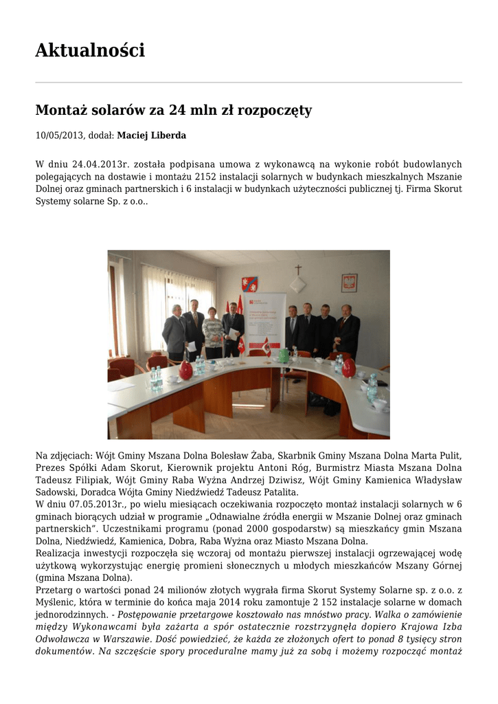 Aktualności Montaż solarów za 24 mln zł rozpoczęty 10/05/2013, dodał: Maciej Liberda W dniu 24.04.2013r. została podpisana umowa z wykonawcą na wykonie robót budowlanych polegających na dostawie i montażu 2152 instalacji solarnych w budynkach mieszkalnych Mszanie Dolnej oraz gminach partnerskich i 6 instalacji w budynkach użyteczności publicznej tj. Firma Skorut Systemy solarne Sp. z o.o.. Na zdjęciach: Wójt Gminy Mszana Dolna Bolesław Żaba, Skarbnik Gminy Mszana Dolna Marta Pulit, Prezes Spółki Adam Skorut, Kierownik projektu Antoni Róg, Burmistrz Miasta Mszana Dolna Tadeusz Filipiak, Wójt Gminy Raba Wyżna Andrzej Dziwisz, Wójt Gminy Kamienica Władysław Sadowski, Doradca Wójta Gminy Niedźwiedź Tadeusz Patalita. W dniu 07.05.2013r., po wielu miesiącach oczekiwania rozpoczęto montaż instalacji solarnych w 6 gminach biorących udział w programie „Odnawialne źródła energii w Mszanie Dolnej oraz gminach partnerskich”. Uczestnikami programu (ponad 2000 gospodarstw) są mieszkańcy gmin Mszana Dolna, Niedźwiedź, Kamienica, Dobra, Raba Wyżna oraz Miasto Mszana Dolna. Realizacja inwestycji rozpoczęła się wczoraj od montażu pierwszej instalacji ogrzewającej wodę użytkową wykorzystując energię promieni słonecznych u młodych mieszkańców Mszany Górnej (gmina Mszana Dolna). Przetarg o wartości ponad 24 milionów złotych wygrała firma Skorut Systemy Solarne sp. z o.o. z Myślenic, która w terminie do końca maja 2014 roku zamontuje 2 152 instalacje solarne w domach jednorodzinnych. - Postępowanie przetargowe kosztowało nas mnóstwo pracy. Walka o zamówienie między Wykonawcami była zażarta a spór ostatecznie rozstrzygnęła dopiero Krajowa Izba Odwoławcza w Warszawie. Dość powiedzieć, że każda ze złożonych ofert to ponad 8 tysięcy stron dokumentów. Na szczęście spory proceduralne mamy już za sobą i możemy rozpocząć montaż instalacji. Przypominamy, że dotacja dla mieszkańców wynosi 85% do ceny netto. Jest to największa dotacja w Polsce na tego typu zadanie. Mieszkańcy w zależności od wielkości systemu (dwa lub trzy i więcej panele) zapłacą łącznie (z zaliczką, którą już wpłacili w ubiegłym roku) – od 2 000 do 3 500 zł – mówi Antoni Róg. - To zdecydowanie mniej niż początkowo zakładaliśmy. W ramach programu każda gmina uczestnicząca w projekcie montuje nie tylko kolektory, ale wykonuje wszystkie roboty związane z instalacją (przewody, stacja pompowa, sterownik zbiornik, czujniki temperatury) oraz zapewnia w ciągu 5 lat bez dodatkowych opłat wymianę płynu w systemie, serwis oraz przeglądy gwarancyjne. - Zgodnie z zatwierdzonym harmonogramem robót do końca września tego roku powinno zostać już zamontowanych ponad 800 instalacji – dodaje Antoni Róg. - Kolejne w następnych miesiącach w zależności od warunków pogodowych. Obecnie kończą się spotkania informacyjne dla mieszkańców uczestniczących w projekcie w każdej z gmin. - Na spotkaniach informujemy o warunkach i szczegółach realizowanego programu – dodaje. Instalacji będzie więcej Koszt montażu instalacji w przetargu wyszedł niższy niż zakładano. - Dzięki temu istnieje możliwość wykonania dodatkowych ok 400 instancji. Jesteśmy cały czas w kontakcie z Władzą Wdrażającą Szwajcarsko - Polskiego Programu Współpracy. Dzięki akceptacji wójtów i burmistrza gmin biorących udział w projekcie wspólnie z mec. Krzysztofem Smagą, sprawującym opiekę prawną nad realizacją programu, odbyliśmy serię rozmów ze stroną szwajcarską i mamy już wstępną akceptację dla poszerzania projektu o kwotę oszczędności przetargowych. Dlatego już dzisiaj zachęcamy do wpisywania się pozostałych chętnych na listy rezerwowe. Tak korzystnego dla mieszkańców programu w najbliższym czasie już, bowiem nie będzie – mówi Antoni Róg. - Listy rezerwowe tworzy każda z gmin biorących udział w projekcie i w godzinach pracy urzędu można się zapisywać. Upoważnienie Kierownikowi robót Panu Wojciechowi Gocał wręcza Wójt Gminy, obok widoczny jest również Inspektor Nadzoru Arkadiusz Zembura. Na zdjęciach uczestnicy właściciele domu, Wójt Gminy Bolesław Żaba, Prezes Spółki Adam Skorut, Kierownik projektu Antoni Róg. Wójt Gminy Mszana Dolna Bolesław Żaba zdjęcia