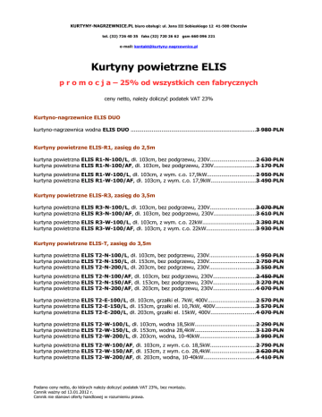 KURTYNY-NAGRZEWNICE.PL biuro obsługi: ul. Jana III Sobieskiego 12 41-500 Chorzów tel. (32) 726 40 35 faks (32) 720 26 62 gsm 660 096 221 e-mail: [email protected] Kurtyny powietrzne ELIS p r o m o c j a – 25% od wszystkich cen fabrycznych ceny netto, należy doliczyć podatek VAT 23% Kurtyno-nagrzewnice ELIS DUO kurtyno-nagrzewnica wodna ELIS DUO .............................................................................3 980 PLN Kurtyny powietrzne ELIS-R1, zasięg do 2,5m kurtyna powietrzna ELIS R1-N-100/L, dł. 103cm, bez podgrzewu, 230V............................2 630 PLN kurtyna powietrzna ELIS R1-N-100/AF, dł. 103cm, bez podgrzewu, 230V..........................3 170 PLN kurtyna powietrzna ELIS R1-W-100/L, dł. 103cm, z wym. c.o. 17,9kW..............................2 950 PLN kurtyna powietrzna ELIS R1-W-100/AF, dł. 103cm, z wym. c.o. 17,9kW...........................3 490 PLN Kurtyny powietrzne ELIS-R3, zasięg do 3,5m kurtyna powietrzna ELIS R3-N-100/L, dł. 103cm, bez podgrzewu, 230V............................3 070 PLN kurtyna powietrzna ELIS R3-N-100/AF, dł. 103cm, bez podgrzewu, 230V..........................3 610 PLN kurtyna powietrzna ELIS R3-W-100/L, dł. 103cm, z wym. c.o. 22kW.................................3 390 PLN kurtyna powietrzna ELIS R3-W-100/AF, dł. 103cm, z wym. c.o. 22kW..............................3 930 PLN Kurtyny powietrzne ELIS-T, zasięg do 3,5m kurtyna powietrzna ELIS T2-N-100/L, dł. 103cm, bez podgrzewu, 230V............................1 950 PLN kurtyna powietrzna ELIS T2-N-150/L, dł. 153cm, bez podgrzewu, 230V............................2 750 PLN kurtyna powietrzna ELIS T2-N-200/L, dł. 203cm, bez podgrzewu, 230V............................3 550 PLN kurtyna powietrzna ELIS T2-N-100/AF, dł. 103cm, bez podgrzewu, 230V..........................2 450 PLN kurtyna powietrzna ELIS T2-N-150/AF, dł. 153cm, bez podgrzewu, 230V..........................3 270 PLN kurtyna powietrzna ELIS T2-N-200/AF, dł. 203cm, bez podgrzewu, 230V..........................4 070 PLN kurtyna powietrzna ELIS T2-E-100/L, dł. 103cm, grzałki el. 7kW, 400V.............................2 570 PLN kurtyna powietrzna ELIS T2-E-150/L, dł. 153cm, grzałki el. 10,7kW, 400V.........................3 570 PLN kurtyna powietrzna ELIS T2-E-200/L, dł. 203cm, grzałki el. 15kW, 400V............................4 070 PLN kurtyna powietrzna ELIS T2-W-100/L, dł. 103cm, wodna 18,5kW.....................................2 290 PLN kurtyna powietrzna ELIS T2-W-150/L, dł. 153cm, wodna 28,4kW.....................................3 120 PLN kurtyna powietrzna ELIS T2-W-200/L, dł. 203cm, wodna, 10-40kW..................................3 990 PLN kurtyna powietrzna ELIS T2-W-100/AF, dł. 103cm, z wym. c.o. 18,5kW............................2 790 PLN kurtyna powietrzna ELIS T2-W-150/AF, dł. 153cm, z wym. c.o. 28,4kW............................3 620 PLN kurtyna powietrzna ELIS T2-W-200/AF, dł. 203cm, wodna, 10-40kW................................4 410 PLN Podano ceny netto, do których należy doliczyć podatek VAT 23%, bez montażu. Cennik ważny od 13.01.2012 r. Cennik nie stanowi oferty handlowej w rozumieniu prawa. KURTYNY-NAGRZEWNICE.PL biuro obsługi: ul. Jana III Sobieskiego 12 41-500 Chorzów tel. (32) 726 40 35 faks (32) 720 26 62 gsm 660 096 221 e-mail: [email protected] Akcesoria wsporniki DUO/ELIS R .....................................................................................................150 PLN wsporniki ELIS T ..............................................................................................................150 PLN SRS, zawór przelotowy 1/2” z siłownikiem ............................................................................250 PLN SRS3d, zawór trójdrogowy 1/2” z siłownikiem ......................................................................250 PLN TA, przełącznik obrotów wentylatora......................................................................................126 PLN TS, termostat ścienny z wbudowanym tróstopniowym przełącznikiem obrotów wentylatora......256 PLN Podano ceny netto, do których należy doliczyć podatek VAT 23%, bez montażu. Cennik ważny od 13.01.2012 r. Cennik nie stanowi oferty handlowej w rozumieniu prawa.