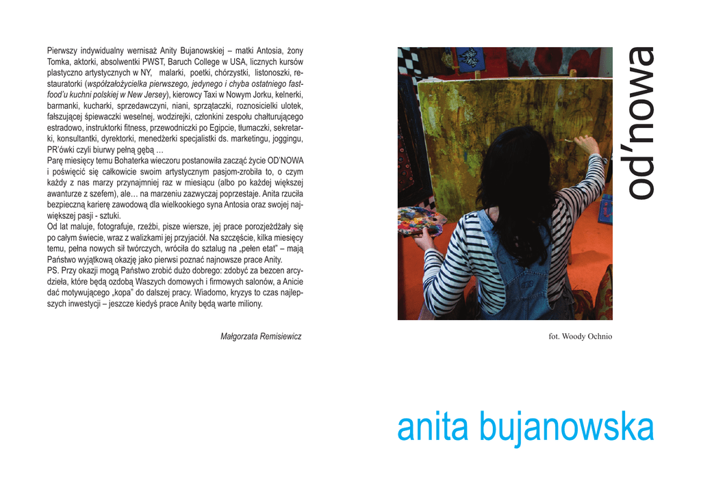 Pierwszy indywidualny wernisaż Anity Bujanowskiej – matki Antosia, żony Tomka, aktorki, absolwentki PWST, Baruch College w USA, licznych kursów plastyczno artystycznych w NY, malarki, poetki, chórzystki, listonoszki, restauratorki (współzałożycielka pierwszego, jedynego i chyba ostatniego fastfood’u kuchni polskiej w New Jersey), kierowcy Taxi w Nowym Jorku, kelnerki, barmanki, kucharki, sprzedawczyni, niani, sprzątaczki, roznosicielki ulotek, fałszującej śpiewaczki weselnej, wodzirejki, członkini zespołu chałturującego estradowo, instruktorki fitness, przewodniczki po Egipcie, tłumaczki, sekretarki, konsultantki, dyrektorki, menedżerki specjalistki ds. marketingu, joggingu, PR’ówki czyli biurwy pełną gębą … Parę miesięcy temu Bohaterka wieczoru postanowiła zacząć życie OD’NOWA i poświęcić się całkowicie swoim artystycznym pasjom-zrobiła to, o czym każdy z nas marzy przynajmniej raz w miesiącu (albo po każdej większej awanturze z szefem), ale… na marzeniu zazwyczaj poprzestaje. Anita rzuciła bezpieczną karierę zawodową dla wielkookiego syna Antosia oraz swojej największej pasji - sztuki. Od lat maluje, fotografuje, rzeźbi, pisze wiersze, jej prace porozjeżdżały się po całym świecie, wraz z walizkami jej przyjaciół. Na szczęście, kilka miesięcy temu, pełna nowych sił twórczych, wróciła do sztalug na „pełen etat” – mają Państwo wyjątkową okazję jako pierwsi poznać najnowsze prace Anity. PS. Przy okazji mogą Państwo zrobić dużo dobrego: zdobyć za bezcen arcydzieła, które będą ozdobą Waszych domowych i firmowych salonów, a Anicie dać motywującego „kopa” do dalszej pracy. Wiadomo, kryzys to czas najlepszych inwestycji – jeszcze kiedyś prace Anity będą warte miliony. Małgorzata Remisiewicz fot. Woody Ochnio Zapraszam na spacer po BALSAMIE wśród obrazów, wypatrując tu i ówdzie słowa rozsypane na płótnach. Cykl: Z PRZYMRUŻENIEM OKA OkoOnoLemon Grass Red Eye Disctrict Cyrk w małym mieście sprzedany sprzedany 3500 PLN Cykl: IN’HORROR DESIGN Zaułek Dumania Pustynia Dymania Wchody 999 PLN 998 PLN 987 PLN Cykl: TERA’KOTA U Kotkiewiczów Wannda Samotność Zaraz Wracam 1200 PLN 1400 PLN 300 PLN 1300 PLN Cykl: A PO LECIE NASTANIE JESIEŃ Wspomnienia z Grabarki kolekcja prywatna Liście 800 PLN Drzewo Synaju 4000 PLN Las 1 1500 PLN Las 2 2500 PLN Kamienie 1 4500 PLN Kamienie 2 1200 PLN Za oknem szarość 1300 PLN Inne: Tańczący Święty spokój Poetry PatchWork Zapiski Miasto Gienia i Tosiek - monidło Moja druga połowa NASTROJE Maki 3000 PLN 1100 PLN 4000 PLN 1200 PLN 1500 PLN kolekcja prywatna kolekcja prywatna 500 PLN 1400 PLN całość (1000+200+200)