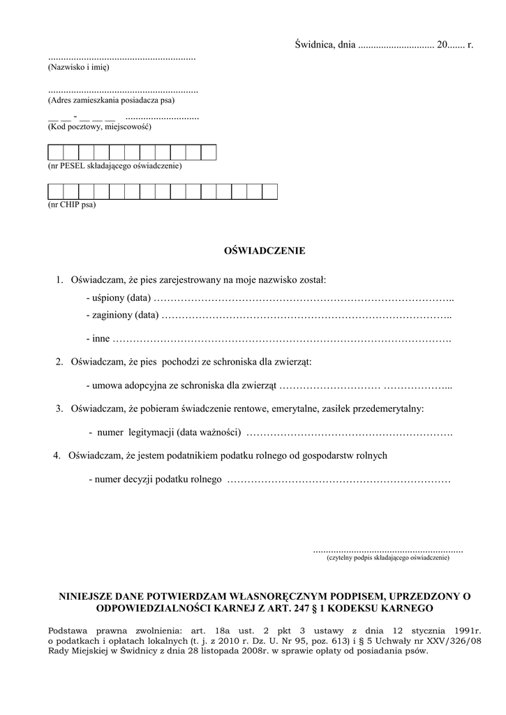 Świdnica, dnia .............................. 20....... r. .......................................................... (Nazwisko i imię) ........................................................... (Adres zamieszkania posiadacza psa) __ __ - __ __ __ ............................. (Kod pocztowy, miejscowość) (nr PESEL składającego oświadczenie) (nr CHIP psa) OŚWIADCZENIE 1. Oświadczam, że pies zarejestrowany na moje nazwisko został: - uśpiony (data) …………………………………………………………………………….. - zaginiony (data) ………………………………………………………………………….. - inne ………………………………………………………………………………………. 2. Oświadczam, że pies pochodzi ze schroniska dla zwierząt: - umowa adopcyjna ze schroniska dla zwierząt ………………………… ………………... 3. Oświadczam, że pobieram świadczenie rentowe, emerytalne, zasiłek przedemerytalny: - numer legitymacji (data ważności) ……………………………………………………. 4. Oświadczam, że jestem podatnikiem podatku rolnego od gospodarstw rolnych - numer decyzji podatku rolnego ………………………………………………………… ........................................................... (czytelny podpis składającego oświadczenie) NINIEJSZE DANE POTWIERDZAM WŁASNORĘCZNYM PODPISEM, UPRZEDZONY O ODPOWIEDZIALNOŚCI KARNEJ Z ART. 247 § 1 KODEKSU KARNEGO Podstawa prawna zwolnienia: art. 18a ust. 2 pkt 3 ustawy z dnia 12 stycznia 1991r. o podatkach i opłatach lokalnych (t. j. z 2010 r. Dz. U. Nr 95, poz. 613) i § 5 Uchwały nr XXV/326/08 Rady Miejskiej w Świdnicy z dnia 28 listopada 2008r. w sprawie opłaty od posiadania psów.
