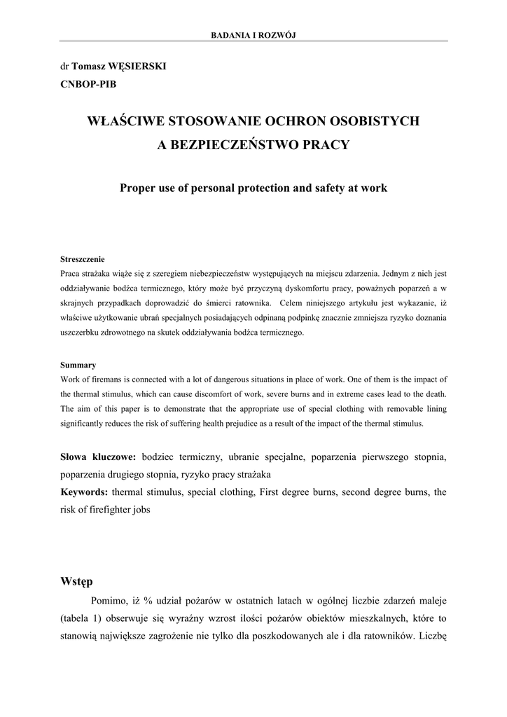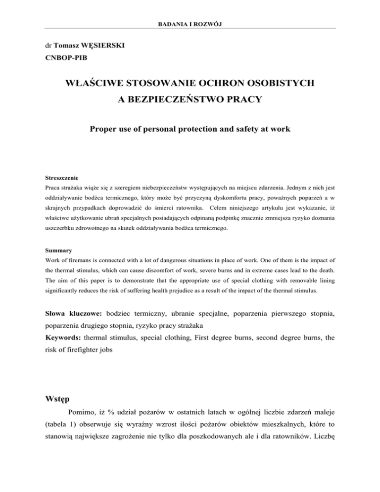BADANIA I ROZWÓJ dr Tomasz WĘSIERSKI CNBOP-PIB WŁAŚCIWE STOSOWANIE OCHRON OSOBISTYCH A BEZPIECZEŃSTWO PRACY Proper use of personal protection and safety at work Streszczenie Praca straŜaka wiąŜe się z szeregiem niebezpieczeństw występujących na miejscu zdarzenia. Jednym z nich jest oddziaływanie bodźca termicznego, który moŜe być przyczyną dyskomfortu pracy, powaŜnych poparzeń a w skrajnych przypadkach doprowadzić do śmierci ratownika. Celem niniejszego artykułu jest wykazanie, iŜ właściwe uŜytkowanie ubrań specjalnych posiadających odpinaną podpinkę znacznie zmniejsza ryzyko doznania uszczerbku zdrowotnego na skutek oddziaływania bodźca termicznego. Summary Work of firemans is connected with a lot of dangerous situations in place of work. One of them is the impact of the thermal stimulus, which can cause discomfort of work, severe burns and in extreme cases lead to the death. The aim of this paper is to demonstrate that the appropriate use of special clothing with removable lining significantly reduces the risk of suffering health prejudice as a result of the impact of the thermal stimulus. Słowa kluczowe: bodziec termiczny, ubranie specjalne, poparzenia pierwszego stopnia, poparzenia drugiego stopnia, ryzyko pracy straŜaka Keywords: thermal stimulus, special clothing, First degree burns, second degree burns, the risk of firefighter jobs Wstęp Pomimo, iŜ % udział poŜarów w ostatnich latach w ogólnej liczbie zdarzeń maleje (tabela 1) obserwuje się wyraźny wzrost ilości poŜarów obiektów mieszkalnych, które to stanowią największe zagroŜenie nie tylko dla poszkodowanych ale i dla ratowników. Liczbę BADANIA I ROZWÓJ zdarzeń obejmującą sumę poŜarów domków jednorodzinnych, obiektów mieszkalnych wielorodzinnych oraz obiektów mieszkalnych w gospodarstwach rolnych na przestrzeni obejmującej lata 1993-2010 przedstawiono na rysunku 1. Nachylenie prostej regresyjnej wyraźnie wskazuje, iŜ liczba poŜarów obiektów mieszkalnych rośnie rocznie przeciętnie o 552 pozycje. Zatem prosto moŜna wywnioskować, iŜ ryzyko naraŜenia ratownika na czynniki termiczne w tego typu poŜarach wzrasta. Przyjęte załoŜenia nie są przypadkowe. Wymienione grupy poŜarów stanowią przeciętnie około 90% wszystkich poŜarów obiektów mieszkalnych i są łatwo definiowalne ze względu na miejsce występowania. Tabela 1. Ilość zdarzeń (F- poŜary w tysiącach, M- miejscowe zagroŜenia w tysiącach) oraz ich procentowy udział w strukturze (%F – poŜarów, %M – miejscowych zagroŜeń) M F [1000] [1000] %F %M 2000 135,889 122,983 52,5 47,5 2001 116,602 166,912 41,1 58,9 2002 151,026 197,491 43,3 56,7 2003 220,855 169,221 56,6 43,4 2004 146,728 200,553 42,3 57,7 2005 184,316 201,781 47,7 52,3 2006 165,353 261,344 38,8 61,2 2007 151,069 274,624 35,5 64,5 2008 165,19 280,832 37,0 63,0 2009 159,122 277,887 36,4 63,6 Rok BADANIA I ROZWÓJ 26000 24000 nW 22000 20000 y = 551,52x - 1E+06 R2 = 0,96 18000 16000 14000 1990 1995 2000 2005 Rok 2010 Wykres 1. Sumaryczna liczba poŜarów w wybranych grupach obiektów mieszkalnych za okres 1993-2010. Sumowaniu podlegały poŜary 1. obiektów mieszkalnych wielorodzinnych 2. domków jednorodzinne 3) obiektów mieszkalnych w rolnictwie. Ciekawych wniosków do analizy dostarczyć nam mogą dane dotyczące śmiertelności oraz ilości osób rannych spośród straŜaków (tabela 2). Wartość przedziału ufności ∆x oraz współczynnik zmienności Vx wyraźnie wskazuje na duŜy rozrzut i nieprzewidywalność statystyki w grupie badanej co potwierdzają dodatkowo bardzo niskie współczynniki korelacji regresji R2 (tabela 3) pomiędzy ilością zdarzeń (poŜary, miejscowe zagroŜenia), a skutkami (ofiary śmiertelne, ranni). Ich wielkość wyraźnie wskazuje równieŜ na zdecydowanie większą nieprzewidywalność ryzyka podczas przebiegu poŜarów (R2~0,014) niŜ ma to miejsce w przypadku miejscowych zagroŜeń (0,2< R2 <0,3). Analiza ryzyka wyraŜająca skutki na 1000 zdarzeń wyraŜona poprzez RMs, RMr, RFs, RFr takŜe wyraźnie wskazuje na wyŜszą urazowość akcji poŜarowych w stosunku do miejscowych zagroŜeń (RFs/RMs=1,47; RFr/RMr=1,20). A zatem właściwa ochrona ratownika podczas akcji poŜarowych wydaje się niezwykle istotna. BADANIA I ROZWÓJ Tabela 2. Ilość rannych oraz ofiar śmiertelnych oraz ryzyko zajścia skutku na 1000 zdarzeń wśród straŜaków w okresie pomiędzy 2000 a 2010 rokiem. Oznaczenia: Miejscowe zagroŜenia PoŜary Rok śmiertelne ranni śmiertelne ranni RMs RMr RFs RFr 2000 0 153 2 338 0,0000 1,13 0,0163 2,75 2001 2 181 3 238 0,0172 1,55 0,0180 1,43 2002 0 200 2 268 0,0000 1,32 0,0101 1,36 2003 2 175 5 350 0,0091 0,79 0,0295 2,07 2004 4 188 4 304 0,0273 1,28 0,0199 1,52 2005 2 162 0 315 0,0109 0,88 0,0000 1,56 2006 0 162 3 274 0,0000 0,98 0,0115 1,05 2007 0 262 1 238 0,0000 1,73 0,0036 0,87 2008 1 226 0 271 0,0061 1,37 0,0000 0,96 2009 1 183 1 284 0,0063 1,15 0,0036 1,02 x= 12 1892 21 2880 - - - - xsr= 1,2 189,2 2,1 288,0 0,0077 1,22 0,0113 1,46 Sx= 1,2 31,4 1,6 36,4 0,0085 0,28 0,0092 0,55 x= 0,8 19,5 1,0 22,5 0,0053 0,17 0,0057 0,34 Vx= 104 17 75 13 111 23 82 38 RFs= ilość ofiar śmiertelnych wśród straŜaków przypadająca na 1000 poŜarów RFr= ilość rannych straŜaków przypadająca na 1000 poŜarów RMs= ilość ofiar śmiertelnych wśród straŜaków przypadająca na 1000 miejscowych zagroŜeń RMr= ilość rannych straŜaków przypadająca na 1000 miejscowych zagroŜeń Σx= suma; xsr = wartość średnia; Sx = odchylenie standardowe w populacji; ∆x = przedział ufności na poziomie istotności α = 0,05; Vx = współczynnik zmienności BADANIA I ROZWÓJ Tabela 3. Wartość współczynnika korelacji R2 wyraŜająca zaleŜność skutek-zdarzenie dla poŜarów i miejscowych zagroŜeń. Zakres analizy: 2000 – 2009. R2 Współczynnik korelacji pomiędzy; ilością ofiar śmiertelnych a ilością poŜarów 0,014 ilością rannych a ilością poŜarów 0,014 ilośc