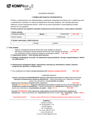 ZLECENIE DIAGNOZY – FORMULARZ DANYCH TECHNICZNYCH Prosimy o wydrukowanie i jak najdokładniejsze wypełnienie niniejszego formularza oraz o wysłanie go wraz z uszkodzonym nośnikiem. Im więcej szczegółowych informacji uzyskamy, tym szybciej wykonamy diagnozę i proces odzyskiwania danych. Jeżeli nie są znane odpowiedzi w poszczególnych polach, prosimy ich nie wypełniać. Prosimy postarać się wypełnić wszystkie wytłuszczone pola dokumentu, a pola wyboru zakreślić. 1. Dane nośnika Producent nośnika: Na gwarancji? Model: Numer seryjny: TAK / NIE* Pojemność: 2. System operacyjny (jeżeli dotyczy) wersja: system 3. Tryb analizy • • logiczny (urządzenie sprawne technicznie, brak dostępu do danych) : TAK / NIE* techniczny (urządzenie nie jest sprawne technicznie, brak dostępu do danych) : TAK / NIE* o czy uszkodzony nośnik może być rozebrany na potrzeby analizy?: TAK / NIE* 4. Organizacja danych – ilość partycji (wolumenów): 5. Katalogi, podkatalogi, oraz pliki do odzyskania (wg priorytetów), lub typy najważniejszych plików do odtworzenia **: 6. Okoliczności wystąpienia błędu, wykonywane operacje po stwierdzeniu usterki, używane programy itp. (prosimy o rzetelny opis) : 7. Czy urządzenie po analizie ma być zwrócone lub odesłane (usługa płatna)? TAK / NIE* – WARUNKI ANALIZY Analiza w priorytecie STANDARDOWYM. Diagnoza wykonywana jest średnio w czasie od 6-ciu do 10 dni roboczych od dostarczenia nośnika do laboratorium – nośnik przychodzący jest analizowany w trakcie godzin pracy laboratorium, od poniedziałku do piątku). Diagnoza jest warunkowo bezpłatna (patrz regulamin): TAK / NIE* Priorytet PRZYSPIESZONY. Diagnoza wykonywana jest średnio w czasie od 2 do 5-ciu dni roboczych od dostarczenia nośnika do laboratorium – nośnik przychodzący jest niezwłocznie analizowany w trakcie godzin pracy laboratorium, od poniedziałku do piątku – koszt – 400 zł : TAK / NIE* Priorytet EKSPRESOWY (czas wykonania analizy biegnie od momentu dostarczenia urządzenia do laboratorium – nośnik przychodzący jest niezwłocznie analizowany w trybie 7 dni / 24 godziny) – koszt – 1000 zł : TAK / NIE* * odpowiednie zakreślić ** proszę o użycie odwrotu stron na dodatkowe adnotacje, jeżeli wystąpi taka potrzeba KOMPikor Maciej Licbarski Ul. Warszawska 1/16 06-500 Mława Tel. 23 6852424 Tel. mob. 660 614 619 www.kompikor.pl e-mail: [email protected] ZLECENIE DIAGNOZY - REGULAMIN 1. Niniejsze zamówienie jest traktowane jako formalne zlecenie wykonania analizy możliwości odzyskania danych. Zobowiązanie wynikające z niniejszego zlecenia jest dla Zleceniobiorcy, zobowiązaniem starannego działania, a nie zobowiązaniem skutku. 2. 3. O podjęciu lub nie, procedur odtworzenia danych Zleceniodawca decyduje po otrzymaniu wyników diagnozy. Usługa diagnozy jest płatna za wyjątkiem diagnozy trybu technicznego wykonanej w priorytecie standardowym z wynikiem negatywnym. Wysokość wynagrodzenia należnego Usługobiorcy zawarta jest w cenniku usług znajdującym się na stronie internetowej http://www.kompikor.pl/cennik/odzyskiwanie-danych. Zleceniodawca potwierdza, iż zapoznał się z treścią cennika usług, o którym mowa w zdaniu poprzednim, najpóźniej w dacie niniejszego zlecenia, wpisanej poniżej przy podpisie osoby upoważnionej do reprezentacji. Ponadto Zleceniodawca ponosi koszty części niezbędnych do wykonania usługi, jeżeli tak wynika z odrębnych ustaleń stron. 4. Dla dysków twardych, które były samodzielnie rozbierane lub po inspekcji w innych firmach, analiza jest zawsze odpłatna, płatność musi być wykonana z góry, koszt cennikowy podwyższany jest o 499 zł . 5. Cena wykonania usługi odzyskania danych podawana jest w kalkulacji cenowej po wykonaniu analizy. Zakresy cenowe, których dotyczą określone typy przypadków podane są w cenniku usług na stronie internetowej Zleceniobiorcy – http://kompikor.pl/cennik/odzyskiwanie-danych w dziale cennik. 6. Pisemną analizę z usługi Zleceniobiorca wystawi wyłącznie na żądanie, a bezpłatnie, jeśli usługa została wykonana w priorytecie wyższym niż standardowy. Zleceniobiorca: a. nie odpowiada za wady ukryte lub fizyczne dostarczonego nośnika, które mogą się ujawnić w czasie przeprowadzania 7. ekspertyzy (w wypadku zaistnienia takiego przypadku, dalsze procedury zostaną przeprowadzone po konsultacji ze Zleceniodawcą) b. nie ponosi odpowiedzialności za utracone dane i związane z tym następstwa, oraz utratę korzyści c. informuje, że w przypadku uszkodzeń technicznych, procedury diagnostyczne i odtwarzania danych zakładają ingerencję w elementy wewnętrzne nośnika. Jest to jednoznaczne ze zmianą stanu urządzenia w stosunku do jego stanu w momencie dostarczenia, mogą być przyczyną trwałego uszkodzenia urządzenia, mogą stanowić utratę podstaw do ewentualnych świadczeń gwarancyjnych, jak również prowadzić do braku możliwości odtworzenia danych w trybie bieżącym lub po rezygnacji z usługi d. w skomplikowanych przypadkach analizy, lub w razie niemożliwości nabycia niezbędnych do jej wykonania części, podzespołów, lub technologii, może wydłużyć czas wykonania analizy ponad określony w zleceniu Powyższe nie stanowi podstawy do jakichkolwiek roszczeń Zleceniodawcy w stosunku do Zleceniobiorcy. 8. Zleceniobiorca oświadcza, że dołoży wszelkich starań aby odzyskiwane dane były kompletne, jednakże nie ponosi żadnej odpowiedzialności za uszkodzenia danych wynikłe jeszcze przed podjęciem procedur odtworzeniowych w laboratorium. 9. Zleceniodawca przyjmuje do wiadomości, iż usługa przewidziana niniejszą umową będzie wykonana przez Zleceniobiorcę posługującego się pracownikiem lub współpracownikiem. Zleceniodawca wyraża zgodę na przekazanie nośnika przez Zleceniobiorcę pracownikowi lub współpracownikowi (w tym - usługą kurierską - gdzie Zleceniobiorca nie ponosi odpowiedzialności za niewyko