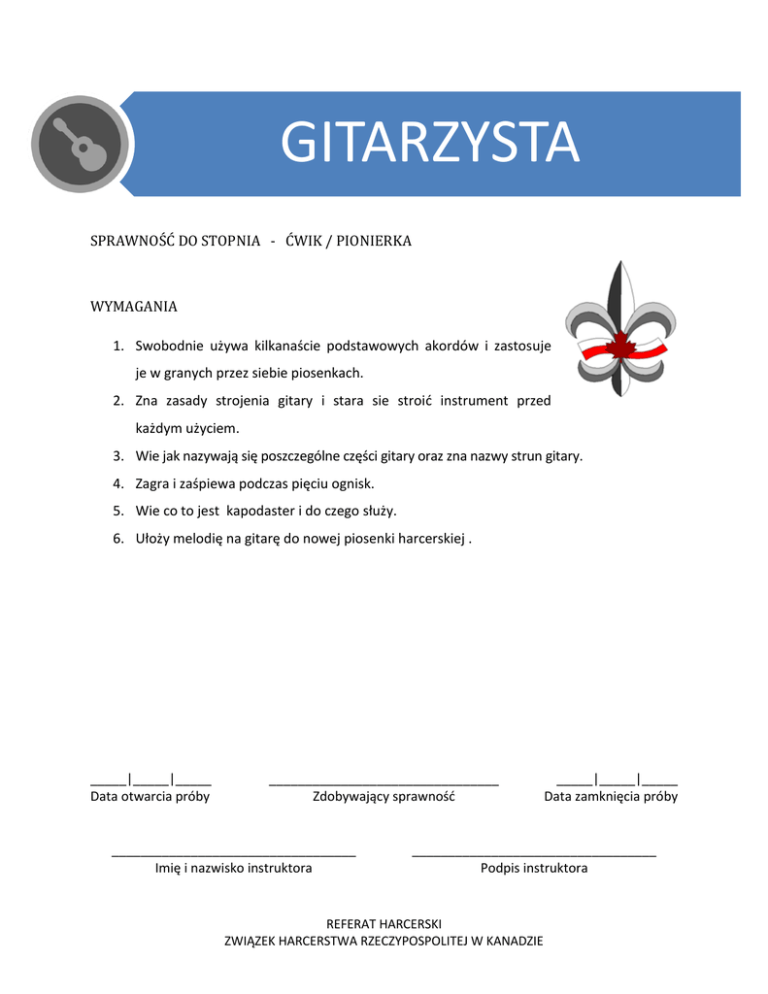 GITARZYSTA SPRAWNOŚĆ DO STOPNIA - ĆWIK / PIONIERKA WYMAGANIA 1. Swobodnie używa kilkanaście podstawowych akordów i zastosuje je w granych przez siebie piosenkach. 2. Zna zasady strojenia gitary i stara sie stroić instrument przed każdym użyciem. 3. Wie jak nazywają się poszczególne części gitary oraz zna nazwy strun gitary. 4. Zagra i zaśpiewa podczas pięciu ognisk. 5. Wie co to jest kapodaster i do czego służy. 6. Ułoży melodię na gitarę do nowej piosenki harcerskiej . _____|_____|_____ Data otwarcia próby ________________________________ Zdobywający sprawność __________________________________ Imię i nazwisko instruktora _____|_____|_____ Data zamknięcia próby __________________________________ Podpis instruktora REFERAT HARCERSKI ZWIĄZEK HARCERSTWA RZECZYPOSPOLITEJ W KANADZIE