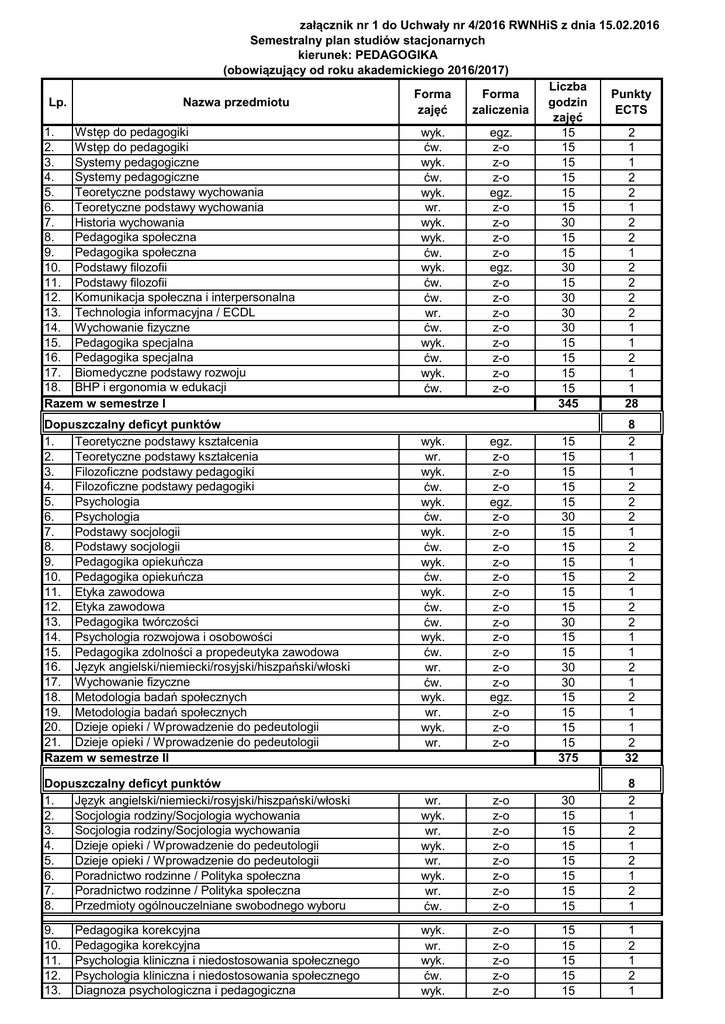 załącznik nr 1 do Uchwały nr 4/2016 RWNHiS z dnia 15.02.2016 Semestralny plan studiów stacjonarnych kierunek: PEDAGOGIKA (obowiązujący od roku akademickiego 2016/2017) Liczba Forma Forma Punkty Lp. Nazwa przedmiotu godzin zajęć zaliczenia ECTS zajęć 1. Wstęp do pedagogiki wyk. egz. 15 2 2. Wstęp do pedagogiki ćw. z-o 15 1 3. Systemy pedagogiczne wyk. z-o 15 1 4. Systemy pedagogiczne ćw. z-o 15 2 5. Teoretyczne podstawy wychowania wyk. egz. 15 2 6. Teoretyczne podstawy wychowania wr. z-o 15 1 7. Historia wychowania wyk. z-o 30 2 8. Pedagogika społeczna wyk. z-o 15 2 9. Pedagogika społeczna ćw. z-o 15 1 10. Podstawy filozofii wyk. egz. 30 2 11. Podstawy filozofii ćw. z-o 15 2 12. Komunikacja społeczna i interpersonalna ćw. z-o 30 2 13. Technologia informacyjna / ECDL wr. z-o 30 2 14. Wychowanie fizyczne ćw. z-o 30 1 15. Pedagogika specjalna wyk. z-o 15 1 16. Pedagogika specjalna ćw. z-o 15 2 17. Biomedyczne podstawy rozwoju wyk. z-o 15 1 18. BHP i ergonomia w edukacji ćw. z-o 15 1 Razem w semestrze I 345 28 Dopuszczalny deficyt punktów 1. Teoretyczne podstawy kształcenia 2. Teoretyczne podstawy kształcenia 3. Filozoficzne podstawy pedagogiki 4. Filozoficzne podstawy pedagogiki 5. Psychologia 6. Psychologia 7. Podstawy socjologii 8. Podstawy socjologii 9. Pedagogika opiekuńcza 10. Pedagogika opiekuńcza 11. Etyka zawodowa 12. Etyka zawodowa 13. Pedagogika twórczości 14. Psychologia rozwojowa i osobowości 15. Pedagogika zdolności a propedeutyka zawodowa 16. Język angielski/niemiecki/rosyjski/hiszpański/włoski 17. Wychowanie fizyczne 18. Metodologia badań społecznych 19. Metodologia badań społecznych 20. Dzieje opieki / Wprowadzenie do pedeutologii 21. Dzieje opieki / Wprowadzenie do pedeutologii Razem w semestrze II wyk. wr. wyk. ćw. wyk. ćw. wyk. ćw. wyk. ćw. wyk. ćw. ćw. wyk. ćw. wr. ćw. wyk. wr. wyk. wr. egz. z-o z-o z-o egz. z-o z-o z-o z-o z-o z-o z-o z-o z-o z-o z-o z-o egz. z-o z-o z-o 15 15 15 15 15 30 15 15 15 15 15 15 30 15 15 30 30 15 15 15 15 375 8 2 1 1 2 2 2 1 2 1 2 1 2 2 1 1 2 1 2 1 1 2 32 Dopuszczalny deficyt punktów 1. Język angielski/niemiecki/rosyjski/hiszpański/włoski 2. Socjologia rodziny/Socjologia wychowania 3. Socjologia rodziny/Socjologia wychowania 4. Dzieje opieki / Wprowadzenie do pedeutologii 5. Dzieje opieki / Wprowadzenie do pedeutologii 6. Poradnictwo rodzinne / Polityka społeczna 7. Poradnictwo rodzinne / Polityka społeczna 8. Przedmioty ogólnouczelniane swobodnego wyboru wr. wyk. wr. wyk. wr. wyk. wr. ćw. z-o z-o z-o z-o z-o z-o z-o z-o 30 15 15 15 15 15 15 15 8 2 1 2 1 2 1 2 1 9. 10. 11. 12. 13. wyk. wr. wyk. ćw. wyk. z-o z-o z-o z-o z-o 15 15 15 15 15 1 2 1 2 1 Pedagogika korekcyjna Pedagogika korekcyjna Psychologia kliniczna i niedostosowania społecznego Psychologia kliniczna i niedostosowania społecznego Diagnoza psychologiczna i pedagogiczna 14. Diagnoza psychologiczna i pedagogiczna 15. Psychopedagogiczne podstawy terapii 16. Psychopedagogiczne podstawy terapii 17. Profilaktyka pedagogiczna 18. Profilaktyka pedagogiczna 19. Metodyka zajęć korekcyjno-kompensacyjnych 20. Metodyka zajęć korekcyjno-kompensacyjnych 21. Poradnictwo pedagogiczne Razem w semestrze III ze specjalnością PEDAGOGICZNA I WSPOMAGANIE ROZWOJU DZIECKA* 9a. 10a. 11a. 12a. 13a. 14a. 15a. 16a. 17a. 18a Pedagogika opiekuńcza Pedagogika opiekuńcza Kryminologia Kryminologia Ustawodawstwo społeczne Ustawodawstwo społeczne Literatura dla dzieci i dorosłych Literatura dla dzieci i dorosłych Metodyka pracy opiekuńczo-wychowawczej Metodyka pracy opiekuńczo-wychowawczej Razem w semestrze III ze specjalnością OPIEKUŃCZO-WYCHOWAWCZA I RESOCJALIZACYJNA* 9b. Prawo oświatowe 10b. Pedagogika przedszkolna 11b. Pedagogika przedszkolna Metodyka pracy opiekuńczo-wychowawczej z małym 12b. dzieckiem Metodyka pracy opiekuńczo-wychowawczej z małym 13b. dzieckiem Diagnoza i praca z dzieckiem ze specjalnymi potrzebami 14b. edukacyjnymi Diagnoza i praca z dzieckiem ze specjalnymi potrzebami 15b. edukacyjnymi Współpraca przedszkola i szkoły ze środowiskiem i 16b. rodzicami 17b. Wspieranie psychopedagogiczne rozwoju dziecka 18b. Wspieranie psychopedagogiczne rozwoju dziecka 19b. Praktyki zawodowe Razem w semestrze III ze specjalnością WCZESNOSZKOLNA I PRZEDSZKOLNA* ćw. z-o wyk. egz. ćw. z-o wyk. z-o ćw. z-o wyk. z-o ćw. z-o wyk. z-o TERAPIA wyk. wr. wyk. wr. wyk. wr. wyk. wr. wyk. wr. z-o z-o z-o z-o z-o z-o z-o z-o z-o z-o 15 15 15 15 15 15 15 15 2 2 1 1 2 1 2 1 330 31 15 30 15 30 15 15 15 15 15 30 2 2 2 2 1 2 1 2 2 2 PEDAGOGIKA wr. wyk. wr. z-o egz. z-o 330 15 15 30 30 1 2 2 wyk. z-o 15 1 wr. z-o 15 2 wyk. z-o 15 1 wr. z-o 15 2 wyk. z-o 15 1 15 15 60 godz. 1 2 4 300 31 wyk. wr. z-o z-o z-o PEDAGOGIKA Dopuszczalny deficyt punktów 1. Język angielski/niemiecki/rosyjski/hiszpański/włoski 2. Przedmioty ogólnouczelniane swobodnego wyboru wr. ćw. z-o z-o 30 30 7 2 2 3. 4. 5. 6. 7. ćw. ćw. wyk. ćw. wr. z-o z-o egz. z-o z-o 15 15 15 15 15 1 1 2 1 1 wyk. z-o 15 2 ćw. z-o 30 2 ćw. ćw. z-o z-o 30 30 2 2 ćw. z-o 15 1 wyk. z-o 15 1 ćw. z-o 15 2 wr. z-o 30 2 8. 9. 10. 11. 12. 13. 14. 15. Terapia integracji sensorycznej Wstęp do logopedii Psychologia kliniczna i niedostosowania społecznego Psychologia kliniczna i niedostosowania społecznego Emisja głosu Formy i metody pomocy psychologiczno - pedagogicznej dziecku i rodzinie Formy i metody pomocy psychologiczno - pedagogicznej dziecku i rodzinie Arteterapia Metodyka zajęć korekcyjno - kompensacyjnych Metodyka pracy z dzieckiem z zaburzeniami emocji i zachowania Metodyka pracy z dzieckiem z trudnościami w czytaniu i pisaniu Metodyka pracy z dzieckiem z trudnościami w czytaniu i pisaniu Trening umiejętności społecznych 16. Pedagogika czasu wolnego 17. Pedagogika czasu wolnego 18. Ergoterapia Razem w semestrze IV ze specjalnością PEDAGOGICZNA I WSPOMAGANIE ROZWOJU DZIECKA* wyk. z-o ćw. z-o ćw. z-o TERAPIA 3a. 4a. 5a. 6a. 7a. 8a. 9a. 10a. 11a. 12a. 13a. 14a. 15a. 16a.