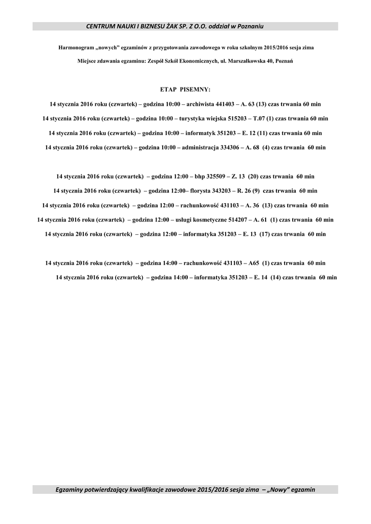 CENTRUM NAUKI I BIZNESU ŻAK SP. Z O.O. oddział w Poznaniu Harmonogram „nowych” egzaminów z przygotowania zawodowego w roku szkolnym 2015/2016 sesja zima Miejsce zdawania egzaminu: Zespół Szkół Ekonomicznych, ul. Marszałkowska 40, Poznań ETAP PISEMNY: 14 stycznia 2016 roku (czwartek) – godzina 10:00 – archiwista 441403 – A. 63 (13) czas trwania 60 min 14 stycznia 2016 roku (czwartek) – godzina 10:00 – turystyka wiejska 515203 – T.07 (1) czas trwania 60 min 14 stycznia 2016 roku (czwartek) – godzina 10:00 – informatyk 351203 – E. 12 (11) czas trwania 60 min 14 stycznia 2016 roku (czwartek) – godzina 10:00 – administracja 334306 – A. 68 (4) czas trwania 60 min 14 stycznia 2016 roku (czwartek) – godzina 12:00 – bhp 325509 – Z. 13 (20) czas trwania 60 min 14 stycznia 2016 roku (czwartek) – godzina 12:00– florysta 343203 – R. 26 (9) czas trwania 60 min 14 stycznia 2016 roku (czwartek) – godzina 12:00 – rachunkowość 431103 – A. 36 (13) czas trwania 60 min 14 stycznia 2016 roku (czwartek) – godzina 12:00 – usługi kosmetyczne 514207 – A. 61 (1) czas trwania 60 min 14 stycznia 2016 roku (czwartek) – godzina 12:00 – informatyka 351203 – E. 13 (17) czas trwania 60 min 14 stycznia 2016 roku (czwartek) – godzina 14:00 – rachunkowość 431103 – A65 (1) czas trwania 60 min 14 stycznia 2016 roku (czwartek) – godzina 14:00 – informatyka 351203 – E. 14 (14) czas trwania 60 min Egzaminy potwierdzający kwalifikacje zawodowe 2015/2016 sesja zima – „Nowy” egzamin CENTRUM NAUKI I BIZNESU ŻAK SP. Z O.O. oddział w Poznaniu ETAP PRAKTYCZNY: 15 stycznia 2016 roku (piątek) – godzina 9:00 archiwista 441403 - A.63 – Organizacja i prowadzenie archiwum – 180 minut turystyka wiejska 515203 – T.7 - Prowadzenie działalności turystycznej na obszarach wiejskich - 150 minut administracja 334306 - A. 68 - Obsługa klienta w jednostkach administracji - 180 minut 15 stycznia 2016 roku (piątek) – godzina 13:00 bhp 325509 Z.13 – Zarządzanie bezpieczeństwem w środowisku pracy – 120 minut ETAP PRAKTYCZNY: od 16 stycznia 2016 roku – do 26 lutego 2016 roku florysta R. 26 – Wykonywanie kompozycji florystycznych - 120 minut rachunkowość A.36 – Prowadzenie rachunkowości – 180 minut rachunkowość 431103 A.65 – Rozliczanie wynagrodzeń i danin publicznych – 180 minut informatyk E.12 – Montaż i eksploatacja komputerów osobistych oraz urządzeń peryferyjnych – 150 minut informatyk E.13 – Projektowanie lokalnych sieci komputerowych i administrowanie sieciami – 150 minut informatyk E.14 – Tworzenie aplikacji internetowych i baz danych oraz administrowanie bazami– 150 minut Egzaminy potwierdzający kwalifikacje zawodowe 2015/2016 sesja zima – „Nowy” egzamin