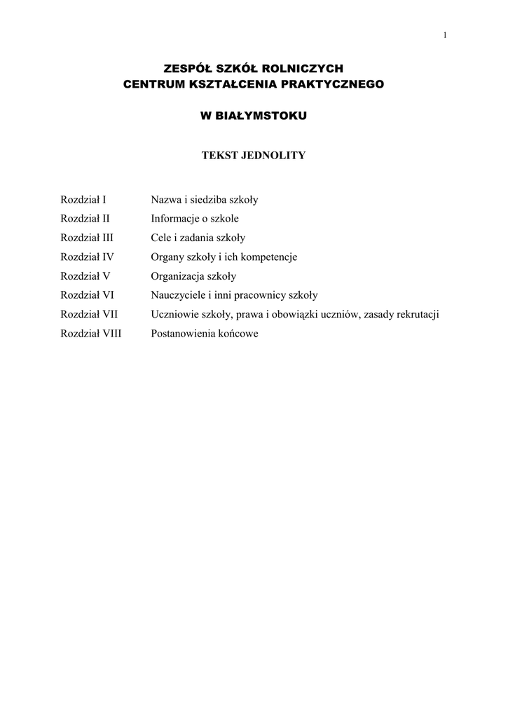 1 ZESPÓŁ SZKÓŁ ROLNICZYCH CENTRUM KSZTAŁCENIA PRAKTYCZNEGO W BIAŁYMSTOKU TEKST JEDNOLITY Rozdział I Nazwa i siedziba szkoły Rozdział II Informacje o szkole Rozdział III Cele i zadania szkoły Rozdział IV Organy szkoły i ich kompetencje Rozdział V Organizacja szkoły Rozdział VI Nauczyciele i inni pracownicy szkoły Rozdział VII Uczniowie szkoły, prawa i obowiązki uczniów, zasady rekrutacji Rozdział VIII Postanowienia końcowe 2 I. NAZWA I SIEDZIBA SZKOŁY §1 1. Szkoła nosi nazwę: Zespół Szkół Rolniczych Centrum Kształcenia Praktycznego w Białymstoku, zwana dalej Szkołą. 2. 3 6 Szkoła jest publiczną szkołą ponadgimnazjalną dla młodzieży, w skład której wchodzą: 1) XVII Liceum Ogólnokształcące z klasami Szkoły Mistrzostwa Sportowego w LA5 2) Zasadnicza Szkoła Zawodowa Nr 8 3) 5 4) Technikum Zawodowe Nr 75 5) Centrum Kształcenia Praktycznego 6)2 7 Technikum Uzupełniające dla Dorosłych Nr 5; 3.1 6 Siedziba Zespołu Szkół Rolniczych Centrum Kształcenia Praktycznego znajduje się w Białymstoku, przy ul. Ks. Stanisława Suchowolca 26, kod pocztowy 15-566. §2 1. Szkole może nadać imię organ prowadzący, na wniosek Rady Szkoły lub wspólny wniosek Rady Pedagogicznej, Rady Rodziców i Samorządu Uczniowskiego. II. INFORMACJE O SZKOLE §3 1. Organem prowadzącym szkołę jest Miasto Białystok. 2. Organem sprawującym nadzór pedagogiczny jest Podlaski Kurator Oświaty. §4 1. Szkoła kształci młodzież w następujących kierunkach: 1) 6 Liceum Ogólnokształcące o trzyletnim cyklu nauczania o profilu: a) siatkarskim b) ogólnym szkoły mistrzostwa sportowego w la, 3 2) 3) 8 4) 3 3 Technikum Zawodowe o czteroletnim cyklu nauczania w zawodach: a) technik rolnik, b) 11 c) 9, d) technik architektury krajobrazu, e) technik hotelarstwa f) technik informatyk5 g) technik mechanizacji rolnictwa 8 h) technik weterynarii 8 i) technik turystyki wiejskiej 11 którego ukończenie umożliwia uzyskanie dyplomu potwierdzającego kwalifikacje zawodowe po zdaniu egzaminu, a także uzyskanie świadectwa dojrzałości po zdaniu egzaminu maturalnego. Zasadnicza Szkoła Zawodowa o trzyletnim cyklu nauczania w zawodach: a) mechanik operator pojazdów i maszyn rolniczych, której ukończenie umożliwia uzyskanie dyplomu potwierdzającego kwalifikacje zawodowe po zdaniu egzaminu, a także dalsze kształcenie począwszy od klasy drugiej liceum ogólnokształcącego dla dorosłych. 8 5)1 5 2. Organizację klas mistrzostwa sportowego określają odrębne przepisy. 3. 8 Szkoła prowadzi internat, stołówkę, pracownię zajęć praktycznych, warsztaty szkolne, centrum kształcenia praktycznego stanowiące jej integralną część. III. CELE I ZADANIA SZKOŁY §5 1. Szkoła realizuje zadania i cele określone w ustawie o systemie oświaty oraz przepisach wydanych na jej podstawie, a także zgodnie z zasadami zawartymi w Konstytucji Rzeczpospolitej Polskiej, w Powszechnej Deklaracji Praw Człowieka oraz Konwencji o Prawach Dziecka, a w szczególności: 1) zapewnia teoretyczne i praktyczne przygotowanie uczniów do wykonywania wybranego zawodu z uwzględnieniem szczególnej troski o ochronę środowiska; 2) 7 umożliwia uczniom technikum zdobycie średniego wykształcenia ogólnego, po złożeniu egzaminu dojrzałości podjęcie studiów wyższych i tytułu zawodowego po złożeniu egzaminu potwierdzającego kwalifikacje zawodowe, niezbędnego do wykonywania zawodu; 3) 8 umożliwia uczniom szkół zawodowych zdobycie zawodu po złożeniu egzaminu potwierdzającego kwalifikacje zawodowe oraz wykształcenia ogólnego zapewniającego kontynuację nauki w technikach zawodowych; 4 4) sprawuje opiekę nad uczniami odpowiednio do ich potrzeb oraz możliwości szkoły; 5) 7 umożliwia uczniom szkoły mistrzostwa sportowego w la zdobycie średniego wykształcenia oraz osiąganie wysokich wyników sportowych w la, pozwalających na kontynuowanie nauki na wyższych uczelniach sportowych oraz innych; 6) 9 realizuje w ramach wewnątrzszkolnego systemu doradztwa zawodowego przygotowanie uczniów do trafnego wyboru zawodu, drogi dalszego kształcenia oraz skutecznego wejścia na rynek pracy; wewnątrzszkolny system doradztwa zawodowego określa cele, zadania i formy pracy szkolnego doradcy zawodowego; 2. Szkoła realizuje zadania wynikające z ustawy o systemie oświaty i wydanych na jej podstawie aktów wykonawczych, a w szczególności: 1) umożliwia uczniom podtrzymywanie poczucia tożsamości narodowej, językowej i religijnej, poprzez: a) wdrażanie do poszanowania symboli narodowych: godło, flaga, hymn; b) udział uczniów w obchodach świąt narodowych; c) wdrażanie uczniów do poprawnego posługiwania się językiem ojczystym; d) zapoznanie uczniów z dorobkiem kulturalnym i historią Polski; e) stworzenie warunków do nauki religii w szkole; 2) udziela uczniom pomocy psychologicznej i pedagogicznej poprzez: a) zapewnienie uczniom mającym trudności z opanowaniem podstaw programowych, uzupełnienie braków w zespołach wyrównawczych; b) prowadzenie z uczniami mającymi orzeczenia poradni wychowawczozawodowych zindywidualizowanego lub, w szczególnych wypadkach, nauczania indywidualnego; c) współpracę z Publiczną Poradnią Psychologiczno-Pedagogiczną w Białymstoku; 3) umożliwia uczniom rozwijanie zainteresowań poprzez: a) działalność kół zainteresowań; b) udział w zajęciach rekreacyjno-sportowych; c) udział w zawodach sportowych; d) udział uczniów w konkursach przedmiotowych; e) dobrowolny udział uczniów w pracach organizacji działających na terenie szkoły; f) udział w obozach sportowych organizowanych przez szkołę. 4) sprawuje opiekę nad uczniami przebywającymi na zajęciach obowiązkowych, nadobowiązkowych, pozalekcyjnych i wycieczkach szkolnych na następujących zasadach: a) powołuje się wychowawcę klasowego w celu sprawowania bezpośredniej opieki nad uczniem w szkole i poza szkołą; b) szkoła prowadzi internat, w którym wychowawcom 