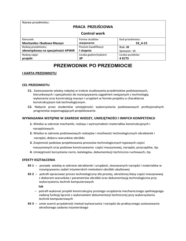 Nazwa przedmiotu: PRACA PRZEJŚCIOWA Control work Kierunek: Rodzaj przedmiotu: Forma studiów: stacjonarne Poziom kwalifikacji: obowiązkowy na specjalności APWiR I stopnia Rok: III Semestr: VI Rodzaj zajęć: Liczba godzin/tydzień: Liczba punktów: projekt 3P 4 ECTS Mechanika i Budowa Maszyn Kod przedmiotu: S3_4-15 PRZEWODNIK PO PRZEDMIOCIE I KARTA PRZEDMIOTU CEL PRZEDMIOTU C1. Zastosowanie wiedzy nabytej w trakcie studiowania przedmiotów podstawowych, kierunkowych i specjalności do rozwiązywania zagadnień związanych z technologią wykonania oraz konstrukcją maszyn i urządzeń w formie projektu o charakterze konstrukcyjnym lub technologicznym. C2. Nabycie przez studentów umiejętności wykorzystania podstawowych profesjonalnych programów wspomagających projektowanie. WYMAGANIA WSTĘPNE W ZAKRESIE WIEDZY, UMIEJĘTNOŚCI I INNYCH KOMPETENCJI 1. Wiedza w zakresie mechaniki, rodzaju i wytrzymałości materiałów konstrukcyjnych i narzędziowych. 2. Wiedza w zakresie podstawowych rodzajów i możliwości technologicznych obrabiarek i narzędzi, doboru warunków obróbki. 3. Znajomość podstaw projektowania procesów technologicznych typowych części maszynowych oraz podstaw konstruowania części maszynowej, narzędzi, przyrządów, itp. 4. Umiejętność korzystania norm, katalogów, dokumentacji techniczno-ruchowych, itp. EFEKTY KSZTAŁCENIA EK 1 – posiada wiedzę w zakresie obrabiarek i urządzeń, stosowanych narzędzi i materiałów w rozwiązywaniu zadań inżynierskich metodami obróbki ubytkowej EK 2 – potrafi opracować proces technologiczny dla prostej, określonej klasy części maszynowej z doborem warunków i parametrów obróbki oraz dokumentacją technologiczna przy wykorzystaniu technik komputerowych lub – potrafi wykonać projekt konstrukcyjny prostego urządzenia mechanicznego spełniającego zadaną funkcję łącznie z wykonaniem dokumentacji technicznej przy wykorzystaniu technik komputerowych EK 3 – umie ocenić przydatność metod wytwarzania i narzędzi do praktycznego zastosowania określonego zadania inżynierskiego TREŚCI PROGRAMOWE Liczba godzin Forma zajęć – PROJEKT Tematem pracy przejściowej jest rozwiązanie zadania w formie projektu konstrukcyjnego lub technologicznego. P 1 – Przegląd literatury związany z tematem w zakresie: - analizy istniejących rozwiązań z uwzględnieniem technologiczności konstrukcji - analizy stosowanych metod wytwarzania pod kątem możliwości technologicznych obrabiarek i narzędzi P 2 – Opracowanie wytycznych (danych) do projektu P 3 – - zaprojektowanie konstrukcji prostego urządzenia, średnio skomplikowanego zespołu mechanicznego, układu sterującego, itp., z wykorzystaniem technik komputerowych wraz z doborem materiałów i opracowaniem dokumentacji konstrukcyjnej lub - opracowanie procesu technologicznego wykonanie części maszynowej dla produkcji seryjnej lub wielkoseryjnej z doborem obrabiarki (obrabiarek) i oprzyrządowania technologicznego (narzędzi, przyrządów, uchwytów) oraz doborem i obliczeniem poszczególnych operacji technologicznych P 4 – - wizualizacja zaprojektowanego urządzenia w programie 3D - opracowanie dokumentacji technologicznej z wykorzystaniem wspomagania komputerowego 5 5 25 10 NARZĘDZIA DYDAKTYCZNE 1. – literatura techniczna dotycząca projektowania konstrukcyjnego i technologii wytwarzania 2. – normy z zakresu rysunku technicznego, obrabiarek i narzędzi skrawających, warunków i parametrów obróbki, dokumentacja techniczno-ruchowa maszyn i urządzeń, katalogi narzędzi 3. – przedmiotowe programy komputerowe wspomagające prace projektowe 4. – przedmiot jest realizowany w formie konsultacji. Student pod kierunkiem prowadzącego zajęcia wykonuje samodzielnie pracę przejściową. SPOSOBY OCENY ( F – FORMUJĄCA, P – PODSUMOWUJĄCA) F1. – regularne uczestnictwo na zajęciach projektowych F2. – konsultowanie postępów pracy z prowadzącym zajęcia P1.– ocena złożonej przez studenta w formie pisemnej pracy projektowej uwzględniająca treść merytoryczną, twórczy wkład studenta i stronę graficzną. OBCIĄŻENIE PRACĄ STUDENTA Forma aktywności Godziny kontaktowe z prowadzącym Zapoznanie ze wskazaną literaturą Średnia liczba godzin na zrealizowanie aktywności 45P 45 h 5h Zapoznanie się z możliwościami wykorzystania programów komputerowych wspomagających projektowanie 10 h 2 Wykonanie prac związanych z realizacją projektu 40 h (czas poza godzinami zajęć projektowych ) Suma SUMARYCZNA LICZBA PUNKTÓW ECTS DLA PRZEDMIOTU Liczba punktów ECTS, którą student uzyskuje w ramach zajęć o charakterze praktycznym, w tym zajęć laboratoryjnych i projektowych 100 h 4 ECTS 4 ECTS LITERATURA PODSTAWOWA I UZUPEŁNIAJĄCA 1. Feld M.: Projektowanie i automatyzacja procesów technologicznych części maszyn. PWN Warszawa, 1994 2. Feld M.: Projektowanie procesów technologicznych typowych części maszyn. WNT, W –wa 2000. 3. J. Kosmol: Automatyzacja obrabiarek i obróbki skrawaniem. WNT, Warszawa, 2000. 4. Instrukcje programowania i obsługi maszyn numerycznych. 5. Katalogi narzędziowe firm produkujących narzędzia. 6. Praca zbiorowa red. Kosmol J.: Techniki wytwarzania – Obrobka wiórowa i ścierna.OWPŚ, Gliwice 2002. 7. Mikulczyński T.: Automatyzacja procesów produkcyjnych. WNT, Warszawa 2006 8. Honczarenko J.: Elastyczne systemy wytwarzania. Obrabiarki i systemy obróbkowe. WNT, Warszawa 2000 9. Winkler T. „Komputerowy zapis konstrukcji”. WNT Warszawa 1997. 10. Weiss Z. i inni „Projektowanie technologii maszyn w systemach CAD/CAM” Wydawnictwo Politechniki Poznańskiej 1996. 11. J. Barczyk, A. Rydzewski „Konstrukcja, sterowanie i badanie chwytaków z napędem elektrycznym” Pr. Zb. Pod red. C. Zielińskiego i T Zielińskiego. Warszawa, Oficyna Wyd. PW 1997 12. Morecki A., Knapczyk J. (red.): Podstawy robotyki, WNT, Warszawa 1999 13. Feld M.: Uchwyty obróbkowe. WNT Warszawa 2002. 14. Praca zbiorowa pod red. 