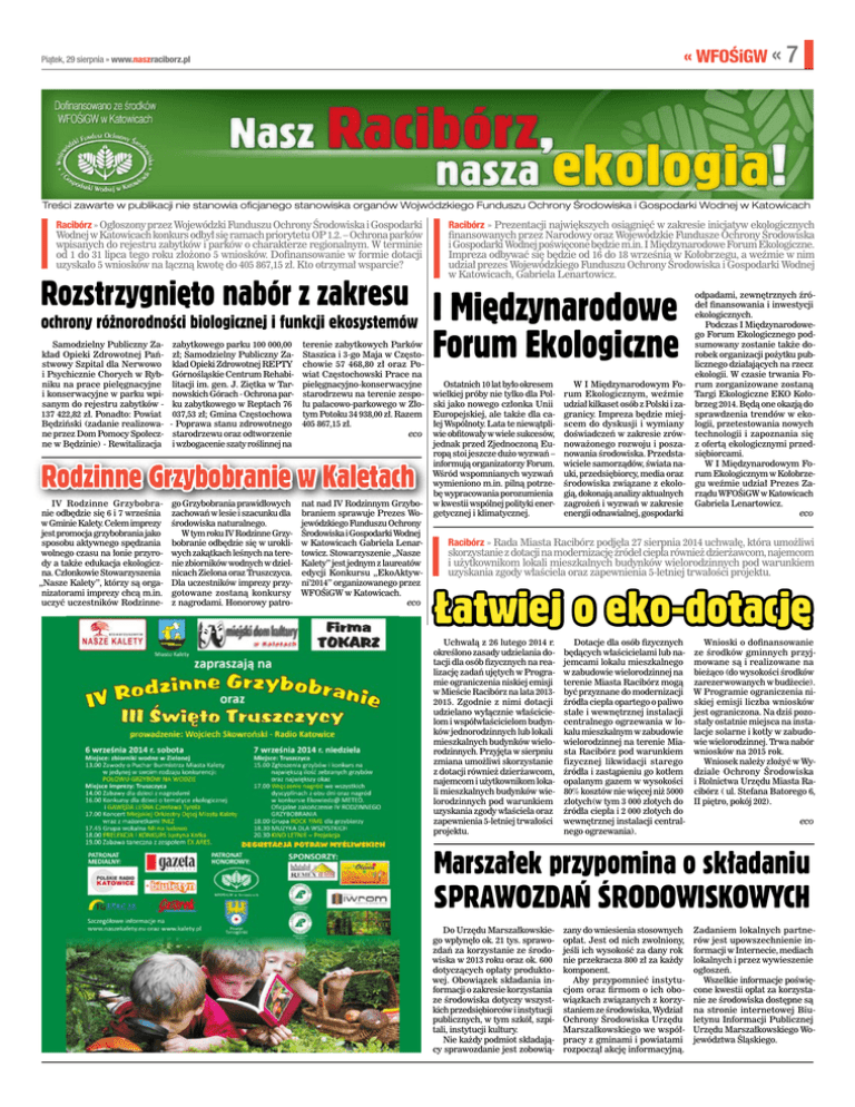« WFOŚiGW « 7 Piątek, 29 sierpnia » www.naszraciborz.pl Treści zawarte w publikacji nie stanowia oficjanego stanowiska organów Wojwódzkiego Funduszu Ochrony Środowiska i Gospodarki Wodnej w Katowicach Racibórz » Ogłoszony przez Wojewódzki Funduszu Ochrony Środowiska i Gospodarki Wodnej w Katowicach konkurs odbył się ramach priorytetu OP 1.2. – Ochrona parków wpisanych do rejestru zabytków i parków o charakterze regionalnym. W terminie od 1 do 31 lipca tego roku złożono 5 wniosków. Dofinansowanie w formie dotacji uzyskało 5 wniosków na łączną kwotę do 405 867,15 zł. Kto otrzymał wsparcie? Racibórz » Prezentacji największych osiągnięć w zakresie inicjatyw ekologicznych finansowanych przez Narodowy oraz Wojewódzkie Fundusze Ochrony Środowiska i Gospodarki Wodnej poświęcone będzie m.in. I Międzynarodowe Forum Ekologiczne. Impreza odbywać się będzie od 16 do 18 września w Kołobrzegu, a weźmie w nim udział prezes Wojewódzkiego Funduszu Ochrony Środowiska i Gospodarki Wodnej w Katowicach, Gabriela Lenartowicz. Rozstrzygnięto nabór z zakresu I Międzynarodowe ochrony różnorodności biologicznej i funkcji ekosystemów Samodzielny Publiczny Zakład Opieki Zdrowotnej Państwowy Szpital dla Nerwowo i Psychicznie Chorych w Rybniku na prace pielęgnacyjne i konserwacyjne w parku wpisanym do rejestru zabytków 137 422,82 zł. Ponadto: Powiat Będziński (zadanie realizowane przez Dom Pomocy Społeczne w Będzinie) - Rewitalizacja zabytkowego parku 100 000,00 zł; Samodzielny Publiczny Zaklad Opieki Zdrowotnej REPTY Górnośląskie Centrum Rehabilitacji im. gen. J. Ziętka w Tarnowskich Górach - Ochrona parku zabytkowego w Reptach 76 037,53 zł; Gmina Częstochowa - Poprawa stanu zdrowotnego starodrzewu oraz odtworzenie i wzbogacenie szaty roślinnej na Forum Ekologiczne terenie zabytkowych Parków Staszica i 3-go Maja w Częstochowie 57 468,80 zł oraz Powiat Częstochowski Prace na pielęgnacyjno-konserwacyjne Ostatnich 10 lat było okresem W I Międzynarodowym Fostarodrzewu na terenie zespo- wielkiej próby nie tylko dla Pol- rum Ekologicznym, weźmie łu pałacowo-parkowego w Zło- ski jako nowego członka Unii udział kilkaset osób z Polski i zatym Potoku 34 938,00 zł. Razem Europejskiej, ale także dla ca- granicy. Impreza będzie miej405 867,15 zł. łej Wspólnoty. Lata te niewątpli- scem do dyskusji i wymiany eco wie obfitowały w wiele sukcesów, doświadczeń w zakresie zrówjednak przed Zjednoczoną Eu- noważonego rozwoju i poszaropą stoi jeszcze dużo wyzwań – nowania środowiska. Przedstainformują organizatorzy Forum. wiciele samorządów, świata naWśród wspomnianych wyzwań uki, przedsiębiorcy, media oraz wymieniono m.in. pilną potrze- środowiska związane z ekolobę wypracowania porozumienia gią, dokonają analizy aktualnych nat nad IV Rodzinnym Grzybo- w kwestii wspólnej polityki ener- zagrożeń i wyzwań w zakresie braniem sprawuje Prezes Wo- getycznej i klimatycznej. energii odnawialnej, gospodarki jewódzkiego Funduszu Ochrony Środowiska i Gospodarki Wodnej Racibórz » Rada Miasta Racibórz podjęła 27 sierpnia 2014 uchwałę, która umożliwi w Katowicach Gabriela Lenartowicz. Stowarzyszenie „Nasze skorzystanie z dotacji na modernizację źródeł ciepła również dzierżawcom, najemcom Kalety” jest jednym z laureatów i użytkownikom lokali mieszkalnych budynków wielorodzinnych pod warunkiem edycji Konkursu „EkoAktywuzyskania zgody właściela oraz zapewnienia 5-letniej trwałości projektu. ni’2014” organizowanego przez WFOŚiGW w Katowicach. eco Rodzinne Grzybobranie w Kaletach IV Rodzinne Grzybobranie odbędzie się 6 i 7 września w Gminie Kalety. Celem imprezy jest promocja grzybobrania jako sposobu aktywnego spędzania wolnego czasu na łonie przyrody a także edukacja ekologiczna. Członkowie Stowarzyszenia „Nasze Kalety”, którzy są organizatorami imprezy chcą m.in. uczyć uczestników Rodzinne- go Grzybobrania prawidłowych zachowań w lesie i szacunku dla środowiska naturalnego. W tym roku IV Rodzinne Grzybobranie odbędzie się w urokliwych zakątkach leśnych na terenie zbiorników wodnych w dzielnicach Zielona oraz Truszczyca. Dla uczestników imprezy przygotowane zostaną konkursy z nagrodami. Honorowy patro- odpadami, zewnętrznych źródeł finansowania i inwestycji ekologicznych. Podczas I Międzynarodowego Forum Ekologicznego podsumowany zostanie także dorobek organizacji pożytku publicznego działających na rzecz ekologii. W czasie trwania Forum zorganizowane zostaną Targi Ekologiczne EKO Kołobrzeg 2014. Będą one okazją do sprawdzenia trendów w ekologii, przetestowania nowych technologii i zapoznania się z ofertą ekologicznymi przedsiębiorcami. W I Międzynarodowym Forum Ekologicznym w Kołobrzegu weźmie udział Prezes Zarządu WFOŚiGW w Katowicach Gabriela Lenartowicz. eco Łatwiej o eko-dotację Uchwałą z 26 lutego 2014 r. określono zasady udzielania dotacji dla osób fizycznych na realizację zadań ujętych w Programie ograniczenia niskiej emisji w Mieście Racibórz na lata 20132015. Zgodnie z nimi dotacji udzielano wyłącznie właścicielom i współwłaścicielom budynków jednorodzinnych lub lokali mieszkalnych budynków wielorodzinnych. Przyjęta w sierpniu zmiana umożliwi skorzystanie z dotacji również dzierżawcom, najemcom i użytkownikom lokali mieszkalnych budynków wielorodzinnych pod warunkiem uzyskania zgody właściela oraz zapewnienia 5-letniej trwałości projektu. Dotacje dla osób fizycznych będących właścicielami lub najemcami lokalu mieszkalnego w zabudowie wielorodzinnej na terenie Miasta Racibórz mogą być przyznane do modernizacji źródła ciepła opartego o paliwo stałe i wewnętrznej instalacji centralnego ogrzewania w lokalu mieszkalnym w zabudowie wielorodzinnej na terenie Miasta Racibórz pod warunkiem fizycznej likwidacji starego źródła i zastąpieniu go kotłem opalanym gazem w wysokości 80% kosztów 
