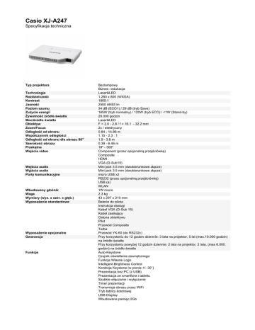 Casio XJ-A247 Specyfikacja techniczna Typ projektora Technologia Rozdzielczość Kontrast Jasność Poziom szumu Zużycie energii Żywotność źródła światła Moc/źródło światła Obiektyw Zoom/Focus Odległość od ekranu Współczynnik odległości Odległość od ekranu dla obrazu 80" Szerokość obrazu Przekątna Wejścia video Wejścia audio Wyjścia audio Porty komunikacyjne Wbudowany głośnik Waga Wymiary (wys. x szer. x głęb.) Wyposażenie standardowe Wyposażenie opcjonalne Gwarancja Funkcje Bezlampowy Biznes i edukacja Laser&LED 1.280 x 800 (WXGA) 1800:1 2500 ANSI lm 34 dB (ECO1) / 29 dB (tryb Save) 165W (tryb normalny) / 120W (tryb ECO) / <1W (Stand-by) 20.000 godzin Laser&LED F = 2.0 - 2.8 / f = 16.1 - 32.2 mm 2x / elektryczny 0.84 - 14.86 m 1.15 - 2.3 : 1 1.9 - 3.8 m 0.39 - 6.46 m 18" - 300" Component (przez opcjonalną przejściówkę) Composite HDMI VGA (D-Sub15) Mini jack 3.5 mm (dwukierunkowe złącze) Mini jack 3.5 mm (dwukierunkowe złącze) micro USB x2 RS232 (przez opcjonalną przejściówkę) USB (a) WLAN 1W mono 2.3 kg 43 x 297 x 210 mm Baterie do pilota Instrukcja obsługi Kabel VGA (D-Sub 15) Kabel zasilający Osłona obiektywu Pilot Przewód Composite Torba Przewód YK-60 (do RS232c) Przy korzystaniu do 12 godzin dziennie: 3 lata na projektor, 5 lat (max.10.000 godzin) na źródło światła Przy korzystaniu powyżej 12 godzin dziennie: 2 lata na projektor, 2 lata, (max 6.000 godzin) na źródło światła Auto-Keystone Czujnik oświetlenia zewnętrznego Funkcja Własne Logo Intelligent Brightness Control Korekcja Keystone (w pionie +/- 30°) Prezentacja bez PC (z USB) Prezentacja ze smartfona i tabletu Szybkie włączanie i wyłączanie Timer prezentacji Transmisja obrazu przez WiFi Tryb tablicy kolorowej USB Display Wbudowana pamięc 2Gb