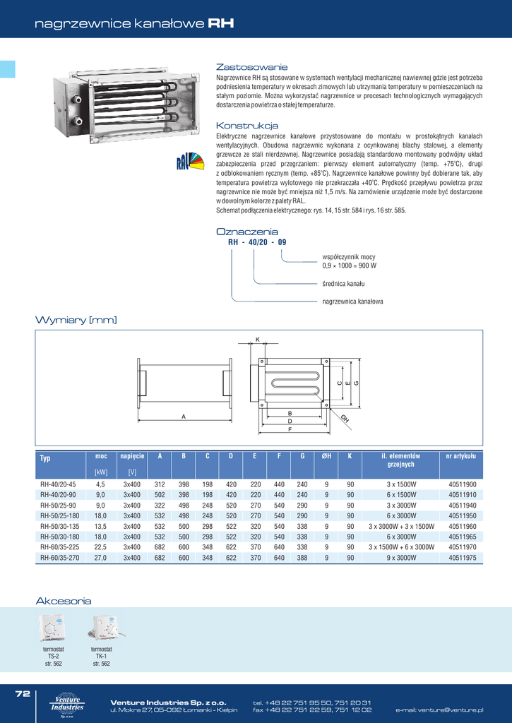 nagrzewnice kana³owe RH Zastosowanie Nagrzewnice RH s¹ stosowane w systemach wentylacji mechanicznej nawiewnej gdzie jest potrzeba podniesienia temperatury w okresach zimowych lub utrzymania temperatury w pomieszczeniach na sta³ym poziomie. Mo¿na wykorzystaæ nagrzewnice w procesach technologicznych wymagaj¹cych dostarczenia powietrza o sta³ej temperaturze. Konstrukcja Elektryczne nagrzewnice kana³owe przystosowane do monta¿u w prostok¹tnych kana³ach wentylacyjnych. Obudowa nagrzewnic wykonana z ocynkowanej blachy stalowej, a elementy grzewcze ze stali nierdzewnej. Nagrzewnice posiadaj¹ standardowo montowany podwójny uk³ad zabezpieczenia przed przegrzaniem: pierwszy element automatyczny (temp. +75oC), drugi z odblokowaniem rêcznym (temp. +85oC). Nagrzewnice kana³owe powinny byæ dobierane tak, aby temperatura powietrza wylotowego nie przekracza³a +40oC. Prêdkoœæ przep³ywu powietrza przez nagrzewnice nie mo¿e byæ mniejsza ni¿ 1,5 m/s. Na zamówienie urz¹dzenie mo¿e byæ dostarczone w dowolnym kolorze z palety RAL. Schemat pod³¹czenia elektrycznego: rys. 14, 15 str. 584 i rys. 16 str. 585. Oznaczenia RH - 40/20 - 09 wspó³czynnik mocy 0,9 × 1000 = 900 W œrednica kana³u nagrzewnica kana³owa Wymiary [mm] moc Typ napiêcie A B C D E F G OH K il. elementów grzejnych nr artyku³u [kW] [V] RH-40/20-45 4,5 3x400 312 398 198 420 220 440 240 9 90 3 x 1500W 40511900 RH-40/20-90 9,0 3x400 502 398 198 420 220 440 240 9 90 6 x 1500W 40511910 RH-50/25-90 9,0 3x400 322 498 248 520 270 540 290 9 90 3 x 3000W 40511940 RH-50/25-180 18,0 3x400 532 498 248 520 270 540 290 9 90 6 x 3000W 40511950 RH-50/30-135 13,5 3x400 532 500 298 522 320 540 338 9 90 3 x 3000W + 3 x 1500W 40511960 RH-50/30-180 18,0 3x400 532 500 298 522 320 540 338 9 90 6 x 3000W 40511965 RH-60/35-225 22,5 3x400 682 600 348 622 370 640 338 9 90 3 x 1500W + 6 x 3000W 40511970 RH-60/35-270 27,0 3x400 682 600 348 622 370 640 388 9 90 9 x 3000W 40511975 Akcesoria termostat TS-2 str. 562 termostat TK-1 str. 562 72 Venture Industries Sp. z o.o. ul. Mokra 27, 05-092 £omianki - Kie³pin tel. +48 22 751 95 50, 751 20 31 fax +48 22 751 22 59, 751 12 02 e-mail: [email protected] nagrzewnice kana³owe RH [K] Dobór nagrzewnic RH v [m/s] V [m3/h] Opory przep³ywu nagrzewnic kana³owych RH [Pa] [m/s] Dobór nagrzewnic elektrycznych P = Q×0,36×ÄT P - moc grzewcza [W] Q - wydatek powietrza [m3/h] ? T - ró¿nica temperatur [K] Zalecany monta¿ www.venture.pl 73