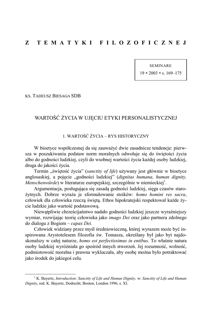 Z T E M A T Y K I F I L O Z O F I C Z N E J SEMINARE 19 * 2003 * s. 169–175 KS. TADEUSZ BIESAGA SDB WARTOŚĆ ŻYCIA W UJĘCIU ETYKI PERSONALISTYCZNEJ 1. WARTOŚĆ ŻYCIA – RYS HISTORYCZNY W bioetyce współczesnej da się zauważyć dwie zasadnicze tendencje: pierwsza w poszukiwaniu podstaw norm moralnych odwołuje się do świętości życia albo do godności ludzkiej, czyli do wsobnej wartości życia każdej osoby ludzkiej, druga do jakości życia. Termin „świętość życia” (sanctity of life) używany jest głównie w bioetyce anglosaskiej, a pojęcie „godności ludzkiej” (dignitas humana, human dignity, Menschenwürde) w literaturze europejskiej, szczególnie w niemieckiej1. Argumentacja, posługująca się zasadą godności ludzkiej, sięga czasów starożytnych. Dobrze wyraża je sformułowanie stoików: homo homini res sacra, człowiek dla człowieka rzeczą świętą. Ethos hipokratejski respektował każde życie ludzkie jako wartość podstawową. Niewątpliwie chrześcijaństwo nadało godności ludzkiej jeszcze wyraźniejszy wymiar, rozwijając teorię człowieka jako imago Dei oraz jako partnera zdolnego do dialogu z Bogiem – capax Dei. Człowiek widziany przez myśl średniowieczną, której wyrazem może być inspirowana Arystotelesem filozofia św. Tomasza, określany był jako byt najdoskonalszy w całej naturze, homo est perfectissimus in entibus. To właśnie natura osoby ludzkiej wyróżniała go spośród innych stworzeń. Jej rozumność, wolność, podmiotowość moralna i prawna wykluczała, aby osobę można było potraktować jako środek do jakiegoś celu. 1 K. Bayertz, Introduction: Sanctity of Life and Human Dignity, w: Sanctity of Life and Human Dignity, red. K. Bayertz, Dodrecht, Boston, London 1996, s. XI. 170 TADEUSZ BIESAGA Już pod koniec średniowiecza Wilhelm Ockham wielkość człowieka zaczął wiązać z wolnością przeciwstawioną naturze2. Mimo zakwestionowania przez filozofię nowożytną i współczesną pojęcia natury ludzkiej jako podstawy moralności, pojęcie osoby i godności ludzkiej u podstaw moralności pozostało, a może nawet zostało mocniej uwypuklone. Przykładem jest filozofia moralności I. Kanta. Nadał on pojęciu godności ludzkiej treść niezależną od teologicznej czy filozoficznej interpretacji chrześcijańskiej. Została ona przeformułowana w kategoriach rozumu sekularystycznego3. Człowiek ma godność ponieważ uczestniczy w rozumności i autonomii właściwej tego rodzaju istotom. Sekularyzacja tego terminu nie pozbawiła go – zdaniem Kurta Bayertza – jego autorytetu. Wprost przeciwnie, godność ludzka w duchu filozofii nowożytnej i współczesnej została wprowadzona do konstytucji najbardziej rozwiniętych krajów. Przybrała formę prawną i instytucjonalną. Jej filozoficzny wymiar został rozszerzony przez społeczno-polityczne zastosowanie tego terminu. Pojęcie godności ludzkiej stało się bastionem, twierdzą, obroną przed zakusami nadużyć nowożytnego państwa, samowładnego Lewiatana4. „I dziś nie ma już wątpliwości – wyraża swą opinię Kurt Bayertz – że ochrona życia ludzkiego jest jednym z największych priorytetów współczesnego Państwa. Jest ona nie tylko jednym z największych osiągnięć współczesnej filozofii polityki, ale znajduje się poza możliwością prawnego zakwestionowania”5. Zasada godności ludzkiej weszła w XX w. do konstytucji wielu narodów. Jest ona obecna w europejskich kartach etycznych, w deklaracjach praw człowieka, w różnych konwencjach i dokumentach. „Dzisiaj jest ona ważną częścią Konstytucji wielu krajów, włączając Kanadę, Irlandię, Włochy, Szwecję, Portugalię, Hiszpanię, Grecję i Niemcy. W Stanach Zjednoczonych pojęcie ludzkiej godności jest używane przez Sąd Najwyższy w związku z 1-szą, 4-tą, 5-tą, 6-tą, 8-ą i 14-ta poprawką do Konstytucji”6. Godność jest podstawowym pojęciem w Deklaracji Praw Człowieka Narodów Zjednoczonych z 10 grudnia 1948 r. Współczesna Konwencja o Prawach Człowieka i Bioemedycynie z 16 listopada 1996 r., zatytułowana jest: „Europejska Konwencja o prawach człowieka i godności istoty ludzkiej wobec zastosowań biologii i medycyny” Artykuł 1 tej konwencji brzmi: „Strony niniejszej Konwencji chronią godność i tożsamość istoty ludzkiej i gwarantują każdemu, bez dyskryminacji, poszanowanie dla jego integralności oraz innych podstawowych praw i wolności w sferze zastosowań biologii i medycy2 S. T. Pinckaers OP, Źródła moralności chrześcijańskiej, tłum. A. Kuryś, rozdz. X, Poznań 1994, s. 227 n.; zob. Zagadnienie godności człowieka, red. J. Czerkawski, Lublin 1994. 3 Tamże, s. XIV. 4 K. Bayertz, Human Dignity: Philosophical Origin and Scientific Erosion of an Idea, w: Sanctity of Life…, s. 80. 5 K. Bayertz, Introduction, w: Sanctity of Life…, s. XIV. 6 Tamże, s. XIX. WARTOŚĆ ŻYCIA W ETYCE PERSONALISTYCZNEJ 171 ny”. Czyli godność, tożsamość, integralność istoty ludzkiej stawiane są na początku jako pierwotne i podstawowe kryteria oceny zastosowania biologii i medycyny. Kryteria te wymieniane są przed autonomią, sprawiedliwością, a tym bardziej przed jakością życia czy rachunkiem ekonomicznym. Podsumowując można powiedzieć, że godność ludzka stała się podstawowym i uniwersalnym odniesieniem współczesnej moralności, stosunków międzyludzkich, społecznych i międzynarodowych. 2. WARTOŚĆ A JAKOŚĆ ŻYCIA W dzisiejszej bioetyce czy etyce lekarskiej coraz bardziej dochodzi do konfrontacji ze sobą zasady wartości życia z zasadą jakości życia. Na podstawie różnego stanu organizmu człowieka w okresie prenatalnym, czy postanalnym ocenia się czyje życie jest właściwe, a czyje niewłaściwe (wrongful life), czyje jest warte, a czyje nie warte życia. Obserwując te dwie tendencje przy formułowaniu polskiego Kodeksu etycznego, J. Umiastowski stwierdza: „Sądzę, że każdy lekarz musi odp