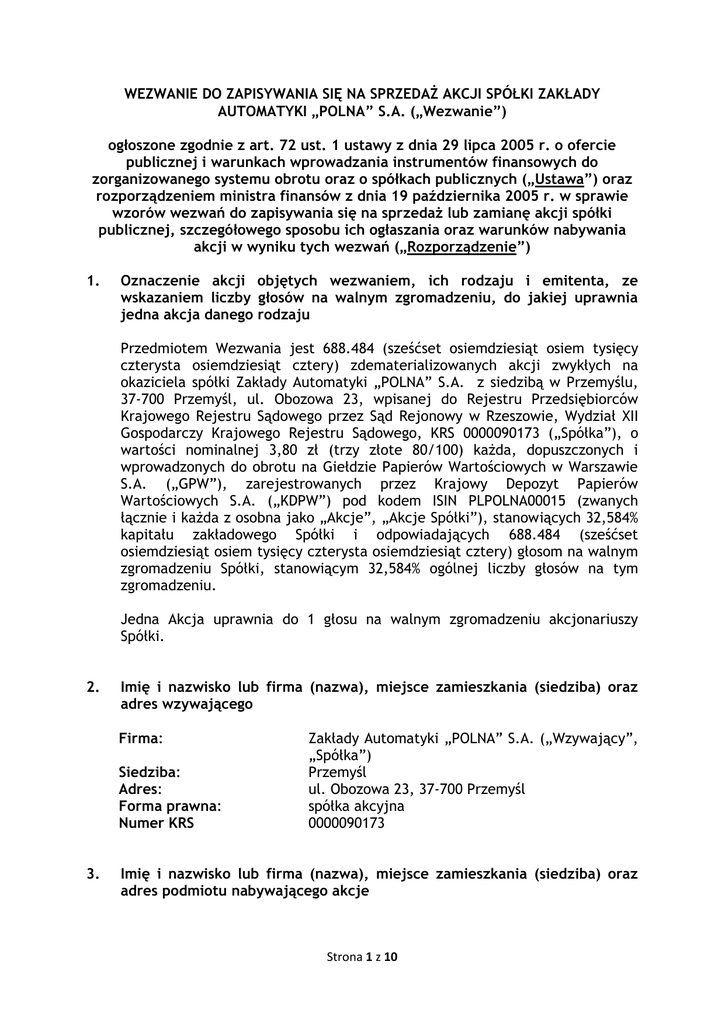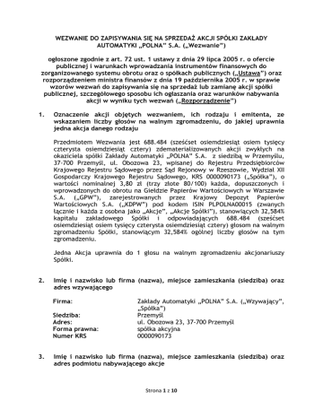 WEZWANIE DO ZAPISYWANIA SIĘ NA SPRZEDAŻ AKCJI SPÓŁKI ZAKŁADY AUTOMATYKI „POLNA” S.A. („Wezwanie”) ogłoszone zgodnie z art. 72 ust. 1 ustawy z dnia 29 lipca 2005 r. o ofercie publicznej i warunkach wprowadzania instrumentów finansowych do zorganizowanego systemu obrotu oraz o spółkach publicznych („Ustawa”) oraz rozporządzeniem ministra finansów z dnia 19 października 2005 r. w sprawie wzorów wezwań do zapisywania się na sprzedaż lub zamianę akcji spółki publicznej, szczegółowego sposobu ich ogłaszania oraz warunków nabywania akcji w wyniku tych wezwań („Rozporządzenie”) 1. Oznaczenie akcji objętych wezwaniem, ich rodzaju i emitenta, ze wskazaniem liczby głosów na walnym zgromadzeniu, do jakiej uprawnia jedna akcja danego rodzaju Przedmiotem Wezwania jest 688.484 (sześćset osiemdziesiąt osiem tysięcy czterysta osiemdziesiąt cztery) zdematerializowanych akcji zwykłych na okaziciela spółki Zakłady Automatyki „POLNA” S.A. z siedzibą w Przemyślu, 37-700 Przemyśl, ul. Obozowa 23, wpisanej do Rejestru Przedsiębiorców Krajowego Rejestru Sądowego przez Sąd Rejonowy w Rzeszowie, Wydział XII Gospodarczy Krajowego Rejestru Sądowego, KRS 0000090173 („Spółka”), o wartości nominalnej 3,80 zł (trzy złote 80/100) każda, dopuszczonych i wprowadzonych do obrotu na Giełdzie Papierów Wartościowych w Warszawie S.A. („GPW”), zarejestrowanych przez Krajowy Depozyt Papierów Wartościowych S.A. („KDPW”) pod kodem ISIN PLPOLNA00015 (zwanych łącznie i każda z osobna jako „Akcje”, „Akcje Spółki”), stanowiących 32,584% kapitału zakładowego Spółki i odpowiadających 688.484 (sześćset osiemdziesiąt osiem tysięcy czterysta osiemdziesiąt cztery) głosom na walnym zgromadzeniu Spółki, stanowiącym 32,584% ogólnej liczby głosów na tym zgromadzeniu. Jedna Akcja uprawnia do 1 głosu na walnym zgromadzeniu akcjonariuszy Spółki. 2. Imię i nazwisko lub firma (nazwa), miejsce zamieszkania (siedziba) oraz adres wzywającego Firma: Siedziba: Adres: Forma prawna: Numer KRS 3. Zakłady Automatyki „POLNA” S.A. („Wzywający”, „Spółka”) Przemyśl ul. Obozowa 23, 37-700 Przemyśl spółka akcyjna 0000090173 Imię i nazwisko lub firma (nazwa), miejsce zamieszkania (siedziba) oraz adres podmiotu nabywającego akcje Strona 1 z 10 Jedynym podmiotem nabywającym Akcje w wyniku niniejszego wezwania jest Wzywający. 4. Firma, siedziba, adres oraz numery telefonu, faksu i adres poczty elektronicznej podmiotu pośredniczącego Firma: Siedziba: Adres: Telefon: Telefaks: Adres strony internetowej: Adres poczty elektronicznej: 5. Dom Inwestycyjny BRE Banku („Podmiot Pośredniczący”) Warszawa ul. Wspólna 47/49, 00-684 Warszawa 00 48 22 697 47 00 00 48 22 697 48 20 www.dibre.pl [email protected] S.A. Liczba głosów, jaką podmiot nabywający zamierza uzyskać w wyniku wezwania, i odpowiadająca jej liczba akcji, jaką zamierza nabyć Podmiot nabywający zamierza uzyskać w wyniku Wezwania 688.484 (sześćset osiemdziesiąt osiem tysięcy czterysta osiemdziesiąt cztery) głosów na walnym zgromadzeniu Spółki, stanowiących 32,584% ogólnej liczby głosów na tym zgromadzeniu, odpowiadających 688.484 (sześćset osiemdziesiąt osiem tysięcy czterysta osiemdziesiąt cztery) Akcji, stanowiących 32,584% kapitału zakładowego. 6. Wskazanie minimalnej liczby akcji objętej zapisami, po której osiągnięciu podmiot nabywający akcje zobowiązuje się nabyć te akcje, i odpowiadającej jej liczby głosów - jeżeli została określona Podmiot nabywający nie określił minimalnej liczby Akcji objętej zapisami, po której osiągnięciu podmiot nabywający Akcje zobowiązuje się nabyć te Akcje. Podmiot nabywający nabędzie Akcje objęte zapisami w Wezwaniu, bez względu na ich liczbę minimalną. 7. Liczba głosów, jaką podmiot nabywający akcje zamierza osiągnąć w wyniku wezwania, i odpowiadająca jej liczba akcji. Podmiot nabywający, łącznie z głosami z posiadanych przez niego Akcji Spółki, zamierza osiągnąć 697.255 (sześćset dziewięćdziesiąt siedem tysięcy dwieście pięćdziesiąt pięć) głosów, stanowiących 32,99997% ogólnej liczby głosów na walnym zgromadzeniu akcjonariuszy, odpowiadających 697.255 (sześćset dziewięćdziesiąt siedem tysięcy dwieście pięćdziesiąt pięć) Akcji, stanowiących 32,99997% kapitału zakładowego. Strona 2 z 10 8. Określenie proporcji, w jakich nastąpi nabycie akcji przez każdy z podmiotów nabywających akcje - jeżeli akcje zamierza nabywać więcej niż jeden podmiot Nie dotyczy – występuje tylko jeden podmiot nabywający – Wzywający. 9. Cena, po której nabywane będą akcje objęte wezwaniem Cena, po której nabywane będą Akcje, wynosi 14,00 zł (czternaście złotych) za każdą Akcję („Cena Wezwania”). 10. Cena, od której, zgodnie z art. 79 ust. 1 i 2 ustawy, nie może być niższa cena określona w pkt 9, ze wskazaniem podstaw ustalenia tej ceny Cena Wezwania wskazana w pkt. 9 spełnia kryteria określone w art. 79 ust. 1 i 2 Ustawy. W szczególności Cena Wezwania nie jest niższa niż średnia cena rynkowa Akcji Spółki z okresu 6 miesięcy poprzedzających ogłoszenie Wezwania, w czasie których dokonywany był obrót tymi akcjami na rynku oficjalnych notowań giełdowych Giełdy Papierów Wartościowych w Warszawie S.A. („GPW”). Średnia cena rynkowa (rozumiana jako cena będąca średnią arytmetyczną ze średnich dziennych cen ważonych wolumenem obrotu) Akcji Spółki z okresu 6 (sześciu) miesięcy poprzedzających ogłoszenie Wezwania, w czasie których dokonywany był obrót tymi akcjami na rynku regulowanym GPW, wynosi 10,62 zł (dziesięć złotych 62/100). Cena Wezwania nie jest również niższa od najwyższej ceny, jaką Wzywający lub podmioty od niego zależne, lub wobec niego dominujące zapłaciły w okresie 12 miesięcy przed ogłoszeniem Wezwania, za Akcje Spółki. W okresie 12 miesięcy prz