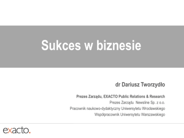 Sukces w biznesie dr Dariusz Tworzydło Prezes Zarządu, EXACTO Public Relations & Research Prezes Zarządu Newsline Sp. z o.o. Pracownik naukowo-dydaktyczny Uniwersytetu Wrocławskiego Współpracownik Uniwersytetu Warszawskiego Co decyduje o sukcesie? Plan Umiejętność budowania relacji Pierwsze wrażenie Sztuka słuchania Komunikacja werbalna i niewerbalna Kontakt wzrokowy Mowa ciała (sposób siadania, podanie dłoni, mimika twarzy, gesty, etc.) Umiejętność tworzenia własnego wizerunku Zaangażowanie Uczciwość Aktywność Bądź aktywny Bądź aktywny Bądź aktywny Bądź aktywny Bądź aktywny Bądź aktywny Co decyduje o sukcesie? Plan Umiejętność budowania relacji Pierwsze wrażenie Sztuka słuchania Komunikacja werbalna i niewerbalna Kontakt wzrokowy Mowa ciała (sposób siadania, podanie dłoni, mimika twarzy, gesty, etc.) Umiejętność tworzenia własnego wizerunku Zaangażowanie Uczciwość Aktywność Obecność w sieci Jesteś w internecie? Jesteś w internecie? Im bliżej szczyt… tym ciężej. Wyobrażenia a rzeczywistość… brak nam odwagi by ją nagiąć. Czyli dlaczego często przegrywamy? Trzy linie ZADANIE: trzema liniami podziel okręg na 10 CZĘŚCI Trzy linie a kto powiedział, że to mają być 3 równe lub proste linie? 2 8 1 5 4 1 0 7 3 6 9 A może trochę inaczej? nasze intencje mijają się ze sobą? rozwiąż zadanie: jeśli czwartym dniem przed jutrem jest czwartek, to ….. jaki jest trzeci dzień po jutrze? Podsumowanie To tylko początek problemów… niekoniecznie ważne jest to, co mówisz…. ważne jest ….. jak Cie zrozumieją inni zatem pomyśl również o tym jak powiedzieć…. Dziękuję. dr Dariusz Tworzydło [email protected]