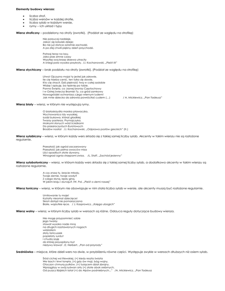 Elementy budowy wiersza: liczba strof, liczba wersów w każdej strofie, liczba sylab w każdym wersie, rymy – ich układ i typy Wiersz stroficzny – podzielony na strofy (zwrotki). (Podział ze względu na strofikę) Nie porzucaj nadzieje, Jakoć się kolwiek dzieje; Bo nie już słońce ostatnie zachodzi, A po złej chwili piękny dzień przychodzi. Patrzaj teraz na lasy, Jako prze zimne czasy Wszytkę swą krasę drzewa utraciły A śniegi pola wysoko przykryły. /J. Kochanowski, „Pieśń IX” Wiersz stychiczny – brak podziału na strofy (zwrotki). (Podział ze względu na strofikę) Litwo! Ojczyzno moja! ty jesteś jak zdrowie. Ile cię trzeba cenić, ten tylko się dowie, Kto cię stracił. Dziś piękność twą w całej ozdobie Widzę i opisuję, bo tęsknię po tobie. Panno Święta, co Jasnej bronisz Częstochowy I w Ostrej świecisz Bramie! Ty, co gród zamkowy Nowogródzki ochraniasz z jego wiernym ludem! Jak mnie dziecko do zdrowia powróciłaś cudem (…) / A. Mickiewicz, „Pan Tadeusz” Wiersz biały – wiersz, w którym nie występują rymy. O białoskrzydła morska pławaczko, Wychowanico Idy wysokiej, Łodzi bukowa, któraś gładkiej Twarzy pasterza, Prymajczyka, Mokrymi słonych wód ścieżkami Do przezroczystych Eurotowych Brodów nosiła! /J. Kochanowski, „Odprawa posłów greckich” (fr.) Wiersz sylabiczny – wiersz, w którym każdy wers składa się z takiej samej liczby sylab. Akcenty w takim wierszu nie są rozłożone regularnie. Przeszłość jak ogród zaczarowany Przeszłość jak pełna owoców misa Liści opadłych złote dywany, Winograd ognia strzępami zwisa. /L. Staff, „Zachód jesienny” Wiersz sylabotoniczny – wiersz, w którym każdy wers składa się z takiej samej liczby sylab, a dodatkowo akcenty w takim wierszu są rozłożone regularnie. A czy znasz ty, bracie młody, Twoje ziemie, twoje wody? Z czego słyną, kędy giną, W jakim kraju i dunaju? /W. Pol, „Pieśń o ziemi naszej” Wiersz toniczny – wiersz, w którym nie obowiązuje w nim stała liczba sylab w wersie, ale akcenty muszą być rozłożone regularnie. Umiłowanie ty moje! Kształty nieomal dziecięce! Skroń dotąd nie pomarszczona Białe, wąziutkie ręce. / J. Kasprowicz, „Księga ubogich” Wiersz wolny – wiersz, w którym liczby sylab w wersach są różne. Odrzuca reguły dotyczące budowy wiersza. Nie mogę przypomnieć sobie jego twarzy stawał wysoko nade mną na długich rozstawionych nogach widziałem złoty łańcuszek popielaty surdut i chudą szyję do której przyszpilony był nieżywy krawat /Z. Herbert, „Pan od przyrody” Sredniówka – miejsce, które dzieli wers na dwie, w przybliżeniu równe części. Występuje zwykle w wersach dłuższych niż osiem sylab. Śród cichej wsi litewskiej, (+) kiedy reszta świata We łzach i krwi tonęła, (+) gdy ów mąż, bóg wojny, Otoczon chmurą pułków, (+) tysiącem dział zbrojny, Wprzągłszy w swój rydwan orły (+) złote obok srebrnych, Od puszcz libijskich latał (+) do Alpów podniebnych...” /A. Mickiewicz, „Pan Tadeusz