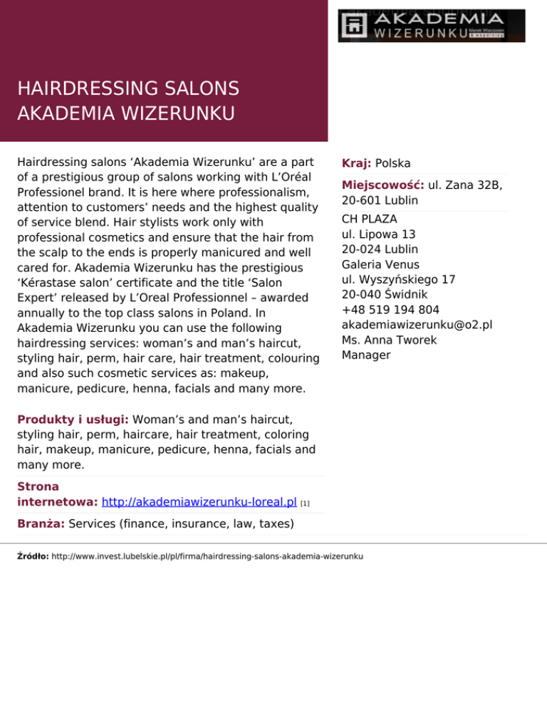 HAIRDRESSING SALONS AKADEMIA WIZERUNKU Hairdressing salons ‘Akademia Wizerunku’ are a part of a prestigious group of salons working with L’Oréal Professionel brand. It is here where professionalism, attention to customers’ needs and the highest quality of service blend. Hair stylists work only with professional cosmetics and ensure that the hair from the scalp to the ends is properly manicured and well cared for. Akademia Wizerunku has the prestigious ‘Kérastase salon’ certificate and the title ‘Salon Expert’ released by L’Oreal Professionnel – awarded annually to the top class salons in Poland. In Akademia Wizerunku you can use the following hairdressing services: woman’s and man’s haircut, styling hair, perm, hair care, hair treatment, colouring and also such cosmetic services as: makeup, manicure, pedicure, henna, facials and many more. Kraj: Polska Miejscowość: ul. Zana 32B, 20-601 Lublin CH PLAZA ul. Lipowa 13 20-024 Lublin Galeria Venus ul. Wyszyńskiego 17 20-040 Świdnik +48 519 194 804 [email protected] Ms. Anna Tworek Manager Produkty i usługi: Woman’s and man’s haircut, styling hair, perm, haircare, hair treatment, coloring hair, makeup, manicure, pedicure, henna, facials and many more. Strona internetowa: http://akademiawizerunku-loreal.pl [1] Branża: Services (finance, insurance, law, taxes) Źródło: http://www.invest.lubelskie.pl/pl/firma/hairdressing-salons-akademia-wizerunku