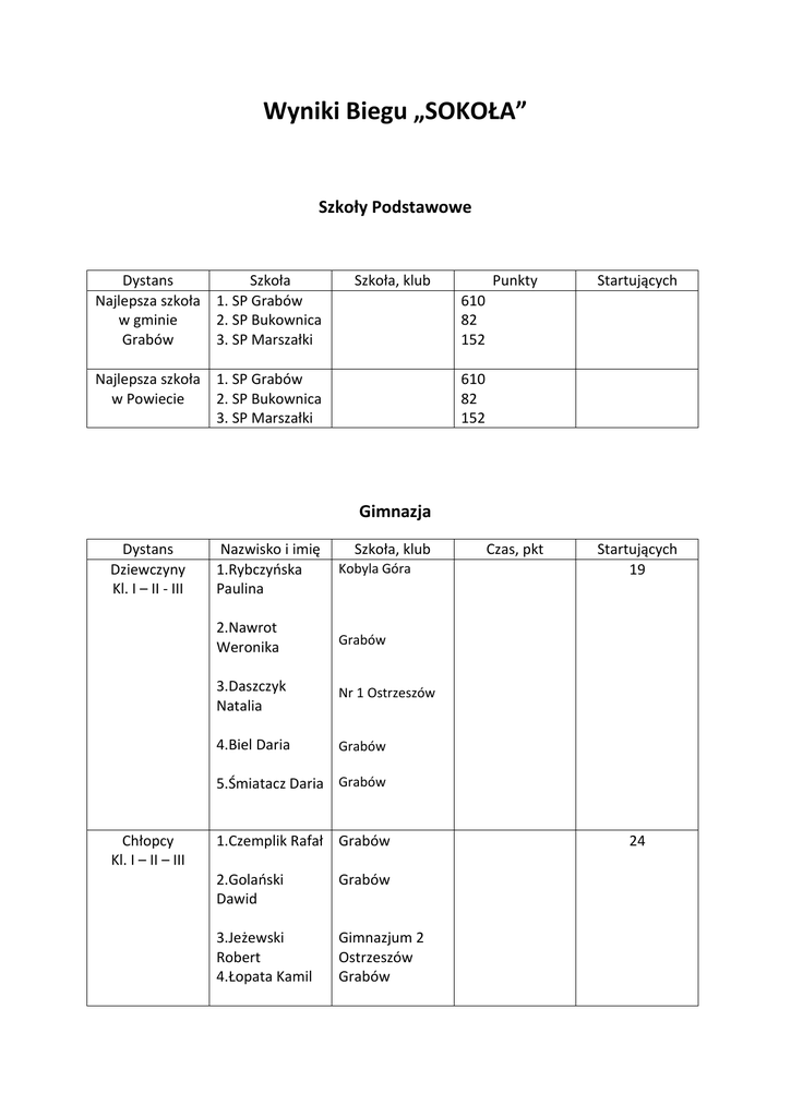 Wyniki Biegu „SOKOŁA” Szkoły Podstawowe Dystans Szkoła Najlepsza szkoła 1. SP Grabów w gminie 2. SP Bukownica Grabów 3. SP Marszałki Szkoła, klub Punkty Startujących Czas, pkt Startujących 19 610 82 152 Najlepsza szkoła 1. SP Grabów w Powiecie 2. SP Bukownica 3. SP Marszałki 610 82 152 Gimnazja Dystans Dziewczyny Kl. I – II - III Nazwisko i imię 1.Rybczyńska Paulina Szkoła, klub Kobyla Góra 2.Nawrot Weronika Grabów 3.Daszczyk Natalia Nr 1 Ostrzeszów 4.Biel Daria Grabów 5.Śmiatacz Daria Grabów Chłopcy Kl. I – II – III 1.Czemplik Rafał Grabów 2.Golański Dawid Grabów 3.Jeżewski Robert 4.Łopata Kamil Gimnazjum 2 Ostrzeszów Grabów 24 5.Mielcarek Hubert Grabów PUNKTACJA ZAESPOŁOWA GIMNAZJÓW Nazwa szkoły Gimnazjum Grabów Gimnazjum Kobyla Góra Gimnazjum Nr 1 Ostrzeszów Gimnazjum Nr 2 Ostrzeszów 1500 m Dziewcząt Kl. I - III 171 2000 m Chłopców K. I – III 196 Ogółem Pkt. MIEJSCE 367 1 20 20 2 18 18 3 18 3 18 Szkoły Podstawowe Dystans Przedszkolaki Dziewczyny kl. I – II Chłopcy kl. I – II Dziewczyny kl. III –IV Nazwisko i imię dziewczęta chłopcy 1.Batóg Martyna 1.Janiak Karol 2.Gruszczyńska 2.Fras Jakub Weronika 3.Błaszczyk 3.Fras Aleksandra Bartosz 4.Kucharska Kinga 4.Smardz Bartosz 5.Ciechanowska 5.Zieliński Alan Martyna 1.Wojtasik Oliwia 2.Bodura Anna 3.Duszyńska Ola 4.Matecka Klaudia 5.Kaźmierczak Hanna 1.Stasierski Michał 2.Pustkowski Konrad 3.Kałuża Michał 4.Kędziora Michał Lubryka Bartosz 1.Golańska Agnieszka 2.Janicka Ewelina 3.Wygoda Oliwia 4.Mieszała Nicola Szkoła, klub Doruchów ORKAN Ostrzeszów Grabów Przytocznica Przytocznica Mikstat Przytocznica Przytocznica Grabów Grabów Niedźwiedź Przytocznica Bukownica Grabów Czas, pkt Startujących 39 19 23 26 Chłopcy kl. III – IV 5.Dubiel Weronika 1.Bodura Szymon Marszałki ORKAN Ostrzeszów Marszałki Grabów Grabów Przytocznica Niedźwiedź Wieruszów Kobyla Góra Niedźwiedź Grabów Błaszki ORKAN Ostrzeszów Kalisz Marszałki Grabów 2.Wróblewski Klaudiusz 3.Noweta Dominiki 4.Stempin Dawid 5.Tomalak Piotr Dziewczyny kl. V – 1.Drabent Roksana VI 2.Polańska Matylda 3.Florczak Dominika 4.Hurna Agnieszka 5.Zimoch Gabrysia Chłopcy kl. V – VI 1.wachowski Wiktor 2.Krawczewski Tomasz 3.Garncarek Jakub 4.Witkowski Mateusz 5.Nowak Bartek 15 19 28 Przedszkolaki Klasa 0 CHŁOPCY/DZIEWCZYNKI Dystans 100 m Lp. Nr 269 132 1 2 262 140 3 4 216 5 104 6 125 242 7 8 203 108 199 136 9 10 12 13 257 14 Miejsce Nazwisko i imię Czemplik Julia Fras Aleksandra Fras Jakub Grzelak Mikołaj Kowaliewicz Marika Kucharska Kinga Siwiec Natalia Smardz Bartosz Szczot Filip Wajs Kinga Smardz Julia Batóg Martyna Ciechanowska Data urodzenia 05.08.2006 05.03.2006 Miejscowość 05.03.2006 27.05.2005 Bukownica Bukownica 08.08.2006 Bukownica 11.07.2005 Bukownica 21.12.2006 07.03.2005 Bukownica Bukownica 28.08.2006 17,06.2006 07321006685 03.01.2005 Bukownica Bukownica Bukownica Bukownica 17.06.2006 Bukownica Bukownica Bukownica Punkty 238 15 102 314 154 16 17 18 170 304 19 20 298 21 232 22 295 210 23 24 215 253 25 27 168 267 28 29 278 30 233 31 Martyna Błaszczyk Bartosz Janiak Karol Mróz Marcel Leszkiewicz Mateusz Błoch Marcin Gruszczyńska Weronika Mazurkiewicz Laura Fronczak Agata Smolis Zofia Wojtasik Aleksander Anioł Wiktor Skowrońska Natalia Jurga Antoni Matuszewska Tatiana Matuszewska Aurelia Frankowski Julian 10.10.2005 Grabów 03.04.2005 10.08.2005 13.06.2007 Grabów Grabów Ostrzeszów 15.03.2008 09.07.2005 Chlewo Ostrzeszów 29.12.2006 Olszyna 20.01.2007 Ostrzeszów 04.09.2007 1.08.2007 Jeziorna Doruchów 05.05.2010 20.01.2008 Doruchów Bukownica 21.02.2008 24.04.2008 Grabów Chlewo 07.11.2009 Chlewo 11.02.2007 Kuźnica Bobrowska PUNKTACJA ZASPOŁOWA SZKÓŁ PODSTAWOWYCH Nazwa szkoły Szkoła Podstawowa w Bukownicy SP w Grabowie SP w Przytocznicy SP w 500 m dziewcząt kl. I – II 30 500 m chłopców kl. I - II 17 800 m 800 m 1200 m 1200 m dziewcząt chłopców dziewcząt dziewcząt kl. III - IV kl. III - IV kl. V - VI Kl. V - VI 48 15 25 17 OGÓŁEM 82 33 101 37 93 19 119 16 88 - 127 - 610 105 - 15 22 19 8 18 82 152 Marszałkach SP w Kaliszkowicach Ołobockich SP w Niedźwiedziu SP w Mikstacie SP nr 3 w Ostrzeszowie SP nr 17 w Kaliszu SP w Doruchowie ORKAN Ostrzeszów SP Syców SP w Kobylej Górze SP w Wieruszowie SP nr 1 Ostrzeszów SP w Błaszkach 14 - 14 - - - 28 - - 20 - 37 1 58 - 20 10 - - - - 20 10 - 1 - - - 18 19 20 - - - 14 19 34 19 - - 20 - - 58 - - - 6 - 18 - 6 18 - - - - 19 - 19 - - - - - 14 14 - - - - - 20 20 Klasyfikacja ogólna XX Ogólnopolskiego Biegu „SOKOŁA” – 10 KM Bukownica dnia 17 czerwca 2012 roku Lp Numer start. Nazwisko i imię Rocz. Klub Kategoria wiekowa Altom Miejscowość Czas min,, sek Ostrów 33,,10 Wlkp. Gniezno 34,,29 1 1 Blahodir Yuriy 1981 Finisz Kalisz 2 2 1971 3 25 4 5 94 82 6 7 13 42 8 93 Kozłowski Klaudiusz Górny Krzysztof Baran Andrzej Karkoszka Marcin Jarysz Bartosz Mistygacz Bartłomiej Cicho rek 1978 Finisz Kalisz 35,,53 M30 1967 1993 KKB Finisz Orkan Kalisz Ostrzeszów 35,,57 36,,15 M40 M19 1994 1984 WKS Oleśniaczka Wierzchlas 36,,41 36,,54 M19 m20 1972 KKB Finisz Kalisz 37,,00 M40 M30 M40 9 26 10 45 11 6 12 28 13 14 15 41 24 73 16 65 17 64 18 7 19 20 88 59 21 50 22 54 23 24 25 43 154 92 26 29 27 31 28 84 29 61 30 72 31 33 32 33 34 Dariusz Smolis Arkadiusz Jachymczyk Norbert Domagała Robert Adamus Radosław Kęszka Piotr Górna Karolina Walczak Eugeniusz Marciniak Witold Ambroży Leszek Kasprzak Krzysztof Janiak Witold Gadziński Marek Tomaszewski Krzysztof Marcinkowski Piotr Olszyna Daniel Świtoń Marian Werner Czesław Taczka Sebastian Zhuk Natalia 1982 Jeziorno 37,,26 M30 1978 KB MCKiS Jaworzno 37,,41 M30 1970 KS Krotosz Krotoszyn 38,,25 M40 1965 38,,41 M40 38,,41 38,,57 38,,58 M30 K1 M50 1971 Ostrów Wlkp. Supermaraton Kalisz AKL Ursynów Warszawa KS Maraton Ostrów Wlkp. Poznań 39,,14 M40 1979 TG Sokół Bukownica 39,,22 M40 1968 KS Krotosz Krotoszyn 39,,29 M40 1970 1962 Lux WKB Piast Żórawina Wrocław 40,,