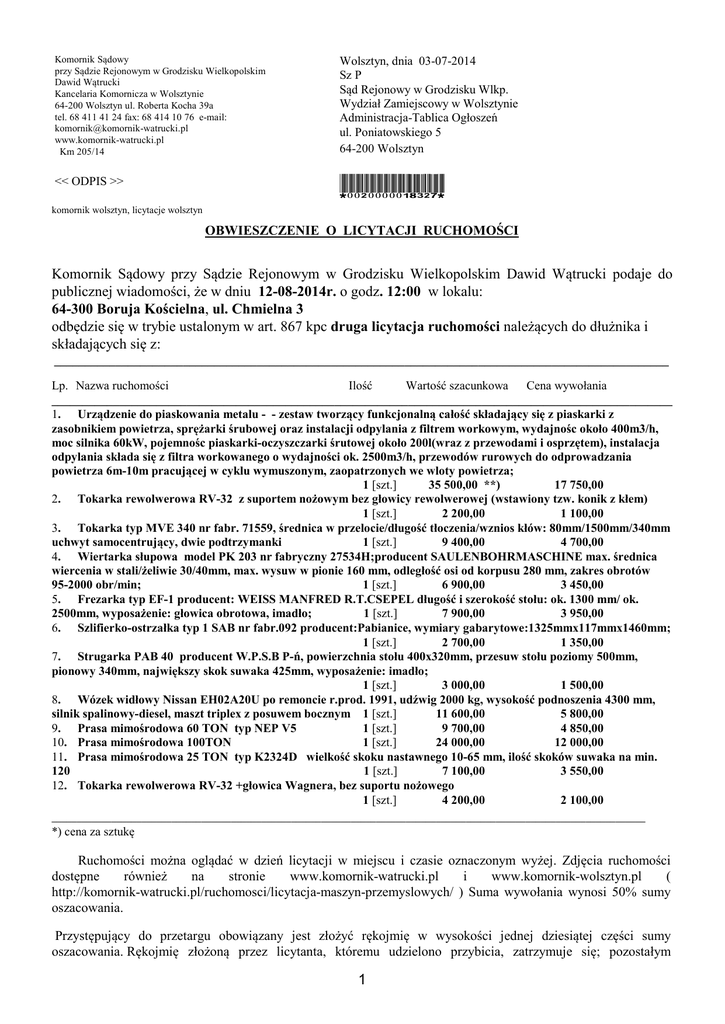 Komornik Sądowy przy Sądzie Rejonowym w Grodzisku Wielkopolskim Dawid Wątrucki Kancelaria Komornicza w Wolsztynie 64-200 Wolsztyn ul. Roberta Kocha 39a tel. 68 411 41 24 fax: 68 414 10 76 e-mail: [email protected] www.komornik-watrucki.pl Km 205/14 Wolsztyn, dnia 03-07-2014 Sz P Sąd Rejonowy w Grodzisku Wlkp. Wydział Zamiejscowy w Wolsztynie Administracja-Tablica Ogłoszeń ul. Poniatowskiego 5 64-200 Wolsztyn << ODPIS >> *0020000018327* komornik wolsztyn, licytacje wolsztyn OBWIESZCZENIE O LICYTACJI RUCHOMOŚCI Komornik Sądowy przy Sądzie Rejonowym w Grodzisku Wielkopolskim Dawid Wątrucki podaje do publicznej wiadomości, że w dniu 12-08-2014r. o godz. 12:00 w lokalu: 64-300 Boruja Kościelna, ul. Chmielna 3 odbędzie się w trybie ustalonym w art. 867 kpc druga licytacja ruchomości należących do dłużnika i składających się z: ____________________________________________________________________________________________________ Lp. Nazwa ruchomości Ilość Wartość szacunkowa Cena wywołania _____________________________________________________________________________________________________ 1. Urządzenie do piaskowania metalu - - zestaw tworzący funkcjonalną całość składający się z piaskarki z zasobnikiem powietrza, sprężarki śrubowej oraz instalacji odpylania z filtrem workowym, wydajnośc około 400m3/h, moc silnika 60kW, pojemnośc piaskarki-oczyszczarki śrutowej około 200l(wraz z przewodami i osprzętem), instalacja odpylania składa się z filtra workowanego o wydajności ok. 2500m3/h, przewodów rurowych do odprowadzania powietrza 6m-10m pracującej w cyklu wymuszonym, zaopatrzonych we wloty powietrza; 1 [szt.] 35 500,00 **) 17 750,00 2. Tokarka rewolwerowa RV-32 z suportem nożowym bez głowicy rewolwerowej (wstawiony tzw. konik z kłem) 1 [szt.] 2 200,00 1 100,00 3. Tokarka typ MVE 340 nr fabr. 71559, średnica w przelocie/długość tłoczenia/wznios kłów: 80mm/1500mm/340mm uchwyt samocentrujący, dwie podtrzymanki 1 [szt.] 9 400,00 4 700,00 4. Wiertarka słupowa model PK 203 nr fabryczny 27534H;producent SAULENBOHRMASCHINE max. średnica wiercenia w stali/żeliwie 30/40mm, max. wysuw w pionie 160 mm, odległość osi od korpusu 280 mm, zakres obrotów 95-2000 obr/min; 1 [szt.] 6 900,00 3 450,00 5. Frezarka typ EF-1 producent: WEISS MANFRED R.T.CSEPEL długość i szerokość stołu: ok. 1300 mm/ ok. 2500mm, wyposażenie: głowica obrotowa, imadło; 1 [szt.] 7 900,00 3 950,00 6. Szlifierko-ostrzałka typ 1 SAB nr fabr.092 producent:Pabianice, wymiary gabarytowe:1325mmx117mmx1460mm; 1 [szt.] 2 700,00 1 350,00 7. Strugarka PAB 40 producent W.P.S.B P-ń, powierzchnia stołu 400x320mm, przesuw stołu poziomy 500mm, pionowy 340mm, największy skok suwaka 425mm, wyposażenie: imadło; 1 [szt.] 3 000,00 1 500,00 8. Wózek widłowy Nissan EH02A20U po remoncie r.prod. 1991, udźwig 2000 kg, wysokość podnoszenia 4300 mm, silnik spalinowy-diesel, maszt triplex z posuwem bocznym 1 [szt.] 11 600,00 5 800,00 9. Prasa mimośrodowa 60 TON typ NEP V5 1 [szt.] 9 700,00 4 850,00 10. Prasa mimośrodowa 100TON 1 [szt.] 24 000,00 12 000,00 11. Prasa mimośrodowa 25 TON typ K2324D wielkość skoku nastawnego 10-65 mm, ilość skoków suwaka na min. 120 1 [szt.] 7 100,00 3 550,00 12. Tokarka rewolwerowa RV-32 +głowica Wagnera, bez suportu nożowego 1 [szt.] 4 200,00 2 100,00 _______________________________________________________________________________________________________________________ *) cena za sztukę Ruchomości można oglądać w dzień licytacji w miejscu i czasie oznaczonym wyżej. Zdjęcia ruchomości dostępne również na stronie www.komornik-watrucki.pl i www.komornik-wolsztyn.pl ( http://komornik-watrucki.pl/ruchomosci/licytacja-maszyn-przemyslowych/ ) Suma wywołania wynosi 50% sumy oszacowania. Przystępujący do przetargu obowiązany jest złożyć rękojmię w wysokości jednej dziesiątej części sumy oszacowania. Rękojmię złożoną przez licytanta, któremu udzielono przybicia, zatrzymuje się; pozostałym 1 licytantom rękojmię zwraca się niezwłocznie. Jeżeli nabywca nie wykonał w terminie warunków licytacji co do zapłaty ceny, traci rękojmię, a skutki przybicia wygasają. Z utraconej rękojmi pokrywa się koszty egzekucji związanej ze sprzedażą, a reszta wchodzi w skład sumy uzyskanej w egzekucji albo jeżeli egzekucja została umorzona jest przelewana na dochód Skarbu Państwa (art. 8671 kpc). W przetargu nie mogą uczestniczyć: dłużnik, komornik, ich małżonkowie, dzieci, rodzice i rodzeństwo, osoby obecne na licytacji w charakterze urzędowym oraz licytant, który nie wykonał warunków poprzedniej licytacji. Stawienie się jednego licytanta wystarcza do odbycia przetargu. Pełnomocnictwo do udziału w przetargu powinno być stwierdzone dokumentem z podpisem urzędowo poświadczonym, chyba że chodzi o pełnomocnictwo udzielone adwokatowi lub radcy prawnemu (art. 8672 kpc) UWAGA: Licytacja może się nie odbyć bez podania przyczyny. Jeżeli drzwi będą zamknięte, będą otwierane na koszt i odpowiedzialność dłużnika. Komornik Sądowy Dawid Wątrucki Adresat oryginału: dłużnik Do wiadomości: 1. Sąd Rejonowy w Grodzisku Wlkp. Wydział Zamiejscowy w Nowym Tomyślu Administracja-Tablica Ogłoszeń, 64-300 Nowy Tomyśl 2. Sąd Rejonowy w Grodzisku Wlkp. Wydział Zamiejscowy w Wolsztynie Administracja-Tablica Ogłoszeń, 64-200 Wolsztyn 3. Dorota Goślińska, 64-200 Wolsztyn 4. a/a 2
