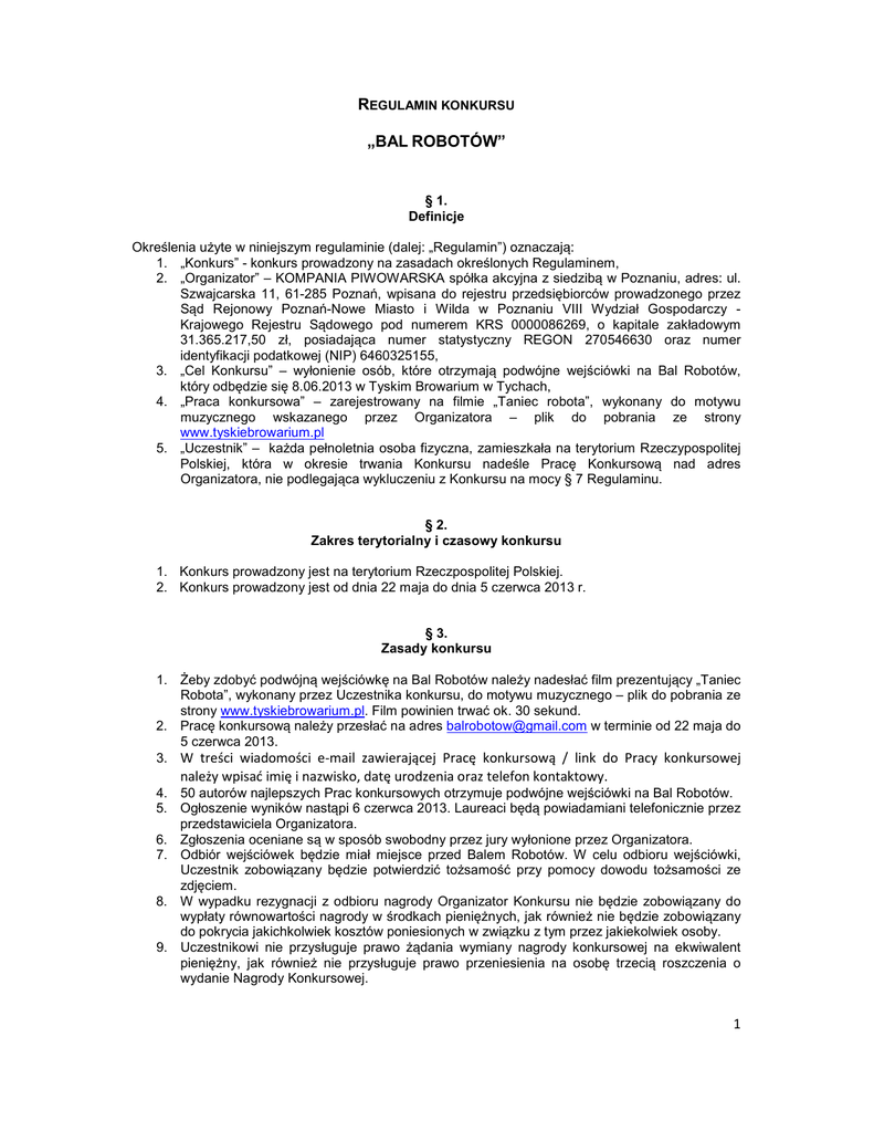REGULAMIN KONKURSU „BAL ROBOTÓW” § 1. Definicje Określenia użyte w niniejszym regulaminie (dalej: „Regulamin”) oznaczają: 1. „Konkurs” - konkurs prowadzony na zasadach określonych Regulaminem, 2. „Organizator” – KOMPANIA PIWOWARSKA spółka akcyjna z siedzibą w Poznaniu, adres: ul. Szwajcarska 11, 61-285 Poznań, wpisana do rejestru przedsiębiorców prowadzonego przez Sąd Rejonowy Poznań-Nowe Miasto i Wilda w Poznaniu VIII Wydział Gospodarczy Krajowego Rejestru Sądowego pod numerem KRS 0000086269, o kapitale zakładowym 31.365.217,50 zł, posiadająca numer statystyczny REGON 270546630 oraz numer identyfikacji podatkowej (NIP) 6460325155, 3. „Cel Konkursu” – wyłonienie osób, które otrzymają podwójne wejściówki na Bal Robotów, który odbędzie się 8.06.2013 w Tyskim Browarium w Tychach, 4. „Praca konkursowa” – zarejestrowany na filmie „Taniec robota”, wykonany do motywu muzycznego wskazanego przez Organizatora – plik do pobrania ze strony www.tyskiebrowarium.pl 5. „Uczestnik” – każda pełnoletnia osoba fizyczna, zamieszkała na terytorium Rzeczypospolitej Polskiej, która w okresie trwania Konkursu nadeśle Pracę Konkursową nad adres Organizatora, nie podlegająca wykluczeniu z Konkursu na mocy § 7 Regulaminu. § 2. Zakres terytorialny i czasowy konkursu 1. Konkurs prowadzony jest na terytorium Rzeczpospolitej Polskiej. 2. Konkurs prowadzony jest od dnia 22 maja do dnia 5 czerwca 2013 r. § 3. Zasady konkursu 1. Żeby zdobyć podwójną wejściówkę na Bal Robotów należy nadesłać film prezentujący „Taniec Robota”, wykonany przez Uczestnika konkursu, do motywu muzycznego – plik do pobrania ze strony www.tyskiebrowarium.pl. Film powinien trwać ok. 30 sekund. 2. Pracę konkursową należy przesłać na adres [email protected] w terminie od 22 maja do 5 czerwca 2013. 3. W treści wiadomości e-mail zawierającej Pracę konkursową / link do Pracy konkursowej należy wpisać imię i nazwisko, datę urodzenia oraz telefon kontaktowy. 4. 50 autorów najlepszych Prac konkursowych otrzymuje podwójne wejściówki na Bal Robotów. 5. Ogłoszenie wyników nastąpi 6 czerwca 2013. Laureaci będą powiadamiani telefonicznie przez przedstawiciela Organizatora. 6. Zgłoszenia oceniane są w sposób swobodny przez jury wyłonione przez Organizatora. 7. Odbiór wejściówek będzie miał miejsce przed Balem Robotów. W celu odbioru wejściówki, Uczestnik zobowiązany będzie potwierdzić tożsamość przy pomocy dowodu tożsamości ze zdjęciem. 8. W wypadku rezygnacji z odbioru nagrody Organizator Konkursu nie będzie zobowiązany do wypłaty równowartości nagrody w środkach pieniężnych, jak również nie będzie zobowiązany do pokrycia jakichkolwiek kosztów poniesionych w związku z tym przez jakiekolwiek osoby. 9. Uczestnikowi nie przysługuje prawo żądania wymiany nagrody konkursowej na ekwiwalent pieniężny, jak również nie przysługuje prawo przeniesienia na osobę trzecią roszczenia o wydanie Nagrody Konkursowej. 1 10. Uczestnicy, wysyłając pracę konkursową, wyrażają zgodę na wykorzystanie ich wizerunku przez Kompanię Piwowarską S.A. z siedzibą w Poznaniu w materiałach promocyjnych/informacyjnych przygotowywanych przez Kompanię Piwowarską S.A. lub podmiot działający na jej zlecenie na cele promocyjne, informacyjne, marketingu własnego i public relations związane z działalnością centrum wycieczkowego „Tyskiego Browarium” w browarze w Tychach. 11. Zgłoszenie Pracy Konkursowej jest równoznaczne z akceptacją niniejszego Regulaminu. § 4. Prawa autorskie 1. Uczestnik Konkursu, przesyłając Pracę konkursową Organizatorowi, ponosi pełną odpowiedzialność za to, że przysługują mu pełne i niczym nie ograniczone prawa autorskie do nadsyłanej Pracy konkursowej i że Praca Konkursowa (jej treść i forma) nie naruszają praw osób trzecich, zwłaszcza praw autorskich lub dóbr osobistych. 2. Zgodnie z art. 921 § 3 kodeksu cywilnego, na Organizatora przechodzą prawa autorskie majątkowe do Prac Konkursowych nagrodzonych Nagrodami Konkursowymi w zakresie wykorzystywania ich w działalności promocyjnej, marketingowej i public relations, na wszelkich dostępnych polach eksploatacji, w tym w szczególności w zakresie zamieszczania w internecie oraz w materiałach promocyjnych i reklamowych, jak również prawa do dokonywania ich skracania i innych modyfikacji, jak również prawa do wykonywanie praw zależnych do tych modyfikacji. § 5. Wykluczenia z uczestnictwa w Konkursie, Reklamacje 1. W Konkursie nie mogą brać udziału pracownicy Organizatora, członkowie ich rodzin (wstępni, zstępni, rodzeństwo, powinowaci), małżonkowie oraz osoby pozostające w stałym pożyciu. 2. Wszystkie reklamacje lub skargi ze strony Uczestników Konkursu powinny być składane w formie pisemnej najpóźniej w ciągu 7 dni do dnia wyłonienia zwycięzców na adres: Tyskie Browarium ul. Mikołowska 5 43-100 Tychy 3. Reklamacje lub skargi składane w formie pisemnej powinny zawierać: imię, nazwisko i dokładny adres Uczestnika Konkursu, numer telefonu kontaktowego, jak również dokładny opis podstaw reklamacji lub skargi oraz podpis Uczestnika Konkursu. 4. Po otrzymaniu reklamacji lub skargi, Komisja rozpatrzy ją w terminie 10 dni od daty otrzymania takiej reklamacji lub skargi. 5. Decyzja Komisji w przedmiocie reklamacji lub skargi jest ostateczna i wiążąca. § 6. Dane osobowe 1. Dane osobowe Uczestników Konkursu będą zbierane i przetwarzane zgodnie z ustawa z dnia 27 sierpnia 1997 r. o ochronie danych osobowych (tekst jednolity Dz. U. z 2002, Nr 101, poz. 926 z pózn. zm.). Uczestnicy maja prawo dostępu do treści swoich danych osobowych, jak również żądania ich poprawiania lub usunięcia. Podanie danych osobowych jest dobrowolne, jednakże konieczne do udziału w Konkursie. 2. Administratorem danych osobowych zebranych podczas niniejszego Konkursu jest - w rozumieniu wspomnianej
