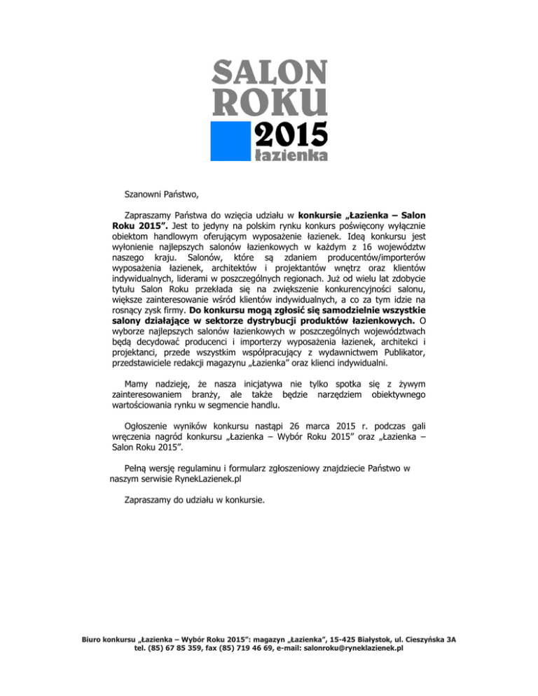 Szanowni Państwo, Zapraszamy Państwa do wzięcia udziału w konkursie „Łazienka – Salon Roku 2015”. Jest to jedyny na polskim rynku konkurs poświęcony wyłącznie obiektom handlowym oferującym wyposażenie łazienek. Ideą konkursu jest wyłonienie najlepszych salonów łazienkowych w każdym z 16 województw naszego kraju. Salonów, które są zdaniem producentów/importerów wyposażenia łazienek, architektów i projektantów wnętrz oraz klientów indywidualnych, liderami w poszczególnych regionach. Już od wielu lat zdobycie tytułu Salon Roku przekłada się na zwiększenie konkurencyjności salonu, większe zainteresowanie wśród klientów indywidualnych, a co za tym idzie na rosnący zysk firmy. Do konkursu mogą zgłosić się samodzielnie wszystkie salony działające w sektorze dystrybucji produktów łazienkowych. O wyborze najlepszych salonów łazienkowych w poszczególnych województwach będą decydować producenci i importerzy wyposażenia łazienek, architekci i projektanci, przede wszystkim współpracujący z wydawnictwem Publikator, przedstawiciele redakcji magazynu „Łazienka” oraz klienci indywidualni. Mamy nadzieję, że nasza inicjatywa nie tylko spotka się z żywym zainteresowaniem branży, ale także będzie narzędziem obiektywnego wartościowania rynku w segmencie handlu. Ogłoszenie wyników konkursu nastąpi 26 marca 2015 r. podczas gali wręczenia nagród konkursu „Łazienka – Wybór Roku 2015” oraz „Łazienka – Salon Roku 2015”. Pełną wersję regulaminu i formularz zgłoszeniowy znajdziecie Państwo w naszym serwisie RynekLazienek.pl Zapraszamy do udziału w konkursie. Biuro konkursu „Łazienka – Wybór Roku 2015”: magazyn „Łazienka”, 15-425 Białystok, ul. Cieszyńska 3A tel. (85) 67 85 359, fax (85) 719 46 69, e-mail: [email protected] REGULAMIN KONKURSU ŁAZIENKA – SALON ROKU 2015 I. CEL KONKURSU: – wyróżnienie oraz promocja podmiotów handlowych oferujących wyposażenie łazienek na rynku polskim – promowanie odpowiedzialności firm za formę sprzedaży i jakość oferowanych produktów Organizatorem konkursu „Łazienka – Salon Roku 2015” jest magazyn branżowy „Łazienka” wydawany przez Wydawnictwo Publikator w Białymstoku. II. PRZEBIEG KONKURSU: Konkurs odbywa się w terminie od grudnia 2014r. do 31 stycznia 2015r. Uczestnikami konkursu mogą być wszystkie firmy handlowe działające na polskim rynku w sektorze wyposażenia łazienkowego. Warunkiem udziału w konkursie jest przesłanie karty zgłoszeniowej danego salonu łazienkowego oraz uregulowanie opłaty konkursowej za dany salon w terminie do 31 stycznia 2015 r. Wysokość opłaty konkursowej określa rozdział III punkt 3 niniejszego regulaminu. Wybór laureatów w poszczególnych województwach odbywa się poprzez głosowanie producentów, importerów wyposażenia łazienek, przedstawicieli redakcji magazynu „Łazienka”, architektów i projektantów współpracujących z wydawnictwem Publikator oraz klientów indywidualnych – użytkowników portali internetowych Grupy Publikator. Laureatem zostanie ten salon, który zgromadzi największą liczbę punktów w danym województwie. W głosowaniu brane są pod uwagę następujące kryteria: – szerokość i zróżnicowanie oferty dostępnej w salonie, – szybkość realizacji zamówienia, – fachowość obsługi, – jakość i wygląd ekspozycji. Rozstrzygniecie konkursu i wręczenie tytułów „Łazienka – Salon Roku 2015” nastąpi 26 marca 2015 r. O miejscu uroczystości zwycięzcy konkursu zostaną powiadomieni najpóźniej w marcu 2015 r. III. ZASADY KONKURSU: 1. Przedmiotem konkursu są podmioty handlowe oferujące wyposażenie łazienek w poszczególnych 16 województwach Polski. 2. Jako jedno zgłoszenie traktowane jest zgłoszenie jednego salonu łazienkowego o określonej lokalizacji w danym województwie. 3. Zgłoszenie salonu do konkursu odbywa się poprzez nadesłanie do Biura konkursu „Łazienka – Wybór Roku 2015” w terminie do 31 stycznia 2015 r. wypełnionej Karty Rejestracyjnej* wraz z dokumentacją Biuro konkursu „Łazienka – Wybór Roku 2015”: magazyn „Łazienka”, 15-425 Białystok, ul. Cieszyńska 3A tel. (85) 67 85 359, fax (85) 719 46 69, e-mail: [email protected] (materiał ilustracyjny – maks. 5 zdjęć salonu, ogólną charakterystyką oferowanych produktów) oraz potwierdzenia wpłaty z tytułu zgłoszenia do konkursu w wysokości: - przy zgłoszeniu jednego salonu – 500 zł netto - przy zgłoszeniu dwóch salonów – 800 zł netto - przy zgłoszeniu trzech salonów – 1 200 zł netto - przy zgłoszeniu powyżej trzech salonów – każde kolejne zgłoszenie 200 zł netto Opłata konkursowa nie podlega zwrotowi w przypadku wycofania się Zgłaszającego z Konkursu, na każdym jego etapie. Opłata konkursowa obejmuje koszty i korzyści wynikające z uczestnictwa zawarte w Regulaminie Konkursu: - prezentację zwycięskich salonów w katalogu konkursowym (każdy zwycięski salon na całej stronie) oraz informację o zwycięskich salonach w relacji z gali wręczenia nagród, która zostanie zamieszczona na łamach nr 2/2015 Łazienki - prezentację oraz promocję wszystkich zgłoszonych podmiotów handlowych na portalu www.ryneklazienek.pl 4. Salony łazienkowe zgłaszające się do konkursu zobowiązują się dostarczyć do 31 stycznia 2015 r. materiały ilustracyjne niezbędne do prezentacji salonu w Internecie i katalogu konkursowym (fotografie – min. wymiary 10x15 cm, pliki elektroniczne – tiff, jpg, eps; rozdzielczość min. 300 dpi przy podstawie min. 10 cm). 5. Nadesłane zdjęcia będą wykorzystane w materiałach promocyjnych Konkursu na co Zgłaszający wyraża zgodę. Każdorazowe wykorzystanie zdjęć będzie nieodpłatne. 6. Po przesłaniu Karty Rejestracyjnej na adres Biura konkursu, Zgłaszający wnosi do 31 stycznia 2015 r. opłatę konkursową, której wysokość została określona w rozdziale III, punk