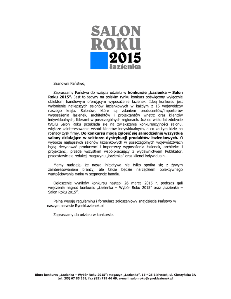 regulamin konkursu "Łazienka - Salon Roku 2015"