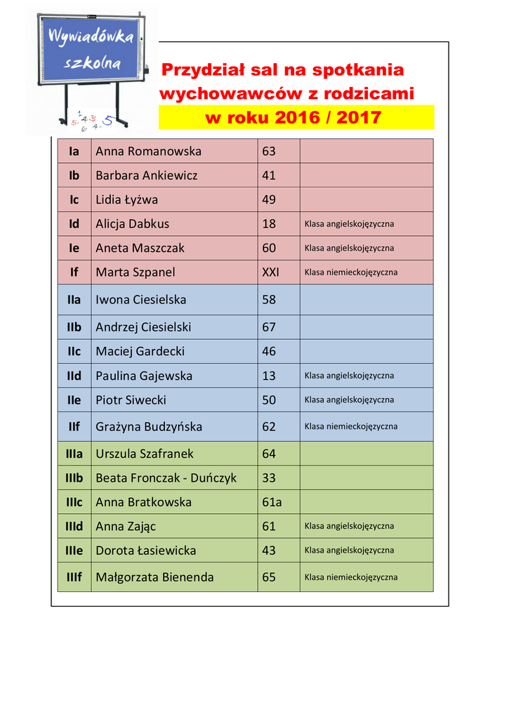 Przydział sal na spotkania wychowawców z rodzicami w roku 2016 / 2017 Ia Anna Romanowska 63 Ib Barbara Ankiewicz 41 Ic Lidia Łyżwa 49 Id Alicja Dabkus 18 Klasa angielskojęzyczna Ie Aneta Maszczak 60 Klasa angielskojęzyczna If Marta Szpanel XXI Klasa niemieckojęzyczna IIa Iwona Ciesielska 58 IIb Andrzej Ciesielski 67 IIc Maciej Gardecki 46 IId Paulina Gajewska 13 Klasa angielskojęzyczna IIe Piotr Siwecki 50 Klasa angielskojęzyczna IIf Grażyna Budzyńska 62 Klasa niemieckojęzyczna IIIa Urszula Szafranek 64 IIIb Beata Fronczak - Duńczyk 33 IIIc Anna Bratkowska 61a IIId Anna Zając 61 Klasa angielskojęzyczna IIIe Dorota Łasiewicka 43 Klasa angielskojęzyczna IIIf 65 Klasa niemieckojęzyczna Małgorzata Bienenda