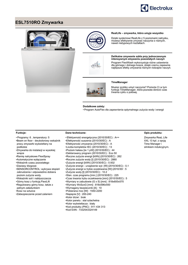ESL7510RO Zmywarka RealLife – zmywarka, która umyje wszystko Dzieki systemowi RealLife z 5 poziomami natrysku, możesz efektywnie zmywać naczynia o różnych, nawet nietypowych kształtach. Delikatne zmywanie szkła przy jednoczesnym intensywnym zmywaniu pozostałych naczyń Program FlexiWash wykorzystuje różne ustawienia dla górnego i dolnego kosza, dzięki czemu zapewnia najlepsze efekty zmywania różnych rodzajów naczyń. TimeManager Musisz szybko umyć naczynia? Pomoże Ci w tym funkcja TimeManager, która pozwala skrócić czas trwania cyklu o połowę. Dodatkowe zalety: • Program AutoFlex dla zapewnienia optymalnego zużycia wody i energii Funkcje: Dane techniczne: Opis produktu: • Programy: 6 , temperatury: 5 •Beam on floor - dwukolorowy wskaźnik pracy zmywarki wyświetlany na podłodze •Zmywarka do instalacji w wysokiej wnęce •Ramię natryskowe FlexiSpray •Automatyczne wyłączanie •Wskaźnik czasu pozostałego •Zawiasy ślizgowe •SENSORCONTROL: wykrywa stopień zabrudzenia i odpowiednio dobiera poziom zużycia wody. •Wskaźniki soli i nabłyszczacza •Górny kosz z funkcją FlexiLift •Regulowany górny kosz, także z pełnym załadunkiem •Kosz na sztućce •Zabezpieczenie przed zalaniem • Efektywność energetyczna (2010/30/EC) : A++ •Efektywność suszenia (2010/30/EC) : A •Efektywność zmywania (2010/30/EC) : A •Liczba kompletów IEC (2010/30/EC) : 13 •Poziom hałasu [re 1 pW] (2010/30/EC) : 44 •Deklarowany program (2010/30/EC) : Eco 50 •Roczne zużycie energii [kWh] (2010/30/EC) : 262 •Roczne zużycie wody [l] (2010/30/EC) : 2860 •Zużycie energii [kWh] (2010/30/EC) : 0.932 •Zużycie energii - urządzenie wył. [W] (2010/30/EC) : 0,1 •Zużycie energii w trybie oczekiwania [W] (2010/30/ : 5 •Zużycie wody [l] (2010/30/EC) : 10.2 •Stan. czas programu [min.] (2010/30/EC) : 225 •Czas trwania trybu oczekiwania [min] (2010/30/EC) : 5 •Wymiary w zabudowie (G x S) [mm] : 818x600x570 •Wymiary WxSzxG [mm] : 818x596x550 •Wymagany bezpiecznik [A] : 10 •Pobierana moc [W] : 1550-2200 •Napięcie [V] : 200-240 •Kolor drzwi : brak •Kolor panelu : stal szlachetna •Kolor wyświetlacza : biały •Kod produktu (PNC) : 911 434 313 •Kod EAN : 7332543324149 Zmywarka ReaL Life XXL 13 kpl. z opcją Time Manager i silnikiem indukcyjnym. ESL7510RO Zmywarka