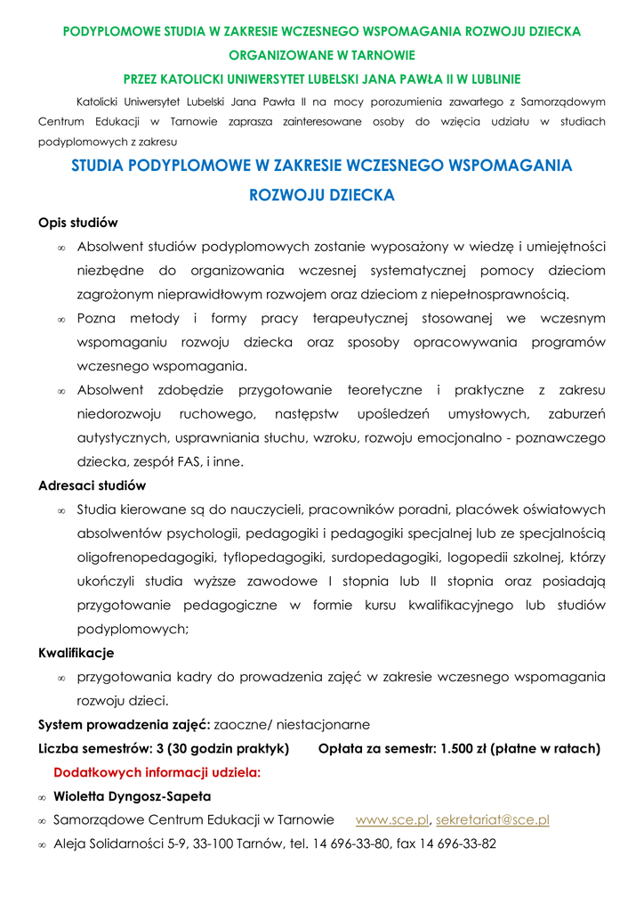 PODYPLOMOWE STUDIA W ZAKRESIE WCZESNEGO WSPOMAGANIA ROZWOJU DZIECKA ORGANIZOWANE W TARNOWIE PRZEZ KATOLICKI UNIWERSYTET LUBELSKI JANA PAWŁA II W LUBLINIE Katolicki Uniwersytet Lubelski Jana Pawła II na mocy porozumienia zawartego z Samorządowym Centrum Edukacji w Tarnowie zaprasza zainteresowane osoby do wzięcia udziału w studiach podyplomowych z zakresu STUDIA PODYPLOMOWE W ZAKRESIE WCZESNEGO WSPOMAGANIA ROZWOJU DZIECKA Opis studiów • Absolwent studiów podyplomowych zostanie wyposażony w wiedzę i umiejętności niezbędne do organizowania wczesnej systematycznej pomocy dzieciom zagrożonym nieprawidłowym rozwojem oraz dzieciom z niepełnosprawnością. • Pozna metody wspomaganiu i formy rozwoju pracy dziecka terapeutycznej oraz sposoby stosowanej we opracowywania wczesnym programów wczesnego wspomagania. • Absolwent zdobędzie niedorozwoju przygotowanie ruchowego, następstw teoretyczne upośledzeń i praktyczne umysłowych, z zakresu zaburzeń autystycznych, usprawniania słuchu, wzroku, rozwoju emocjonalno - poznawczego dziecka, zespół FAS, i inne. Adresaci studiów • Studia kierowane są do nauczycieli, pracowników poradni, placówek oświatowych absolwentów psychologii, pedagogiki i pedagogiki specjalnej lub ze specjalnością oligofrenopedagogiki, tyflopedagogiki, surdopedagogiki, logopedii szkolnej, którzy ukończyli studia wyższe zawodowe I stopnia lub II stopnia oraz posiadają przygotowanie pedagogiczne w formie kursu kwalifikacyjnego lub studiów podyplomowych; Kwalifikacje • przygotowania kadry do prowadzenia zajęć w zakresie wczesnego wspomagania rozwoju dzieci. System prowadzenia zajęć: zaoczne/ niestacjonarne Liczba semestrów: 3 (30 godzin praktyk) Opłata za semestr: 1.500 zł (płatne w ratach) Dodatkowych informacji udziela: • Wioletta Dyngosz-Sapeta • Samorządowe Centrum Edukacji w Tarnowie • Aleja Solidarności 5-9, 33-100 Tarnów, tel. 14 696-33-80, fax 14 696-33-82 www.sce.pl, [email protected]
