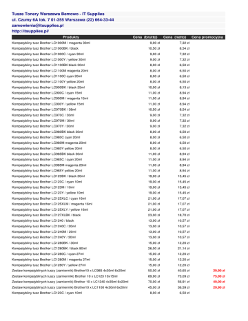 Tusze Tonery Warszawa Bemowo - IT Supplies ul. Czumy 6A lok. 7 01-355 Warszawa (22) 664-33-44 [email protected] http://itsupplies.pl/ Produkty Kompatybilny tusz Brother LC1000M / magenta 30ml Cena (brutto) Cena (netto) Cena promocyjna 9,00 zł 7,32 zł 10,50 zł 8,54 zł Kompatybilny tusz Brother LC1000C / cyan 30ml 9,00 zł 7,32 zł Kompatybilny tusz Brother LC1000Y / yellow 30ml 9,00 zł 7,32 zł Kompatybilny tusz Brother LC1100BK black 30ml 8,00 zł 6,50 zł Kompatybilny tusz Brother LC1100M magenta 20ml 8,00 zł 6,50 zł Kompatybilny tusz Brother LC1100C cyan 20ml 8,00 zł 6,50 zł Kompatybilny tusz Brother LC1100Y yellow 20ml 8,00 zł 6,50 zł Kompatybilny tusz Brother LC900BK / black 25ml 10,00 zł 8,13 zł Kompatybilny tusz Brother LC900C / cyan 15ml 11,00 zł 8,94 zł Kompatybilny tusz Brother LC900M / magenta 15ml 11,00 zł 8,94 zł Kompatybilny tusz Brother LC900Y / yellow 15ml 11,00 zł 8,94 zł Kompatybilny tusz Brother LC970BK / 38ml 10,50 zł 8,54 zł Kompatybilny tusz Brother LC970C / 30ml 9,00 zł 7,32 zł Kompatybilny tusz Brother LC970M / 30ml 9,00 zł 7,32 zł Kompatybilny tusz Brother LC970Y / 30ml 9,00 zł 7,32 zł Kompatybilny tusz Brother LC980BK black 30ml 8,00 zł 6,50 zł Kompatybilny tusz Brother LC980C cyan 20ml 8,00 zł 6,50 zł Kompatybilny tusz Brother LC980M magenta 20ml 8,00 zł 6,50 zł Kompatybilny tusz Brother LC980Y yellow 20ml 8,00 zł 6,50 zł Kompatybilny tusz Brother LC985BK black 30ml 11,00 zł 8,94 zł Kompatybilny tusz Brother LC985C / cyan 20ml 11,00 zł 8,94 zł Kompatybilny tusz Brother LC985M magenta 20ml 11,00 zł 8,94 zł Kompatybilny tusz Brother LC985Y yellow 20ml 11,00 zł 8,94 zł Kompatybilny tusz Brother LC123BK / black 20ml 19,00 zł 15,45 zł Kompatybilny tusz Brother LC123C / cyan 10ml 19,00 zł 15,45 zł Kompatybilny tusz Brother LC123M / 10ml 19,00 zł 15,45 zł Kompatybilny tusz Brother LC123Y / yellow 10ml 19,00 zł 15,45 zł Kompatybilny tusz Brother LC125XLC / cyan 16ml 21,00 zł 17,07 zł Kompatybilny tusz Brother LC125XLM / magenta 16ml 21,00 zł 17,07 zł Kompatybilny tusz Brother LC125XLY / yellow 16ml 21,00 zł 17,07 zł Kompatybilny tusz Brother LC127XLBK / black 23,00 zł 18,70 zł Kompatybilny tusz Brother LC1240 / black 13,00 zł 10,57 zł Kompatybilny tusz Brother LC1240C / 20ml 13,00 zł 10,57 zł Kompatybilny tusz Brother LC1240M / 20ml 13,00 zł 10,57 zł Kompatybilny tusz Brother LC1240Y / 20ml 13,00 zł 10,57 zł Kompatybilny tusz Brother LC1280BK / 30ml 15,00 zł 12,20 zł Kompatybilny tusz Brother LC1280BK / black 80ml 26,00 zł 21,14 zł Kompatybilny tusz Brother LC1280C / cyan 27ml 15,00 zł 12,20 zł Kompatybilny tusz Brother LC1280M / magenta 27ml 15,00 zł 12,20 zł Kompatybilny tusz Brother LC1280Y / yellow 27ml 15,00 zł 12,20 zł Zestaw kompatybilnych tuszy (zamiennik) Brother10 x LC985 4x30ml 6x20ml 50,00 zł 40,65 zł 29,90 zł Zestaw kompatybilnych tuszy (zamienniki) Brother 10 x LC123 10x15ml 89,90 zł 73,09 zł 75,00 zł Zestaw kompatybilnych tuszy (zamiennik) Brother 10 x LC1240 4x35ml 6x20ml 70,00 zł 56,91 zł 49,00 zł Zestaw kompatybilnych tuszy (zamiennik) Brother10 x LC1100 4x30ml 6x20ml 45,00 zł 36,59 zł 29,90 zł Kompatybilny tusz Brother LC1000BK / black Kompatybilny tusz Brother LC123C / cyan 10ml 8,00 zł 6,50 zł Kompatybilny tusz Brother LC123M / magenta 10ml 8,00 zł 6,50 zł Kompatybilny tusz Brother LC123Y / yellow 10ml 8,00 zł 6,50 zł Kompatybilny tusz Brother LC1240C cyan 20ml 7,00 zł 5,69 zł Kompatybilny tusz Brother LC1240M magenta 20ml 7,00 zł 5,69 zł Kompatybilny tusz Brother LC1240Y yellow 20ml 7,00 zł 5,69 zł Kompatybilny tusz Brother LC1100C cyan 20ml 4,50 zł 3,66 zł Kompatybilny tusz Brother LC1100M magenta 20ml 4,50 zł 3,66 zł Kompatybilny tusz Brother LC1100Y yellow 20ml 4,50 zł 3,66 zł Kompatybilny tusz Brother LC980C cyan 20ml 4,50 zł 3,66 zł Kompatybilny tusz Brother LC980M magenta 20ml 4,50 zł 3,66 zł Kompatybilny tusz Brother LC980Y yellow 20ml 4,50 zł 3,66 zł Kompatybilny tusz Brother LC985C / cyan 20ml 5,00 zł 4,07 zł Kompatybilny tusz Brother LC985M magenta 20ml 5,00 zł 4,07 zł Kompatybilny tusz Brother LC985Y yellow 20ml 5,00 zł 4,07 zł Kompatybilny tusz Brother LC125XLC / cyan 16ml 8,00 zł 6,50 zł Kompatybilny tusz Brother LC125XLM / magenta 16ml 8,00 zł 6,50 zł Kompatybilny tusz Brother LC125XLY / yellow 16ml 8,00 zł 6,50 zł Kompatybilny tusz Brother LC1100BK black 30ml 4,50 zł 3,66 zł Kompatybilny tusz Brother LC980BK black 30ml 4,50 zł 3,66 zł Kompatybilny tusz Brother LC985BK black 30ml 5,00 zł 4,07 zł Kompatybilny tusz Brother LC123BK / black 20ml 8,00 zł 6,50 zł Kompatybilny tusz Brother LC1240BK black 30ml 7,00 zł 5,69 zł Kompatybilny tusz Brother LC970C / cyan 30ml 4,50 zł 3,66 zł Kompatybilny tusz Brother LC970M / magenta 30ml 4,50 zł 3,66 zł Kompatybilny tusz Brother LC970Y / yellow 30ml 4,50 zł 3,66 zł Kompatybilny tusz Brother LC970BK / black 38ml 4,50 zł 3,66 zł Kompatybilny tusz Brother LC1000C / cyan 30ml 4,50 zł 3,66 zł Kompatybilny tusz Brother LC1000M / magenta 30ml 4,50 zł 3,66 zł Kompatybilny tusz Brother LC1000Y / yellow 30ml 4,50 zł 3,66 zł Kompatybilny tusz Brother LC1000BK / black 38ml 4,50 zł 3,66 zł Kompatybilny tusz Brother LC900BK black 25ml 7,00 zł 5,69 zł Kompatybilny tusz Brother LC900C cyan 15ml 7,00 zł 5,69 zł Kompatybilny tusz Brother LC900M magenta 15ml 7,00 zł 5,69 zł Kompatybilny tusz Brother LC900Y yellow 15ml 7,00 zł 5,69 zł Kompatybilny tusz Brother LC1280BK black 30ml 7,00 zł 5,69 zł Kompatybilny tusz Brother LC1280C cyan 27ml 7,00 zł 5,69 zł Kompatybilny tusz Brother LC1280M magenta 27ml 7,00 zł 5,69 zł Kompatybilny tusz Brother LC1280Y yellow 27ml 7,00 zł 5,69 zł Kompatybilny tusz Brother LC121BK / black 20ml 8,00 zł 6,50 zł Kompatybilny tusz Brother LC121C / cyan 10ml 8,00 zł 6,50 zł Kompatybilny tusz Brother LC121M / magenta 10ml 8,00 zł 6,50 zł Kompatybilny tusz Brother LC121Y / yellow 10ml 8,00 zł 6,50 zł Kompatybilny tusz Brot