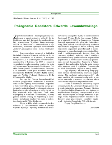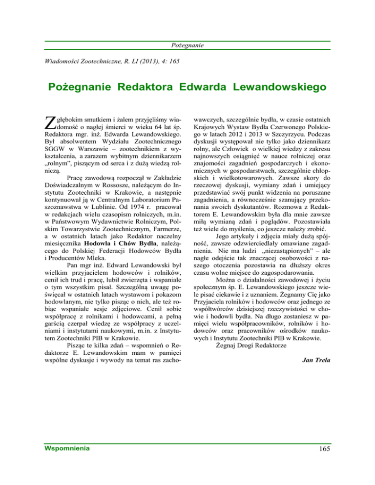 Pożegnanie Wiadomości Zootechniczne, R. LI (2013), 4: 165 Pożegnanie Redaktora Edwarda Lewandowskiego Z głębokim smutkiem i żalem przyjęliśmy wiadomość o nagłej śmierci w wieku 64 lat śp. Redaktora mgr. inż. Edwarda Lewandowskiego. Był absolwentem Wydziału Zootechnicznego SGGW w Warszawie – zootechnikiem z wykształcenia, a zarazem wybitnym dziennikarzem „rolnym”, piszącym od serca i z dużą wiedzą rolniczą. Pracę zawodową rozpoczął w Zakładzie Doświadczalnym w Rossosze, należącym do Instytutu Zootechniki w Krakowie, a następnie kontynuował ją w Centralnym Laboratorium Paszoznawstwa w Lublinie. Od 1974 r. pracował w redakcjach wielu czasopism rolniczych, m.in. w Państwowym Wydawnictwie Rolniczym, Polskim Towarzystwie Zootechnicznym, Farmerze, a w ostatnich latach jako Redaktor naczelny miesięcznika Hodowla i Chów Bydła, należącego do Polskiej Federacji Hodowców Bydła i Producentów Mleka. Pan mgr inż. Edward Lewandowski był wielkim przyjacielem hodowców i rolników, cenił ich trud i pracę, lubił zwierzęta i wspaniale o tym wszystkim pisał. Szczególną uwagę poświęcał w ostatnich latach wystawom i pokazom hodowlanym, nie tylko pisząc o nich, ale też robiąc wspaniałe sesje zdjęciowe. Cenił sobie współpracę z rolnikami i hodowcami, a pełną garścią czerpał wiedzę ze współpracy z uczelniami i instytutami naukowymi, m.in. z Instytutem Zootechniki PIB w Krakowie. Pisząc te kilka zdań – wspomnień o Redaktorze E. Lewandowskim mam w pamięci wspólne dyskusje i wywody na temat ras zacho- Wspomnienia wawczych, szczególnie bydła, w czasie ostatnich Krajowych Wystaw Bydła Czerwonego Polskiego w latach 2012 i 2013 w Szczyrzycu. Podczas dyskusji występował nie tylko jako dziennikarz rolny, ale Człowiek o wielkiej wiedzy z zakresu najnowszych osiągnięć w nauce rolniczej oraz znajomości zagadnień gospodarczych i ekonomicznych w gospodarstwach, szczególnie chłopskich i wielkotowarowych. Zawsze skory do rzeczowej dyskusji, wymiany zdań i umiejący przedstawiać swój punkt widzenia na poruszane zagadnienia, a równocześnie szanujący przekonania swoich dyskutantów. Rozmowa z Redaktorem E. Lewandowskim była dla mnie zawsze miłą wymianą zdań i poglądów. Pozostawiała też wiele do myślenia, co jeszcze należy zrobić. Jego artykuły i zdjęcia miały dużą spójność, zawsze odzwierciedlały omawiane zagadnienia. Nie ma ludzi „niezastąpionych” – ale nagłe odejście tak znaczącej osobowości z naszego otoczenia pozostawia na dłuższy okres czasu wolne miejsce do zagospodarowania. Można o działalności zawodowej i życiu społecznym śp. E. Lewandowskiego jeszcze wiele pisać ciekawie i z uznaniem. Żegnamy Cię jako Przyjaciela rolników i hodowców oraz jednego ze współtwórców dzisiejszej rzeczywistości w chowie i hodowli bydła. Na długo zostaniesz w pamięci wielu współpracowników, rolników i hodowców oraz pracowników ośrodków naukowych i Instytutu Zootechniki PIB w Krakowie. Żegnaj Drogi Redaktorze Jan Trela 165
