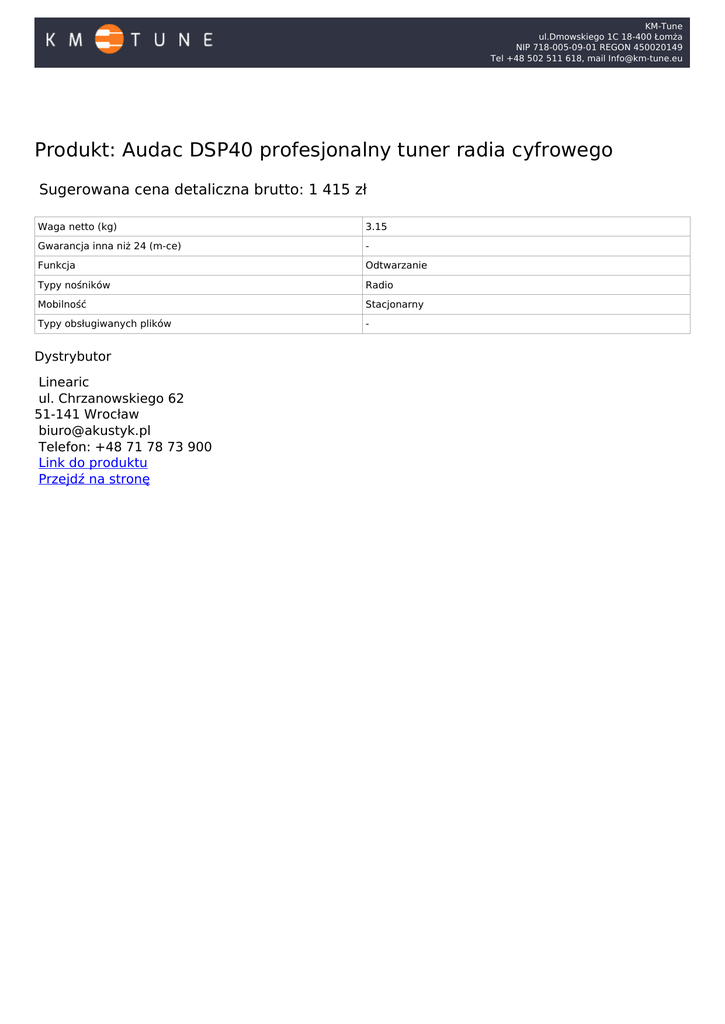 KM-Tune ul.Dmowskiego 1C 18-400 Łomża NIP 718-005-09-01 REGON 450020149 Tel +48 502 511 618, mail [email protected] Produkt: Audac DSP40 profesjonalny tuner radia cyfrowego Sugerowana cena detaliczna brutto: 1 415 zł Waga netto (kg) 3.15 Gwarancja inna niż 24 (m-ce) - Funkcja Odtwarzanie Typy nośników Radio Mobilność Stacjonarny Typy obsługiwanych plików - o Dystrybutor Linearic ul. Chrzanowskiego 62 51-141 Wrocław [email protected] Telefon: +48 71 78 73 900 Link do produktu Przejdź na stronę Powered by TCPDF (www.tcpdf.org)