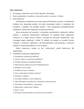 Opis seminarium 1. Prowadzący seminarium: prof. dr hab. Bogusław Nierenberg 2. Nazwa seminarium: zarządzanie, ekonomika mediów; promocja i reklama 3. Zarys badawczy: Przedmiotem seminarium jest szeroko pojęta problematyka związana z zarządzaniem mediami oraz ekonomiką mediów, ale także instytucjami kultury w kontekście ich związków z mediami. Na przykład metody i style zarządzania przedsiębiorstwami medialnymi; zasobu tych organizacji; kwestia przywództwa. Istotą seminarium jest poznanie i zrozumienie mechanizmów rządzących rynkiem mediów, a zwłaszcza organizacjami medialnymi. W ostatnich latach organizacje, zwłaszcza te z kręgu nowych mediów, rozwijają się niezwykle dynamicznie, więc wymagają ciągłej eksploracji i badań. W obrębie tej tematyki są wszelkie kwestie związane z „rozmową” organizacji z ich interesariuszami, czyli promocja, a zwłaszcza reklama i rozmaite pola badawcze z tym związane. Zakres tematyczny wydaje się być „wdzięcznym” polem badawczym dla magistrantów. 4. Przykładowe tytuły prac magisterskich: Zarządzanie organizacją medialną Zasoby osobowe organizacji medialnych Podstawy finansowe działania mediów Ekonomiczne aspekty procesów komunikacyjnych Reklama a nowe media Środki perswazji w reklamie Nowe media jako narzędzie promocji Promocja i reklama Percepcja reklamy a wzorce kulturowe Afera Watergate; jej polityczne i ekonomiczne konsekwencje Zarządzanie komunikacją w organizacji Skuteczność i efektywność reklamy Życie w sieci Promocja instytucji kultury za pomocą nowych mediów